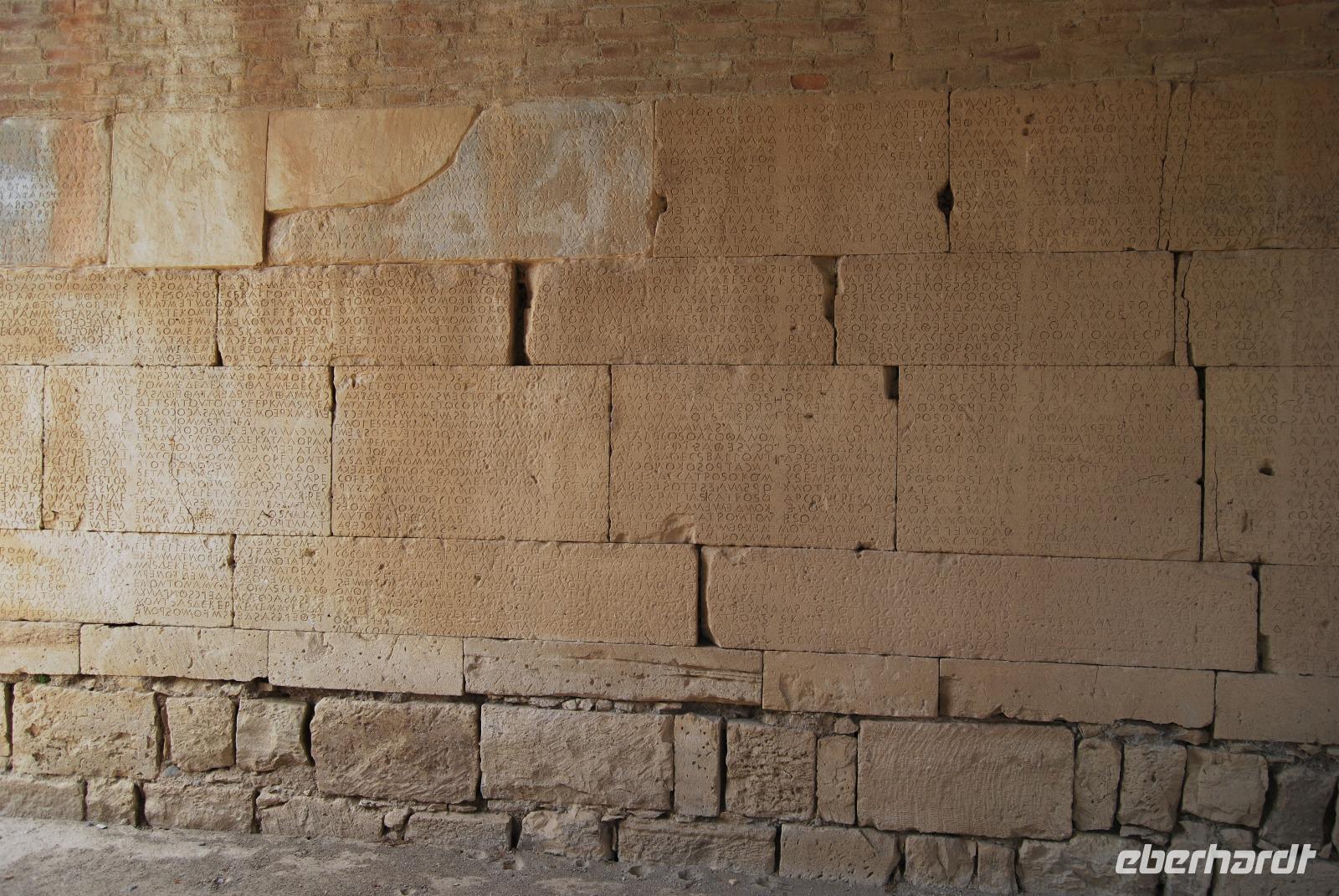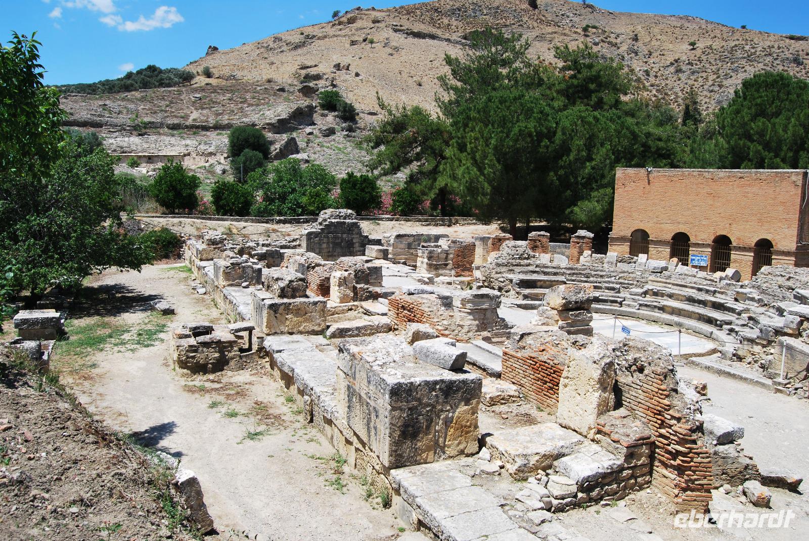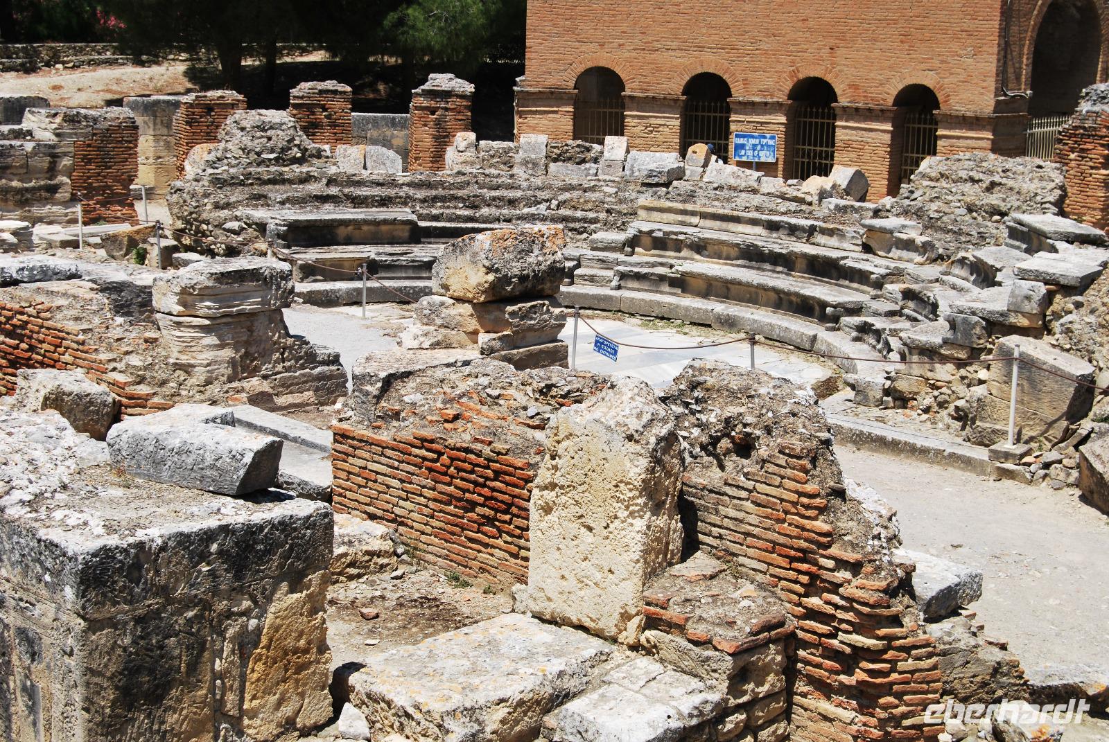 Nach unserer ersten kretanischen Wanderung fuhren wir nach Gortys. Dort besichtigten wir die Ruinen der Titus-Basilkia, die 600 nach Christus auf Ruinen erbaut wurde und damit als jüngstes Element der Stadt gilt. Aber eines der Höhepunkte dieser Stätte war definitiv die Große Inschrift von Gortyn - ein Gesetzeskodex aus dem 5. Jahrhundert vor Christus. Der Kodex befindet sich direkt hinter den Ruinen des Amphitheaters. Der bislang älteste Gesetzescodex Europas wurde abwechselnd von links nach rechts und rechts nach links geschrieben und gibt uns Informationen über das Gemeinleben der Dorer. Jene Volksgruppe die als Urgriechen gilt und die sich zunehmend im 8. Jahrhundert auf die Insel drängten und die friedlicheren „Kretaner", also Minoer, in die Berge zurückdrängten.