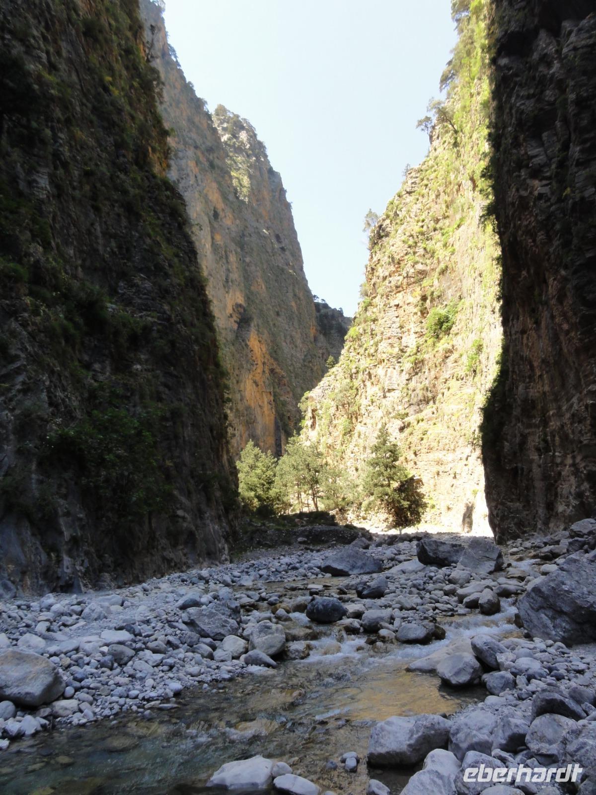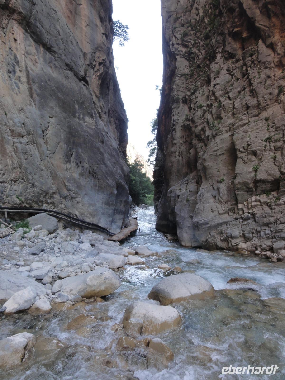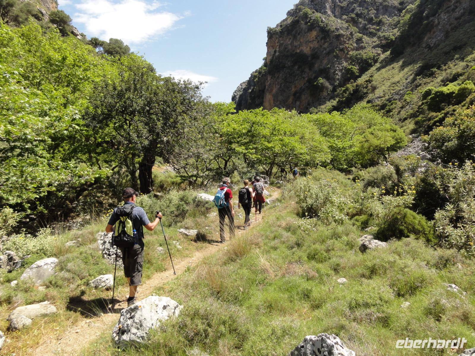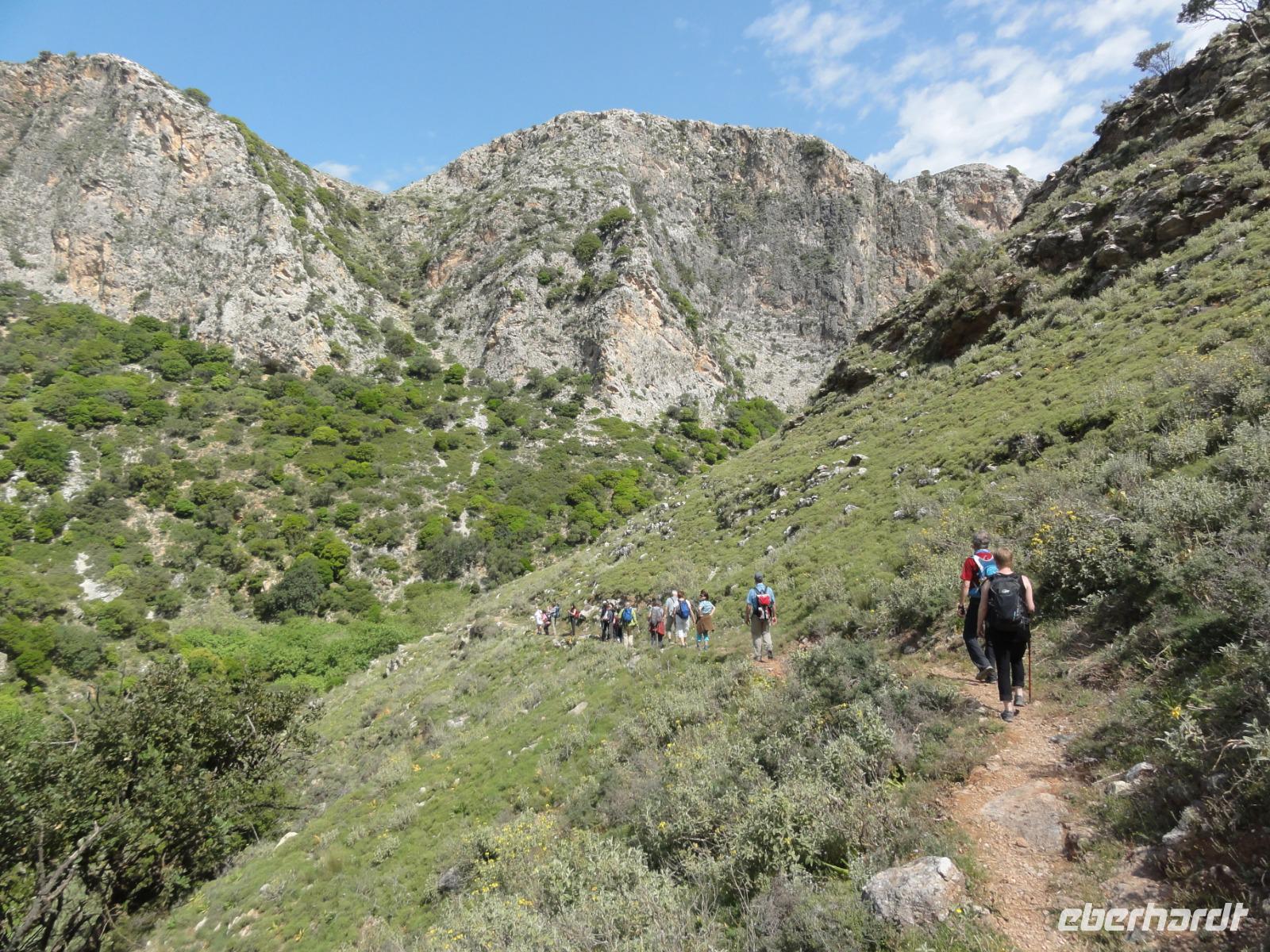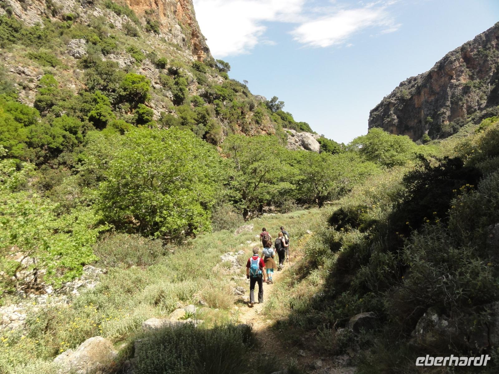 Kalimèra... Heute steht die erste Wanderung auf dem Programm, die Imbros Schlucht 700 m tief und 8 km lang. Nach dem Frühstück begrüße ich unsere Gäste aus Hamburg und Frankfurt. Mit unserem Busfahrer Nektarios fahren wir 9.00 Uhr vom Hotel Vantaris Beach zum Dorf Imbros, wo sich auch der Eingang in die Schlucht befindet. Noch schnell ein paar Fotos vor dem Eingang und schon steigen wir 10.00 Uhr die Stufen hinunter in die Imbros Schlucht. Den Eintritt übernimmt heute Eberhardt TRAVEL, aber wir müssen einen Abschnitt der Eintrittskarte gut aufheben für den Checkpoint am Ende der Schlucht, zur Kontrolle, dass auch wirklich jeder die Schlucht vor der Nacht unversehrt verlässt. Vorbei an Brandkraut, falscher Salbei und Drachenbaum erreichen wir nach 4 km eine kleine Hütte mit einem Wächter und machen unsere Pause. Nach der Halbzeit kommen wir zur engsten Stelle 1,60 m. Im Flussbett entlang genießen wir die Ruhe, die verschiedenen Pflanzenarten und den atemberaubenden Blick die Schlucht hinauf. Wahnsinn, was für ein Anblick... 13.00 Uhr erreichen wir das Ende der Schlucht und geben unseren Abschnitt der Eintrittskarte am Checkpoint ab. Direkt am Ausgang befindet sich eine Taverne mit Blick auf das Meer, und wir lassen es uns nicht nehmen nach der Wanderung einzukehren um zu speisen und ein kühles Getränk zu uns zunehmen. Danach fahren wir zurück zum Hotel und entspannen bei einer gratis Massage oder auf der Sonnenliege am Meer, bevor wir vor dem Abendessen vom Hotelmanager persönlich begrüßt werden. Nach dem Welcome Drink und einer kurzen Vorstellungsrunde dürfen wir uns am reichhaltigen Buffet bedienen und füllen unseren Kalorienbedarf wieder auf, ha ha ha...