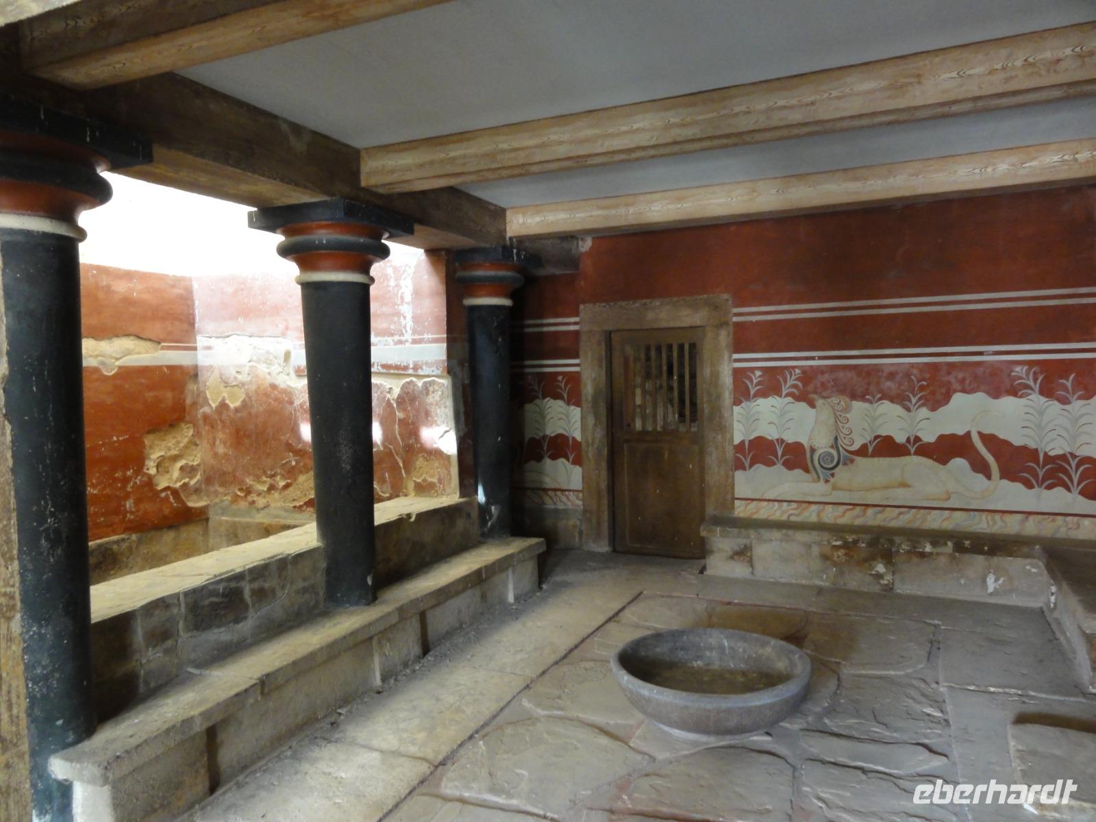 Heute steht Kultur auf dem Programm und das Wetter meint es gut mit uns. Es ist etwas bewölkt und nicht ganz so heiß. Perfekt für eine Besichtigung von Knossos. Nach dem Frühstück erreichen wir nach einer halben Stunde Busfahrt, mit unserem neuen Busfahrer Michalious, die Ausgrabungsstätte von Knossos. Es ist schon bewundernswert, was die Minor vor 4000 Jahren vor Chr. geschaffen hatten. Der Palast von Knossos hatte 1400 Räume und eine Fläche von 22.000 qm. Wahnsinn... Da fällt mir ein Witz ein, kennt ihr einen Satz mit Wahnsinn und Unsinn? Wahnsinn schon mal bei Unsinn Garten! Ha ha ha... Nach der Besichtigung von Knossos fahren wir zum Weingut nach Pesa. Im Weinanbaugebiet Pesa steht der älteste Weinberg Europas. Nach einer kurzen Filmvorführung verkosten wir 5 Weine der Region und naschen nebenbei Kräuter- und Käsetaschen sowie Brot mit Tomate und Oliven. Köstlich... Noch schnell im Shop etwas Olivenöl und Tymianhonig für die Daheimgeblieben gekauft, fahren wir im Anschluss in die Hauptstadt Kretas, Heraklion, der 4 größten Stadt Griechenlands. Wie schon erwähnt wurde Heraklion im 2. Weltkrieg fast vollständig zerstört. Kiki führt uns durch die Stadt, am Löwenbrunnen vorbei bis hin zum Venezianischen Hafen. Ab hier kann jeder selbst seinen Belangen nachgehen und wir treffen uns alle wieder am Bus. Zurück im Hotel wartet ein leckeres Abendbuffet auf uns.