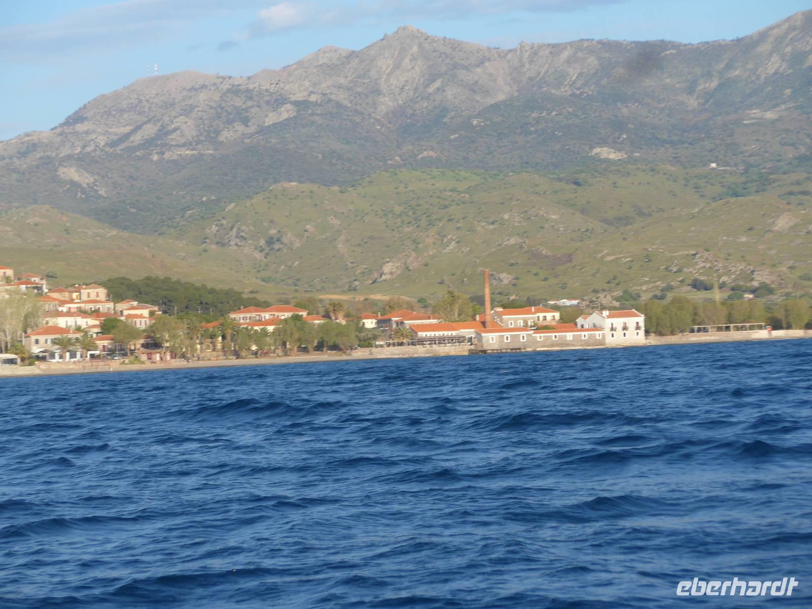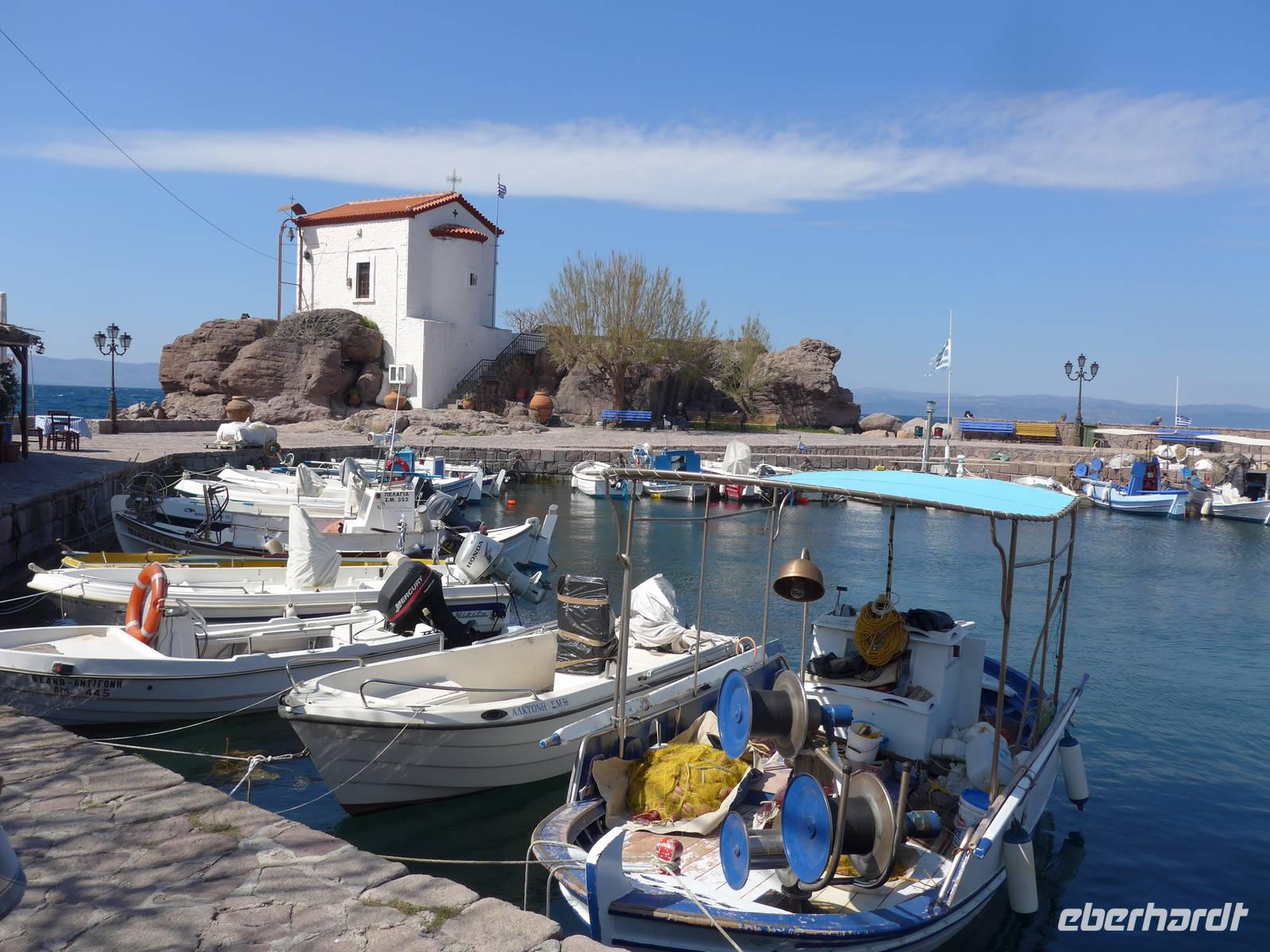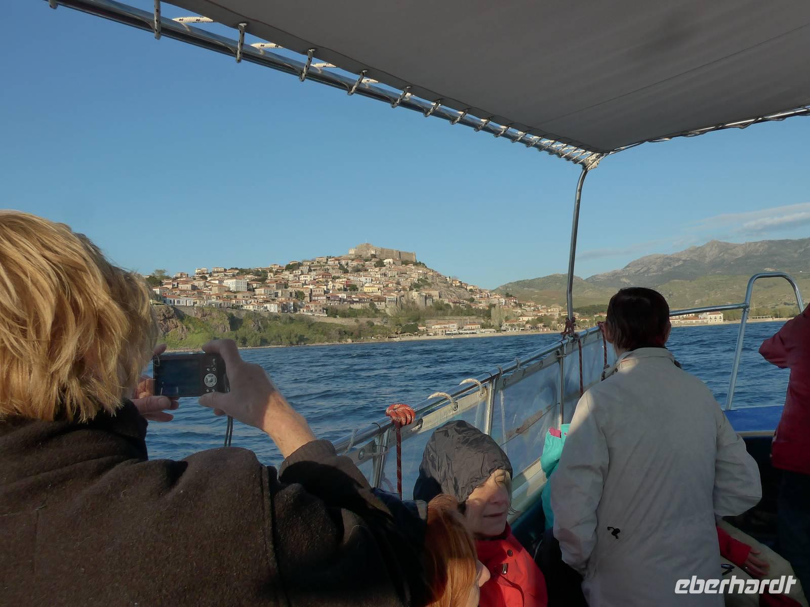 Der kleine Hafen ist ein Postkartenmotiv gesämt von Restaurants und der Felsenkirche der Madonna mit dem Fischschwanz. An einer langen Tafel im Freien nahmen wir Platz und dann kamen die vielen Vorspeisen und herrlicher Fisch. Viele hungrige Katzen gesellten sich zu uns und hofften auf eine milde Gabe. Es schmeckte alles hervorragend, aber wir schafften es nicht, alle Teller leer zu essen. Schade. Die Rückfahrt nach Molivos machten wir mit einem kleinen Boot. Der mäßige Wind hatte das Meer aufgewühlt und so waren wir reichlich naß bei der Ankunft im Hafen von Molivos. Vom Boot aus konnten wir nochmals unsere Wegstrecke, die wir gewandert waren, verfolgen und Molivos vom Wasser aus mit der mächtigen Burganlage war ein faszinierender Abschluß der Bootsfahrt. Wir zogen uns trockene Sachen an und gingen nochmals hinauf nach Moliovos, um bei Sonnenuntergang mit einem Drink den erlebnisreichen Tag ausklingen zu lassen.
