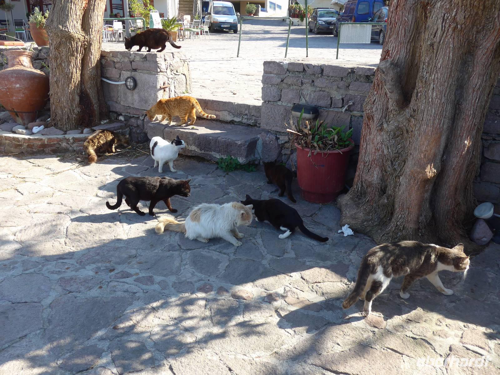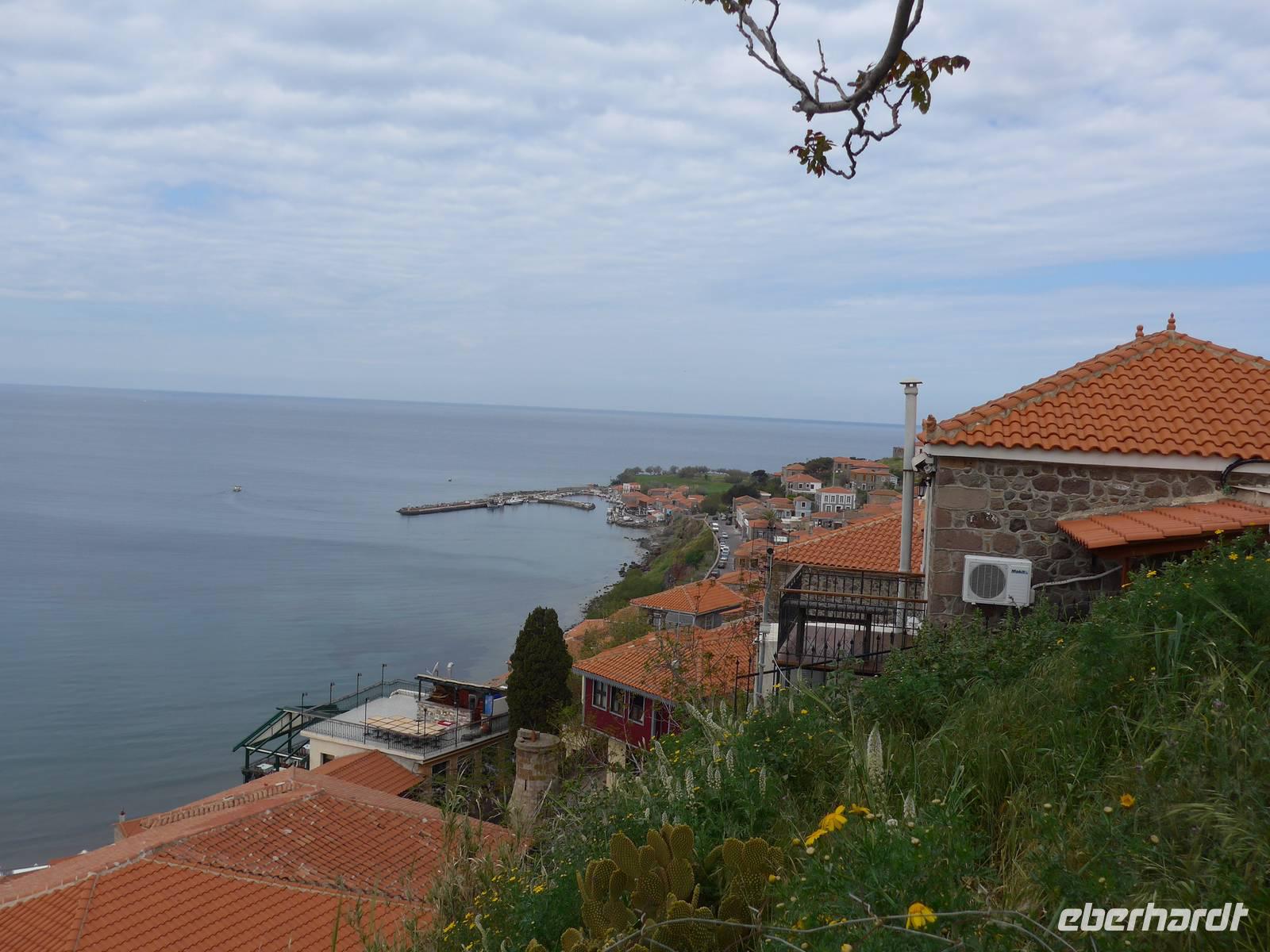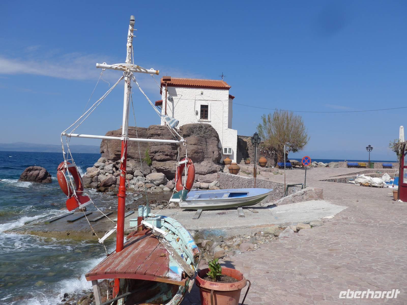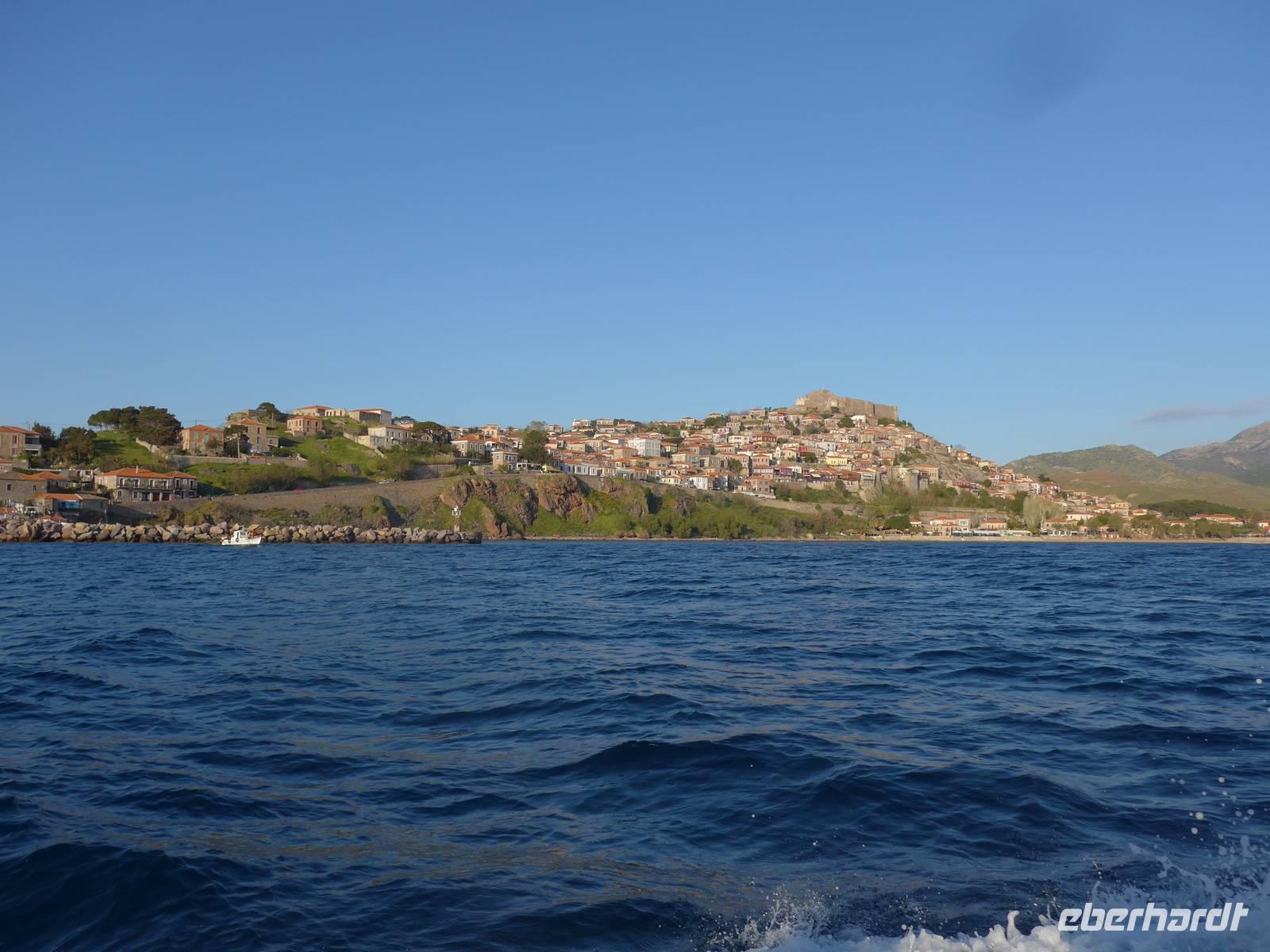 Der kleine Hafen ist ein Postkartenmotiv gesämt von Restaurants und der Felsenkirche der Madonna mit dem Fischschwanz. An einer langen Tafel im Freien nahmen wir Platz und dann kamen die vielen Vorspeisen und herrlicher Fisch. Viele hungrige Katzen gesellten sich zu uns und hofften auf eine milde Gabe. Es schmeckte alles hervorragend, aber wir schafften es nicht, alle Teller leer zu essen. Schade. Die Rückfahrt nach Molivos machten wir mit einem kleinen Boot. Der mäßige Wind hatte das Meer aufgewühlt und so waren wir reichlich naß bei der Ankunft im Hafen von Molivos. Vom Boot aus konnten wir nochmals unsere Wegstrecke, die wir gewandert waren, verfolgen und Molivos vom Wasser aus mit der mächtigen Burganlage war ein faszinierender Abschluß der Bootsfahrt. Wir zogen uns trockene Sachen an und gingen nochmals hinauf nach Moliovos, um bei Sonnenuntergang mit einem Drink den erlebnisreichen Tag ausklingen zu lassen.