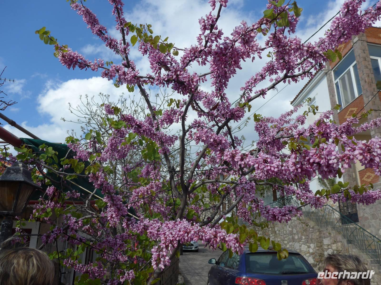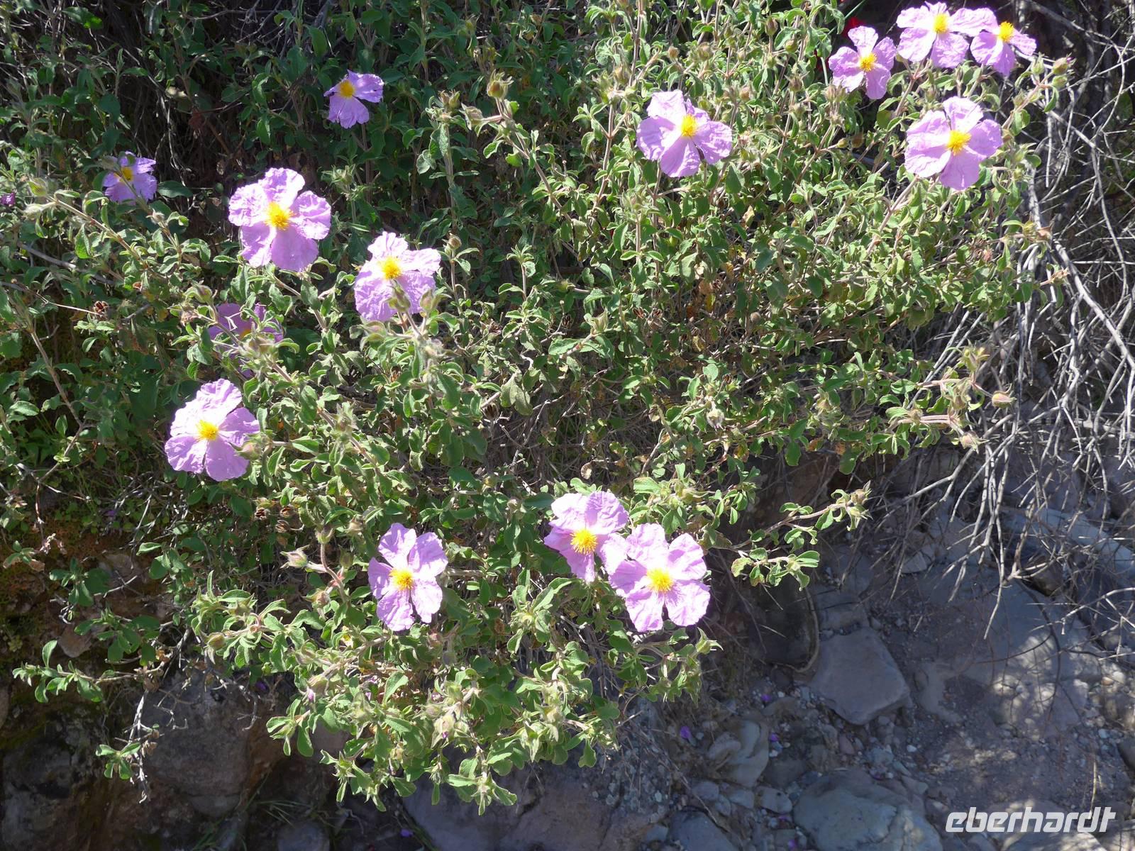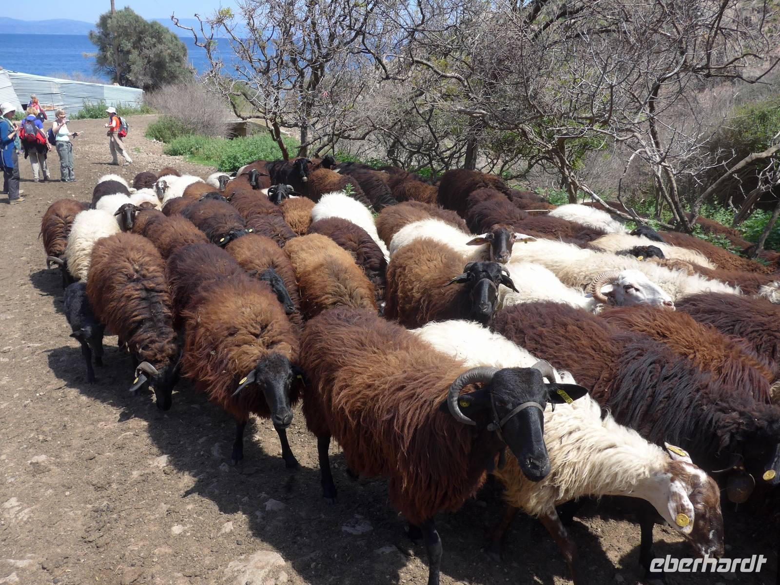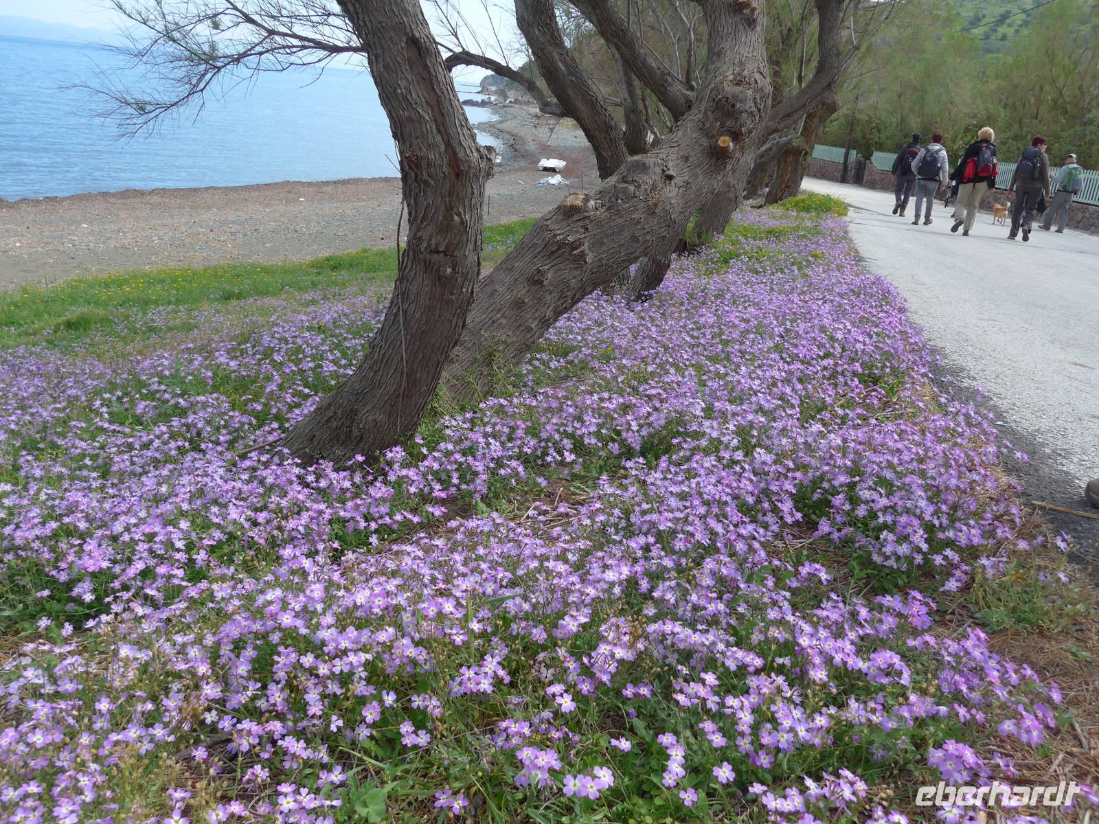 Kurz nach Zehn empfing uns Eva und wir spazierten zunächst durch unseren Urlaubsort Molivos. Durch enge, steile Gassen gingen wir bergauf und lernten so die ersten Ausblicke und wichtigsten Adressen kennen. Unser Bus brachte uns bis zu den heißen Quellen von Eftalous und dort begann dann unsere erste Wanderung immer an der Küste entlang mit herrlichen Ausblicken hinüber nach Kleinasien. Während einer Rast erzählte uns Eva von Sappho, der ersten Lyrikerin der Antike, die auf Lesbos gelebt hatte, und sie las uns aus dem Buch "Das Meer hört zu mit taußend Ohren" von Eva Demski vor. Dann gingen wir weiter durch herrlich blühende Natur mit Klatschmohn, Anemonen und Zistrosen. Unter den Tamarisken am Meer war ein violetter Teppich von gebogener Malcolmie. Wir kamen zu heißen Quellen direkt am Strand, sahen Schafherden mit vielen Jungtieren und gingen schließlich auf einem alten Pfad hinunter nach Skala Sikamineas.