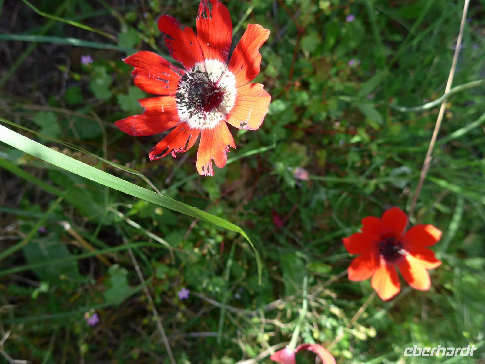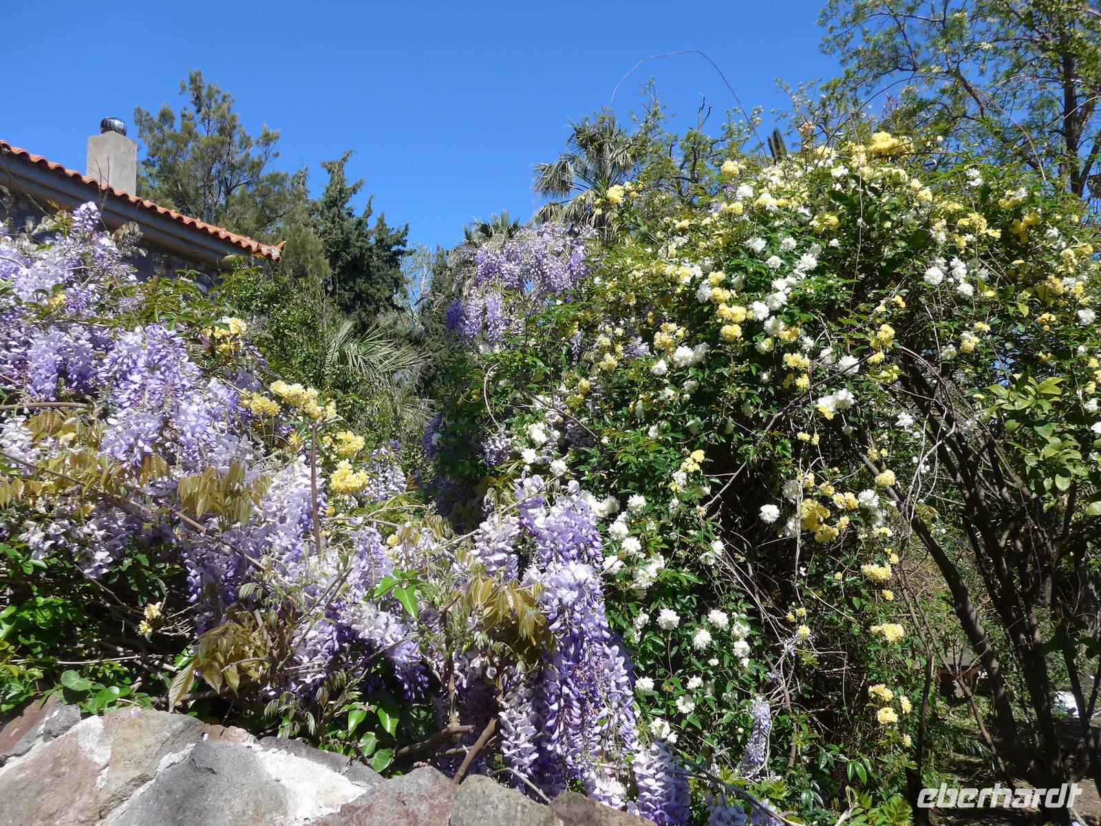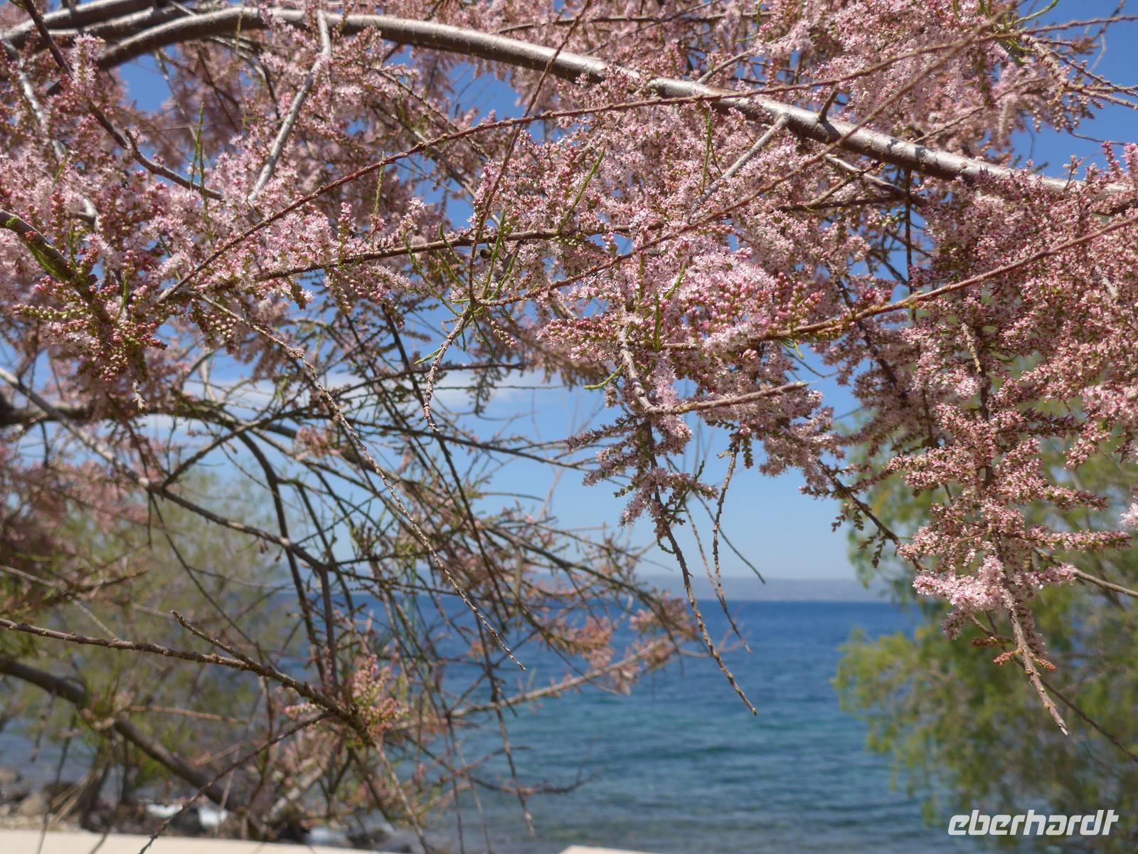 Kurz nach Zehn empfing uns Eva und wir spazierten zunächst durch unseren Urlaubsort Molivos. Durch enge, steile Gassen gingen wir bergauf und lernten so die ersten Ausblicke und wichtigsten Adressen kennen. Unser Bus brachte uns bis zu den heißen Quellen von Eftalous und dort begann dann unsere erste Wanderung immer an der Küste entlang mit herrlichen Ausblicken hinüber nach Kleinasien. Während einer Rast erzählte uns Eva von Sappho, der ersten Lyrikerin der Antike, die auf Lesbos gelebt hatte, und sie las uns aus dem Buch "Das Meer hört zu mit taußend Ohren" von Eva Demski vor. Dann gingen wir weiter durch herrlich blühende Natur mit Klatschmohn, Anemonen und Zistrosen. Unter den Tamarisken am Meer war ein violetter Teppich von gebogener Malcolmie. Wir kamen zu heißen Quellen direkt am Strand, sahen Schafherden mit vielen Jungtieren und gingen schließlich auf einem alten Pfad hinunter nach Skala Sikamineas.