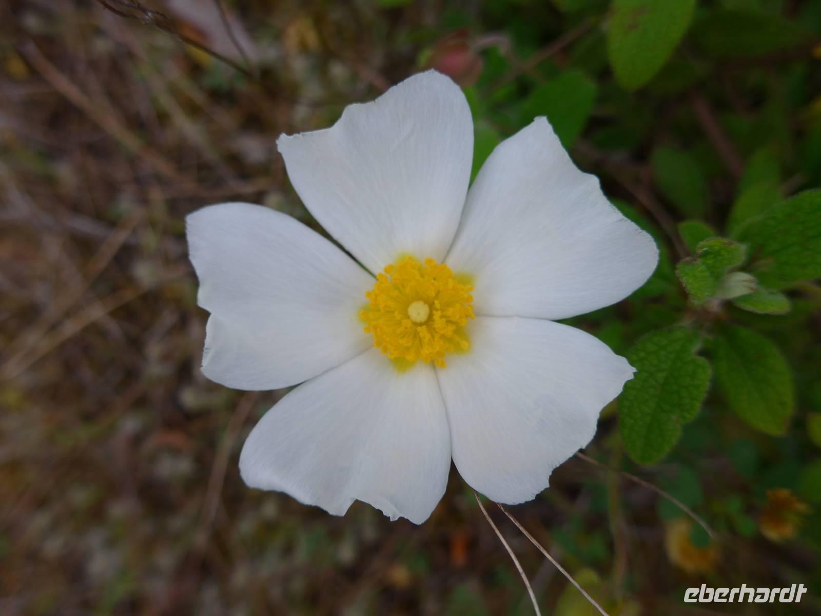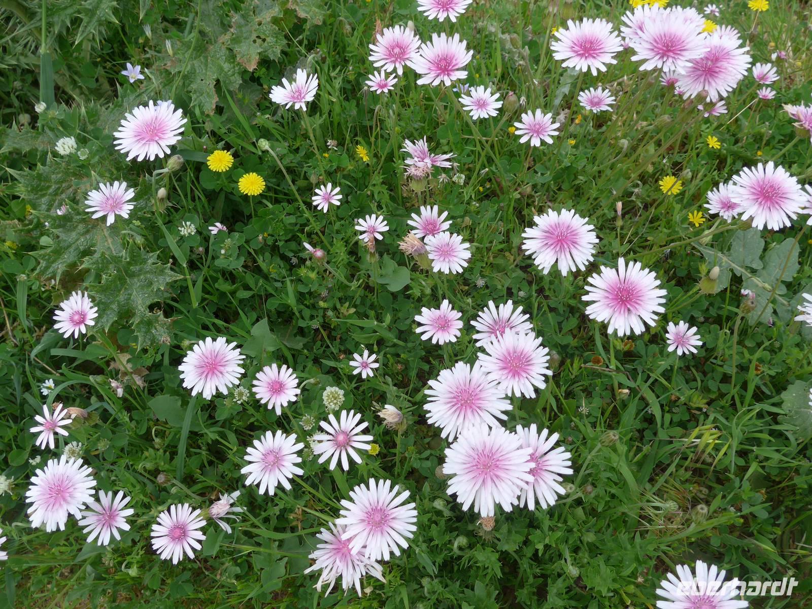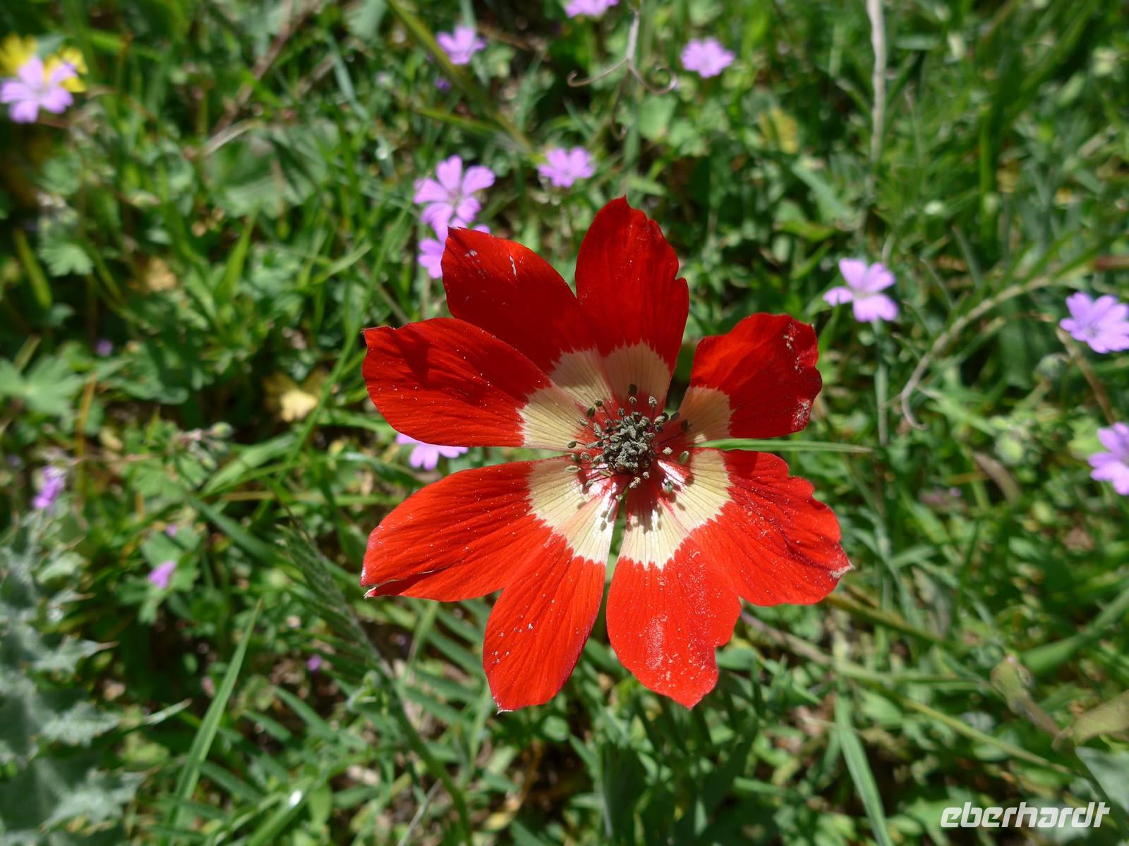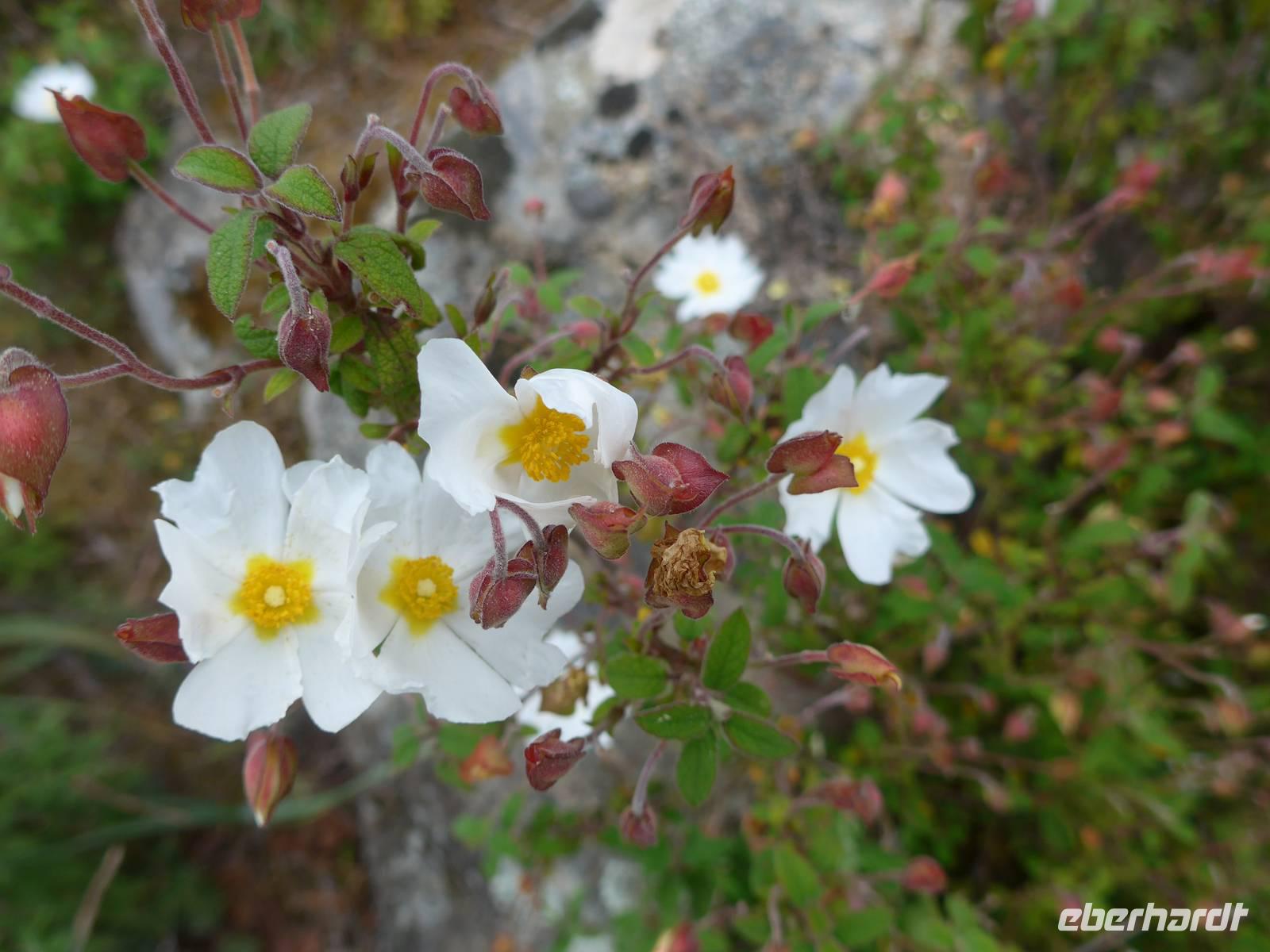 Kurz nach Zehn empfing uns Eva und wir spazierten zunächst durch unseren Urlaubsort Molivos. Durch enge, steile Gassen gingen wir bergauf und lernten so die ersten Ausblicke und wichtigsten Adressen kennen. Unser Bus brachte uns bis zu den heißen Quellen von Eftalous und dort begann dann unsere erste Wanderung immer an der Küste entlang mit herrlichen Ausblicken hinüber nach Kleinasien. Während einer Rast erzählte uns Eva von Sappho, der ersten Lyrikerin der Antike, die auf Lesbos gelebt hatte, und sie las uns aus dem Buch "Das Meer hört zu mit taußend Ohren" von Eva Demski vor. Dann gingen wir weiter durch herrlich blühende Natur mit Klatschmohn, Anemonen und Zistrosen. Unter den Tamarisken am Meer war ein violetter Teppich von gebogener Malcolmie. Wir kamen zu heißen Quellen direkt am Strand, sahen Schafherden mit vielen Jungtieren und gingen schließlich auf einem alten Pfad hinunter nach Skala Sikamineas.