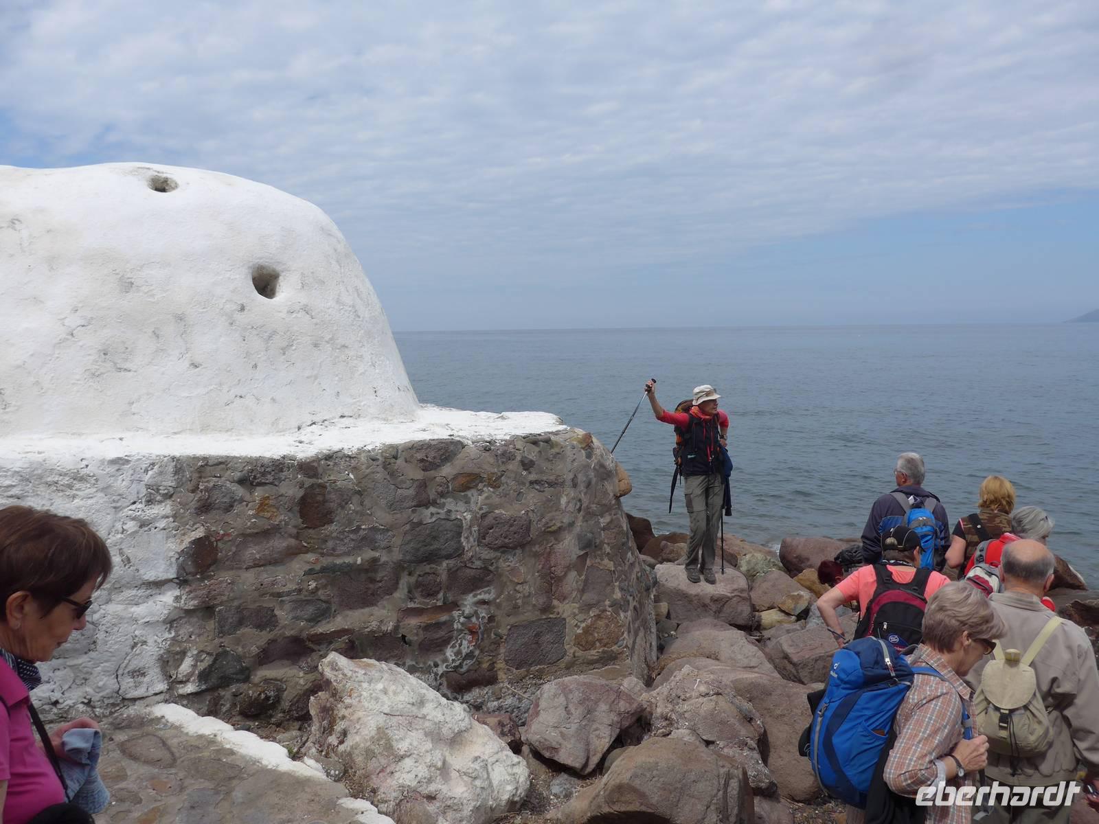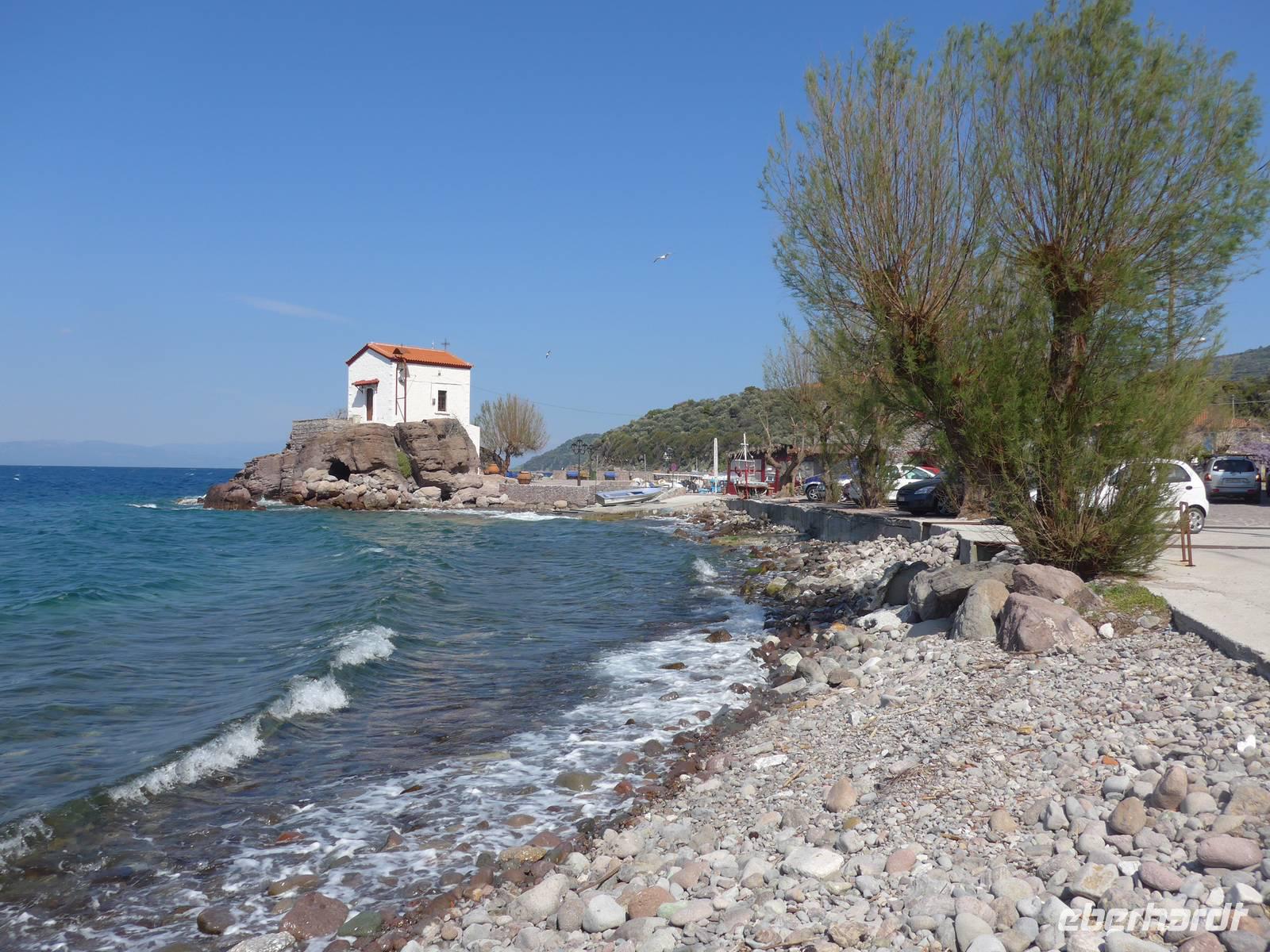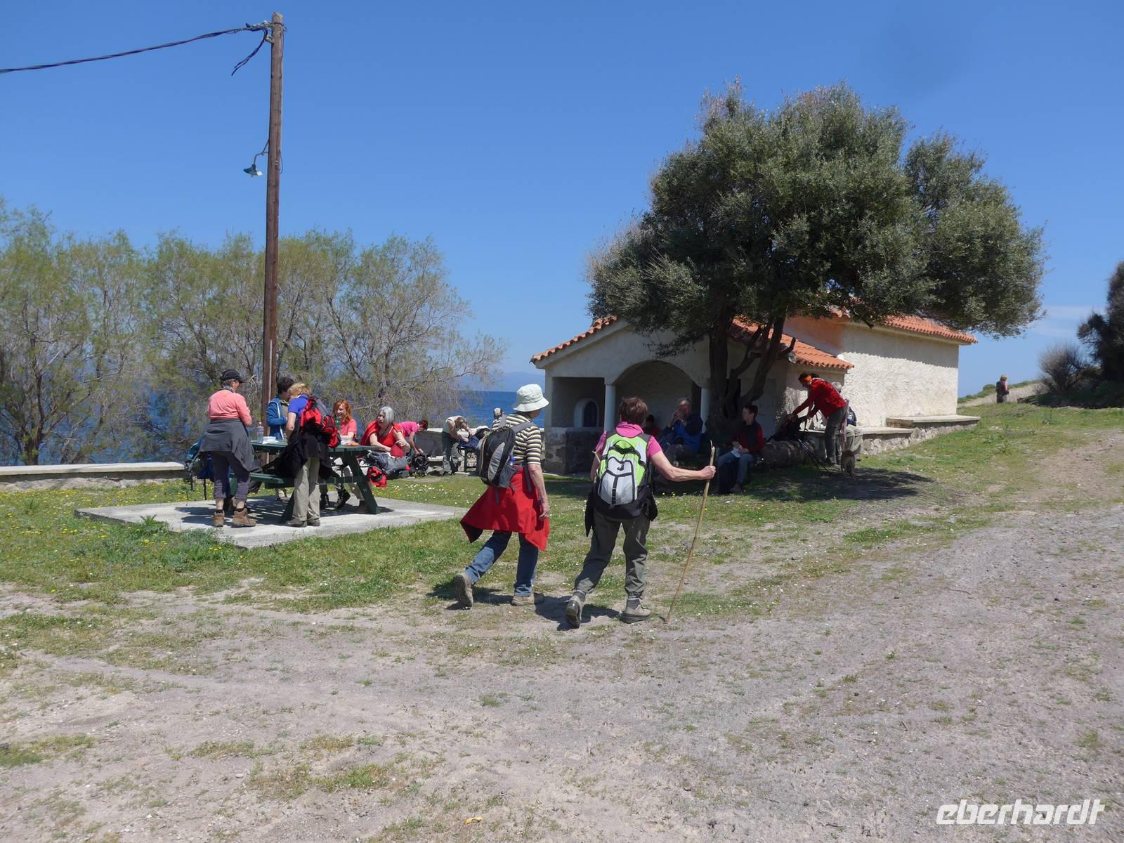 Wir liefen gemütlich bergan und dann weiter auf einer breiten Piste hoch oben über dem Meer mit tollen Ausblicken nach Osten und Westen auf die Küste. Viele Kräuter gab es am Wegesrand. Nach eineinhalb Stunden kam ein steiler Abstieg zum Meer zu eben der Kapelle der versteckten Maria. Der Ort wird besonders am Montag nach dem griechischen Osterfest von vielen Pilgern aufgesucht. Sie kommen allerdings mit Booten und nutzen auch das Thermalwasser, welches in einer Felsspalte nebenan entspringt und dem große Heilkräfte zugeschrieben werden. Wir machten an der Kapelle eine Rast und genossen die Ruhe an diesem magischen Ort. Der Rückweg führte wieder über die gleiche Strecke, erst steil bergauf und dann gemütlich oberhalb der Küste. Zum Mittagessen wurden wir bei Sultana am Hafen von Plomari erwartet. Die Tische wurden in die Sonne geräumt und dann genossen wir die vielen Vorspeisen und den Fisch. Unseren Spaziergang durch die Gassen von Plomari ließen wir wegen der späten Stunde ausfallen und fuhren mit unserem Bus über die Berge nach Pappados.