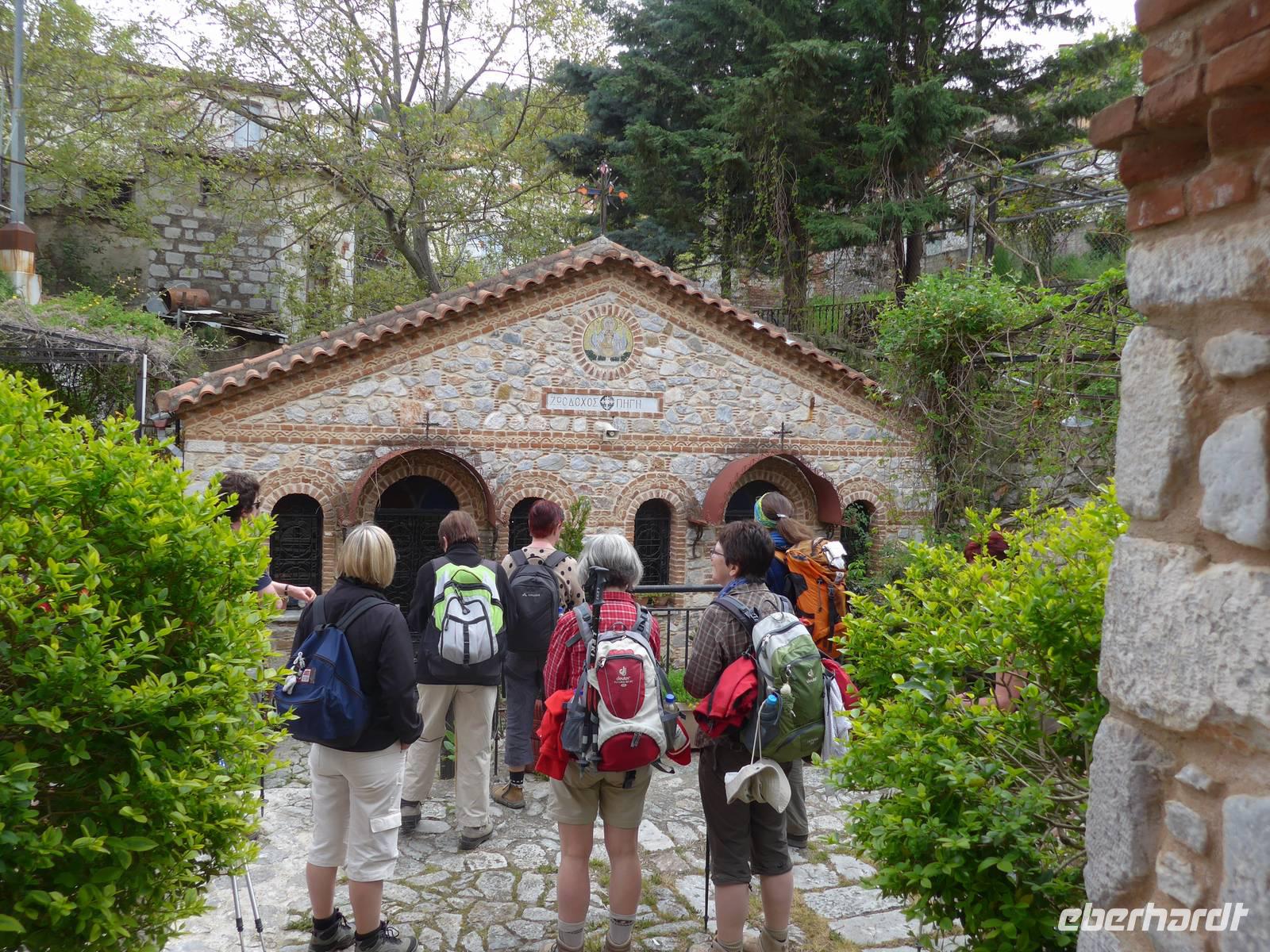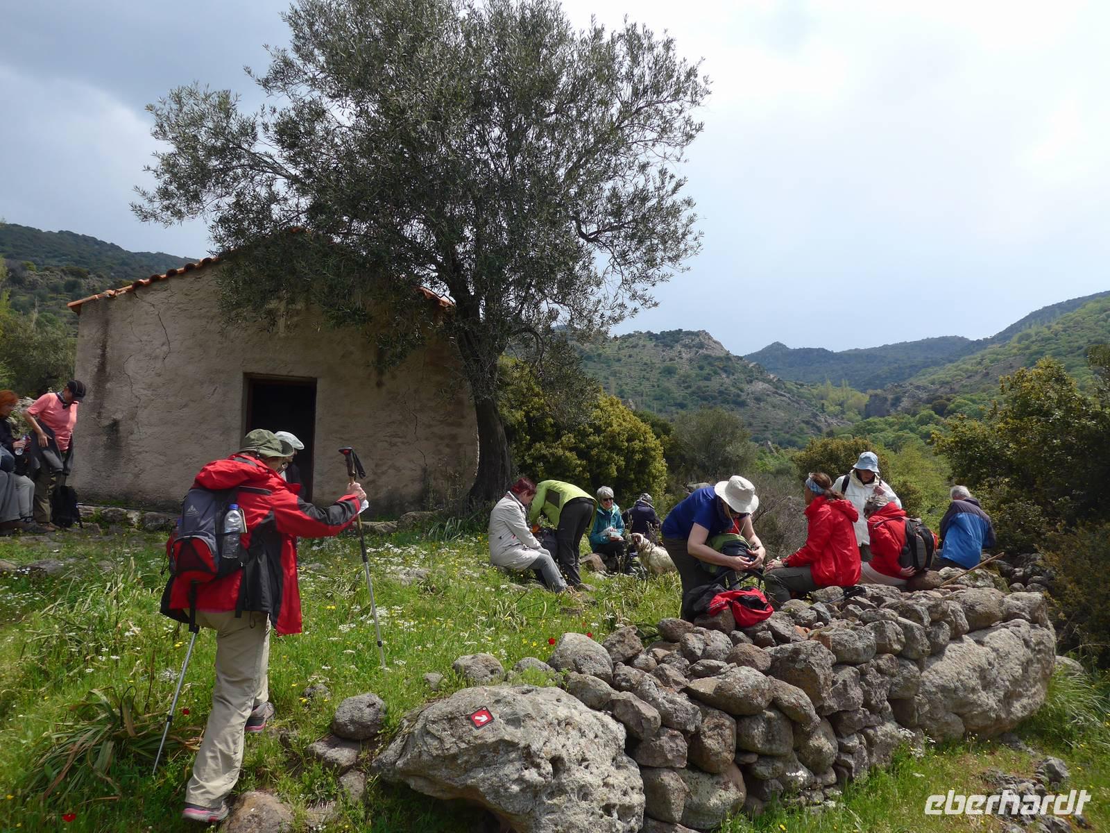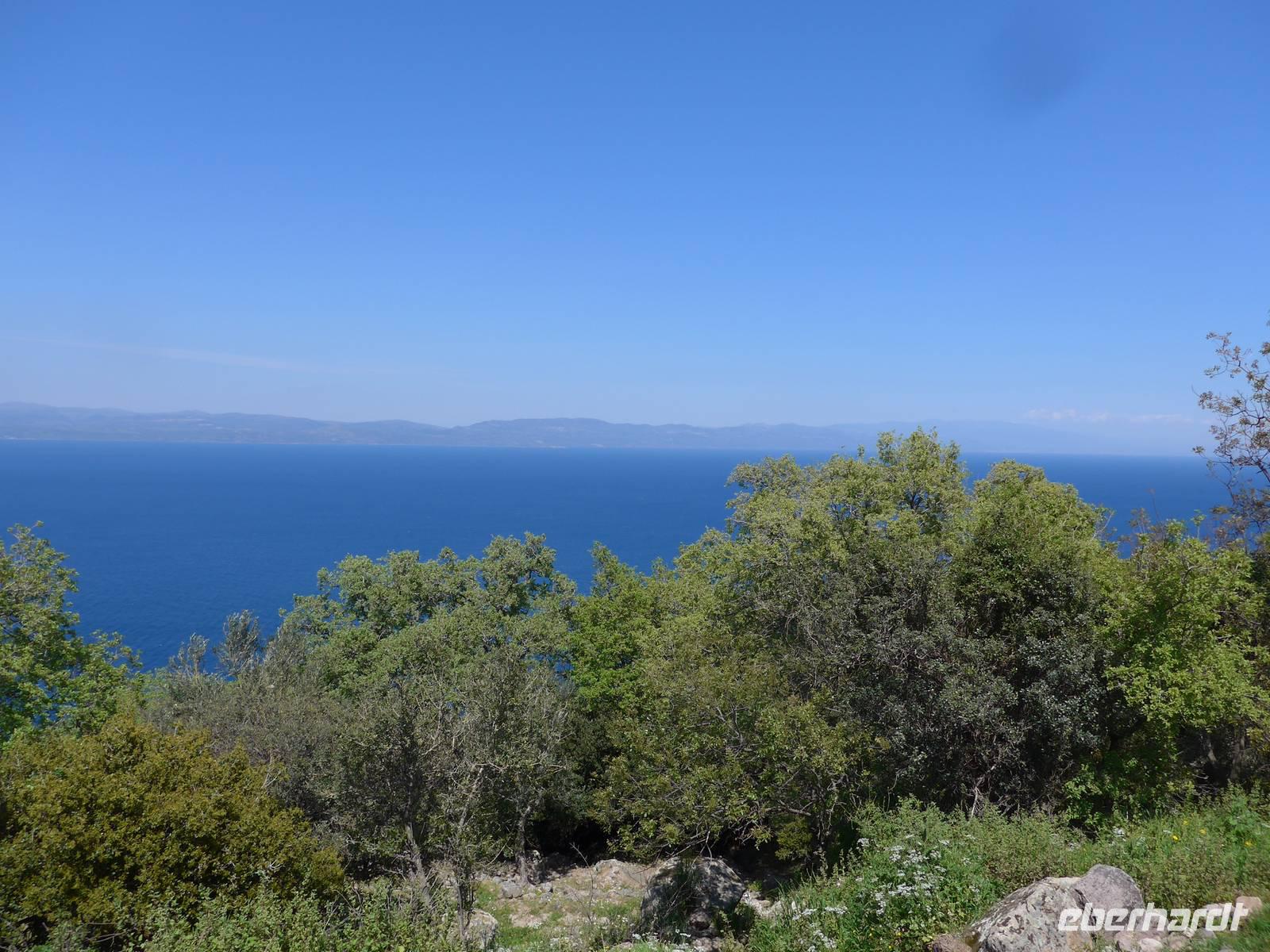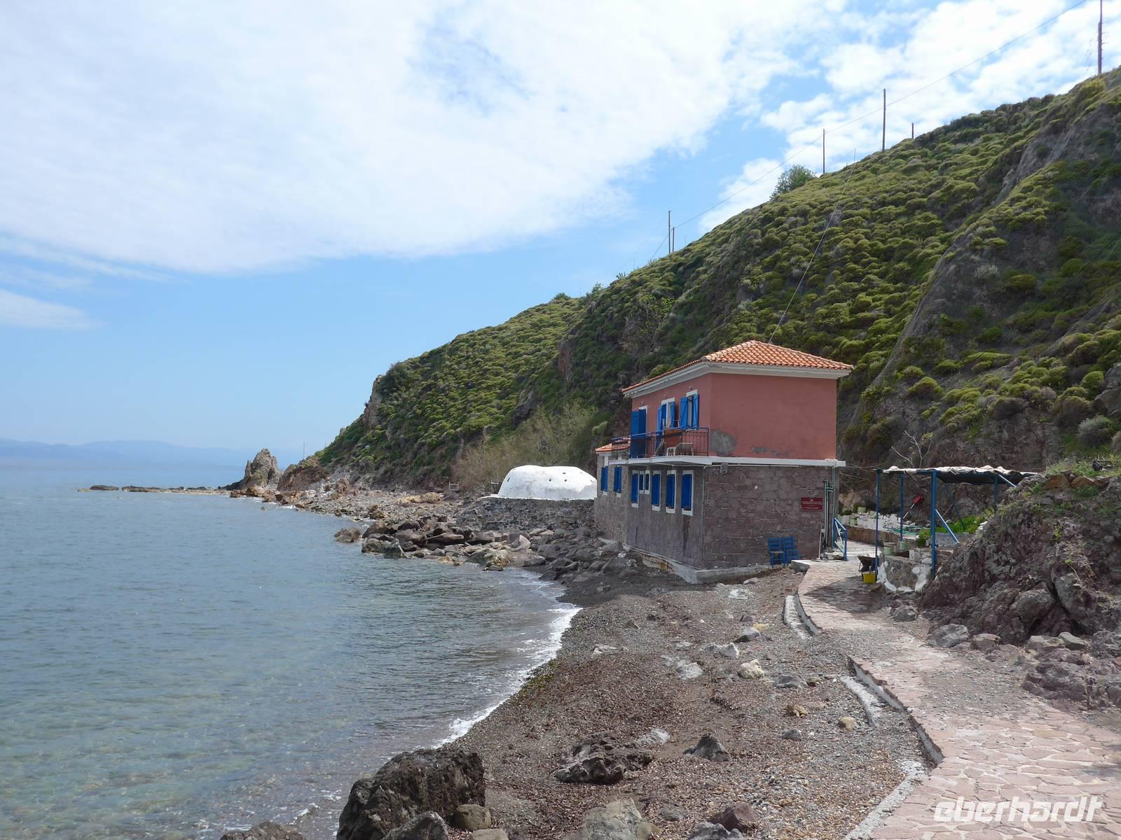 Wir liefen gemütlich bergan und dann weiter auf einer breiten Piste hoch oben über dem Meer mit tollen Ausblicken nach Osten und Westen auf die Küste. Viele Kräuter gab es am Wegesrand. Nach eineinhalb Stunden kam ein steiler Abstieg zum Meer zu eben der Kapelle der versteckten Maria. Der Ort wird besonders am Montag nach dem griechischen Osterfest von vielen Pilgern aufgesucht. Sie kommen allerdings mit Booten und nutzen auch das Thermalwasser, welches in einer Felsspalte nebenan entspringt und dem große Heilkräfte zugeschrieben werden. Wir machten an der Kapelle eine Rast und genossen die Ruhe an diesem magischen Ort. Der Rückweg führte wieder über die gleiche Strecke, erst steil bergauf und dann gemütlich oberhalb der Küste. Zum Mittagessen wurden wir bei Sultana am Hafen von Plomari erwartet. Die Tische wurden in die Sonne geräumt und dann genossen wir die vielen Vorspeisen und den Fisch. Unseren Spaziergang durch die Gassen von Plomari ließen wir wegen der späten Stunde ausfallen und fuhren mit unserem Bus über die Berge nach Pappados.