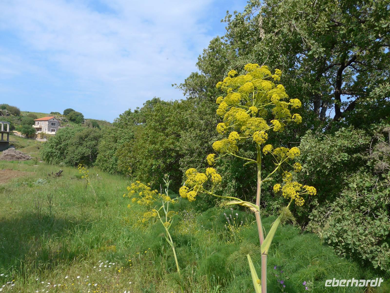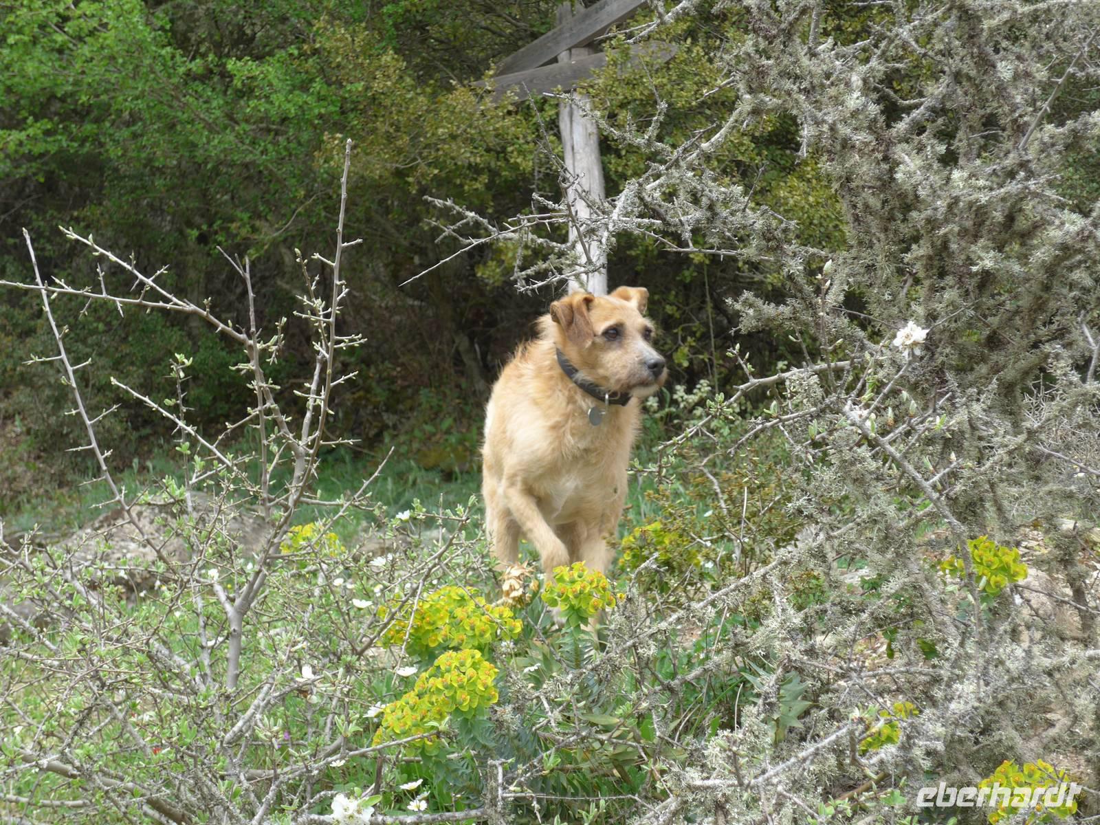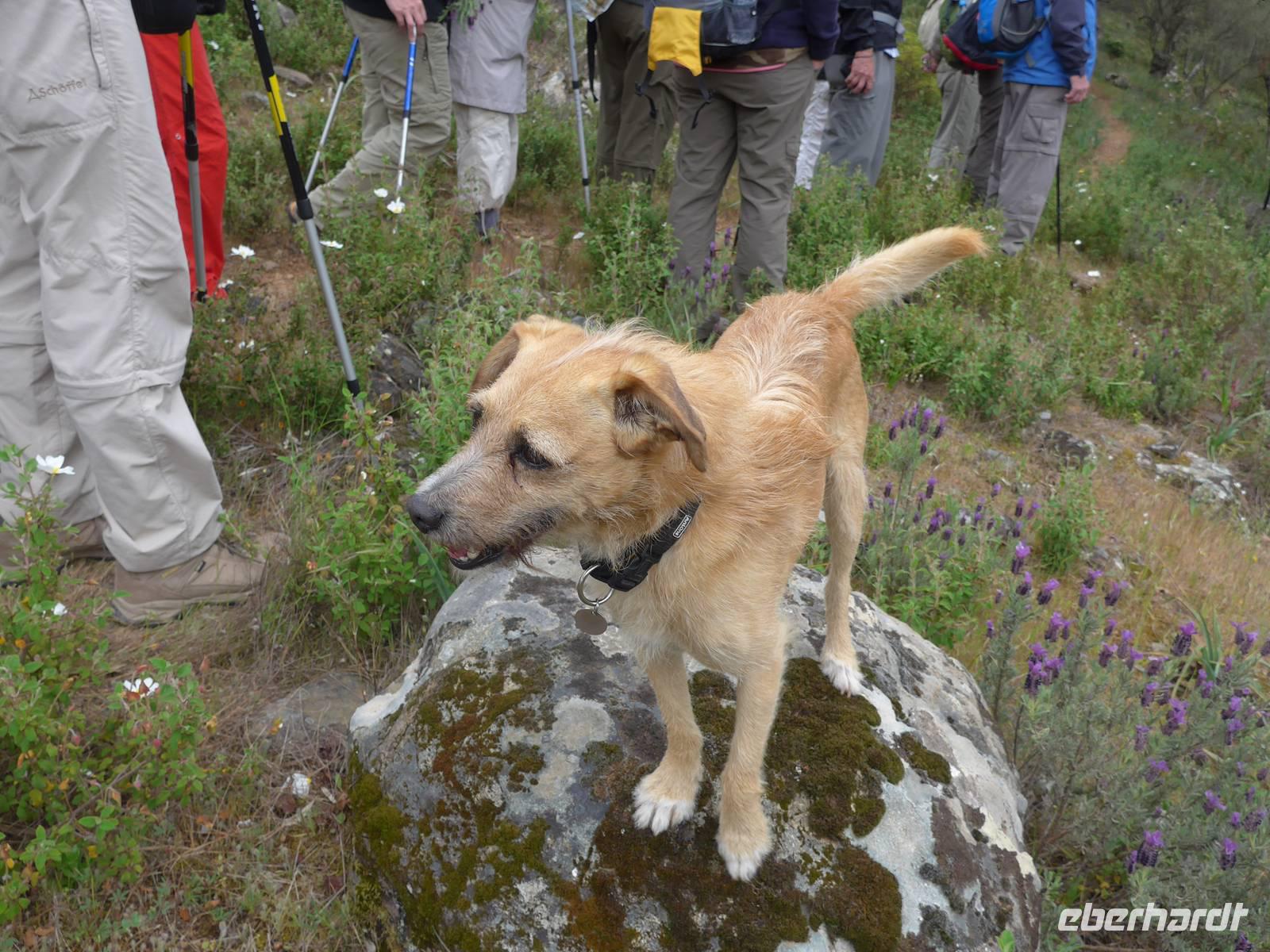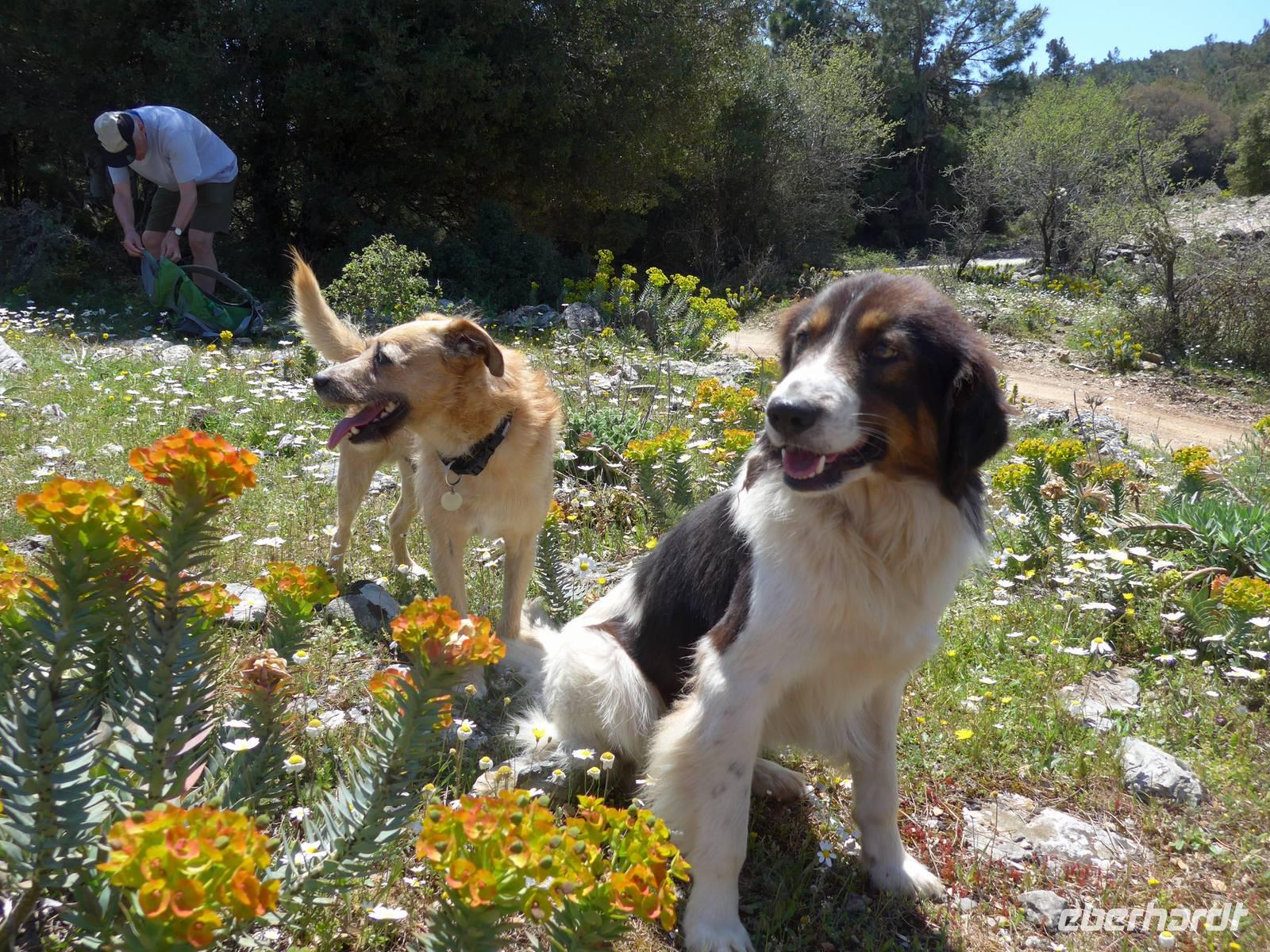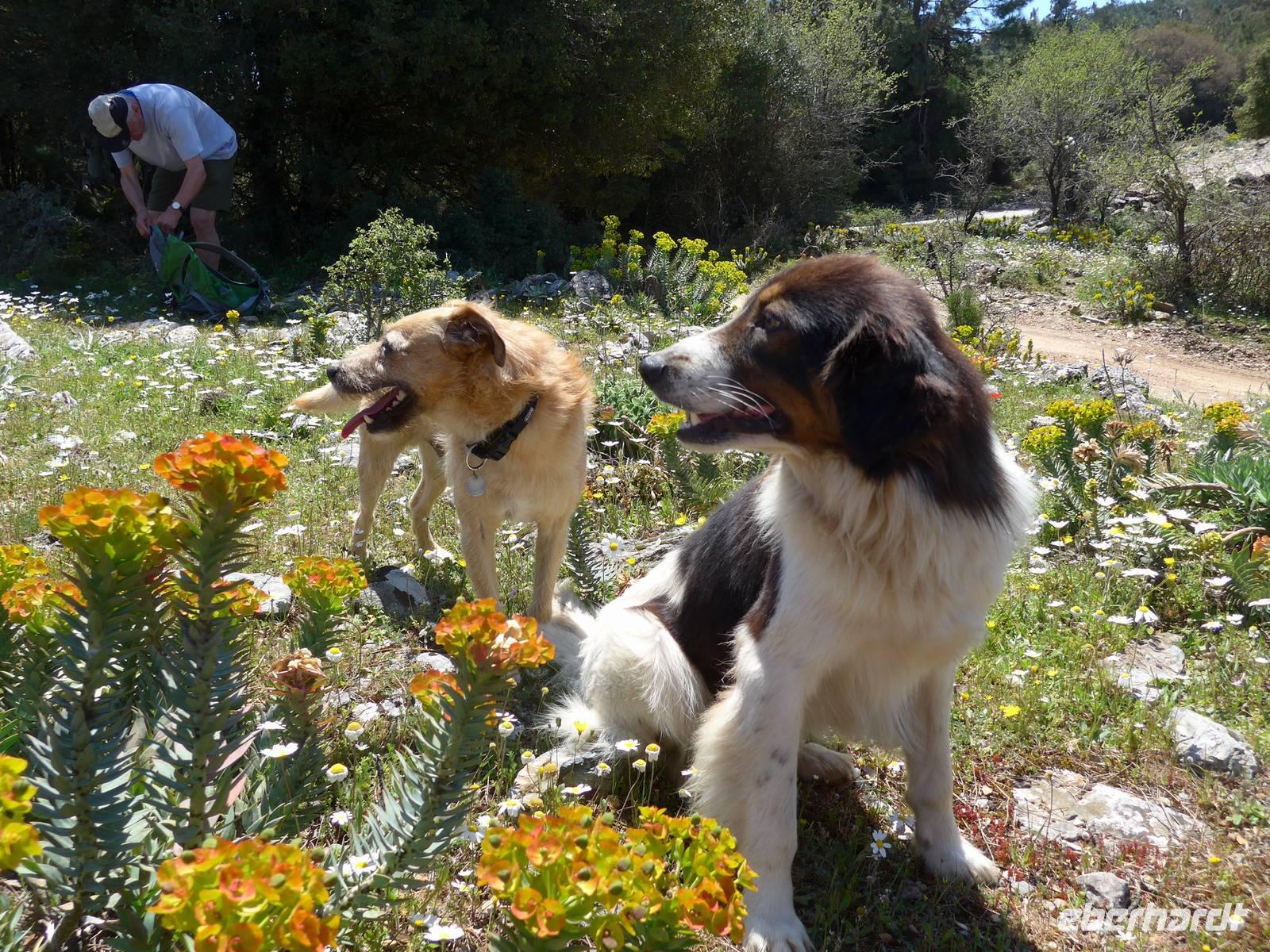 Unser Bus brachte uns nach dem Frühstück nach Agiassos und eigentlich noch ein Stück höher. Aber das konnte unser Bus wegen seiner Größe nicht leisten und so organisierte Eva ein Taxi (mehr waren leider nicht verfügbar), welches immer 4 Personen zum Start der Wanderung oben bei einem Schafstall brachte. 12 Uhr waren endlich alle oben und wir liefen los. Es war ein wunderschöner Weg mit vielen Orchideen am Wegesrand und herrlichen Ausblicken hinunter zum Golf von Gera. Eine fremde, liebebedürftige Hündin begleitete uns und so hatte Flix auch seine Abwechslung. Der Weg führte dann über einen Grat und so konnten wir zu beiden Seiten das Meer sehen. Am Wegesrand glitzerten die Steine in der Sonne und so sammelten wir besonders schöne Exemplare für zu Hause.
