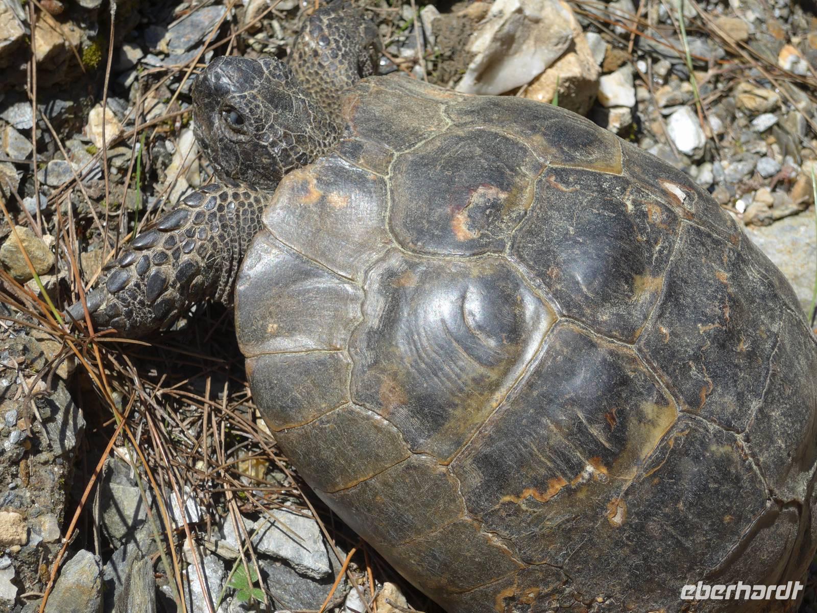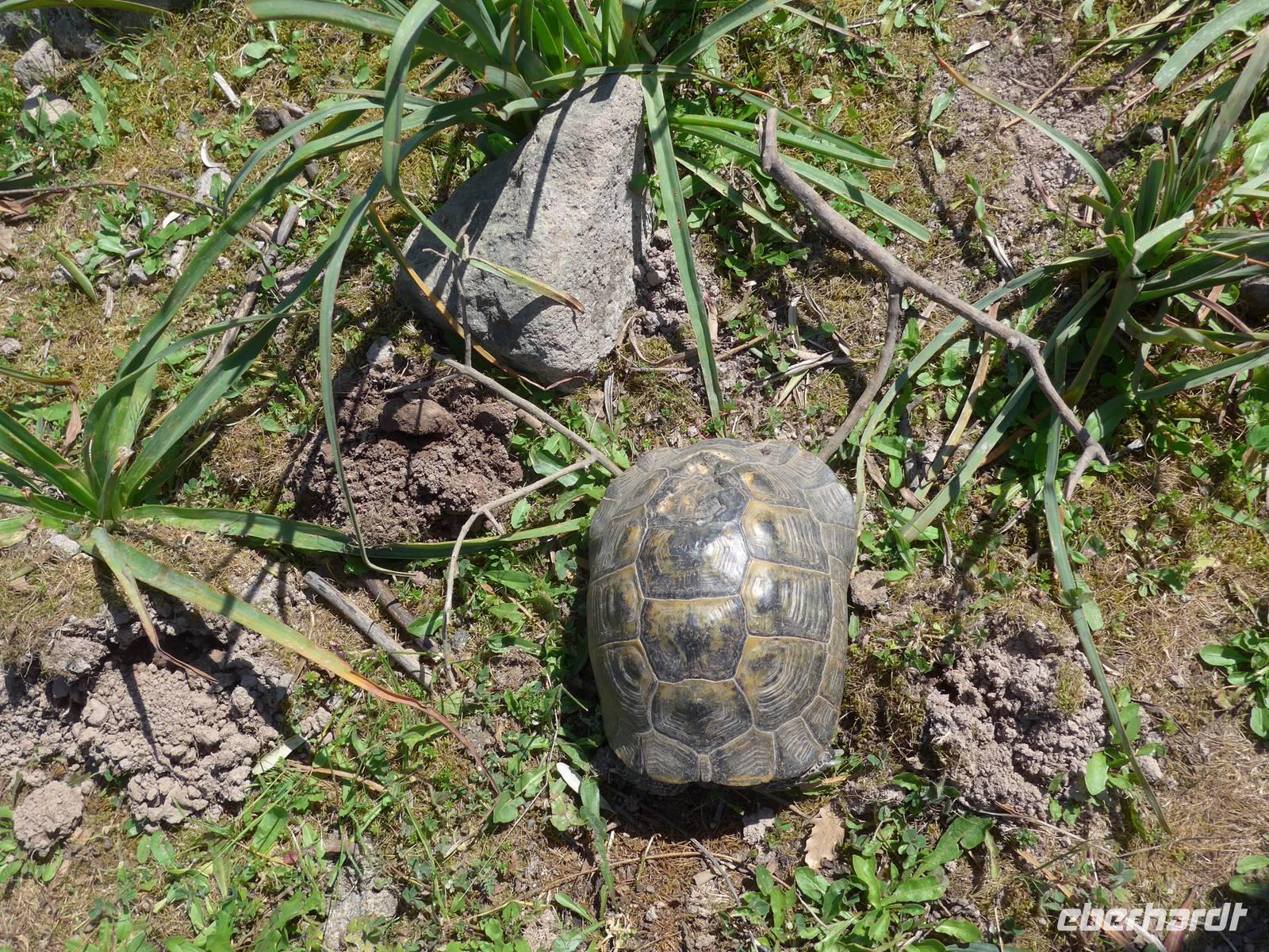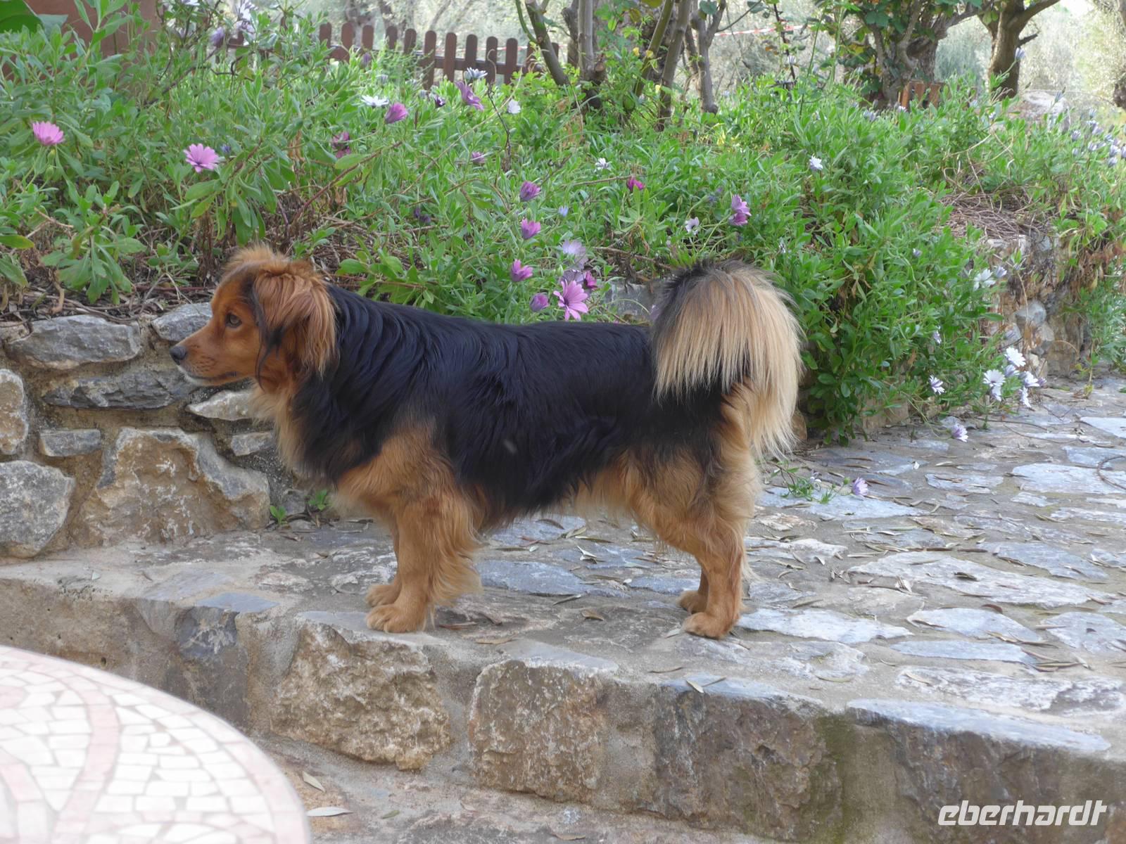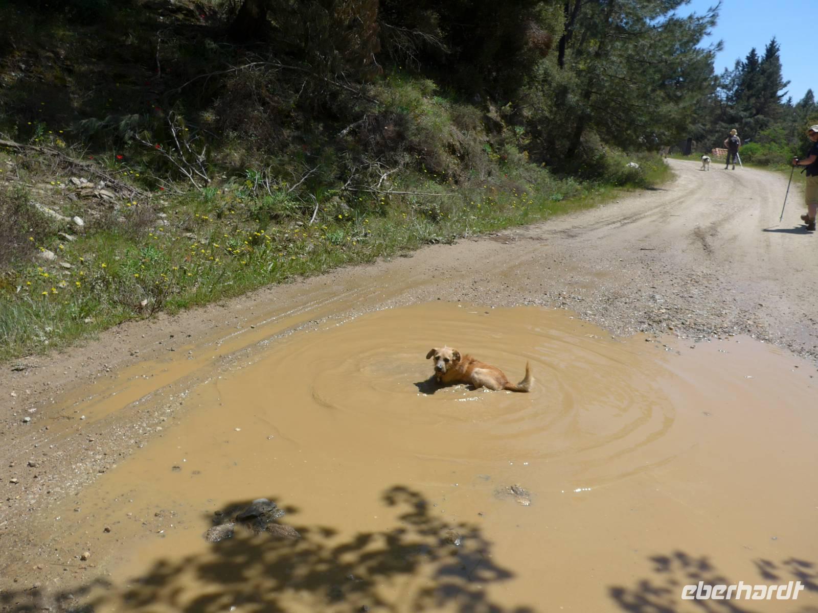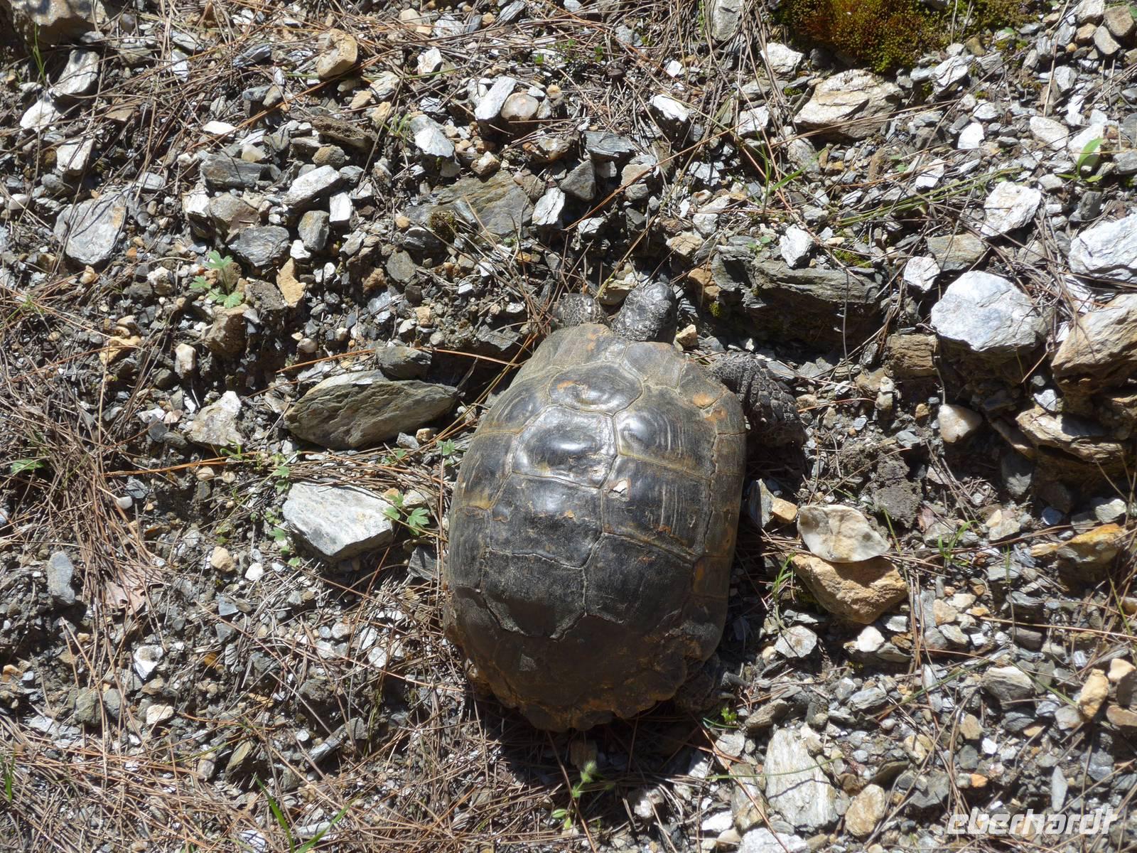 Unser Bus brachte uns nach dem Frühstück nach Agiassos und eigentlich noch ein Stück höher. Aber das konnte unser Bus wegen seiner Größe nicht leisten und so organisierte Eva ein Taxi (mehr waren leider nicht verfügbar), welches immer 4 Personen zum Start der Wanderung oben bei einem Schafstall brachte. 12 Uhr waren endlich alle oben und wir liefen los. Es war ein wunderschöner Weg mit vielen Orchideen am Wegesrand und herrlichen Ausblicken hinunter zum Golf von Gera. Eine fremde, liebebedürftige Hündin begleitete uns und so hatte Flix auch seine Abwechslung. Der Weg führte dann über einen Grat und so konnten wir zu beiden Seiten das Meer sehen. Am Wegesrand glitzerten die Steine in der Sonne und so sammelten wir besonders schöne Exemplare für zu Hause.