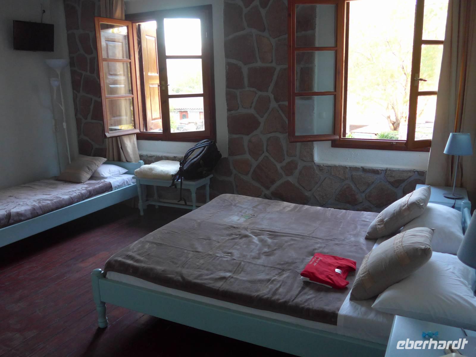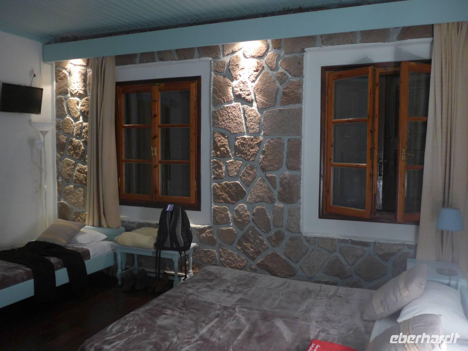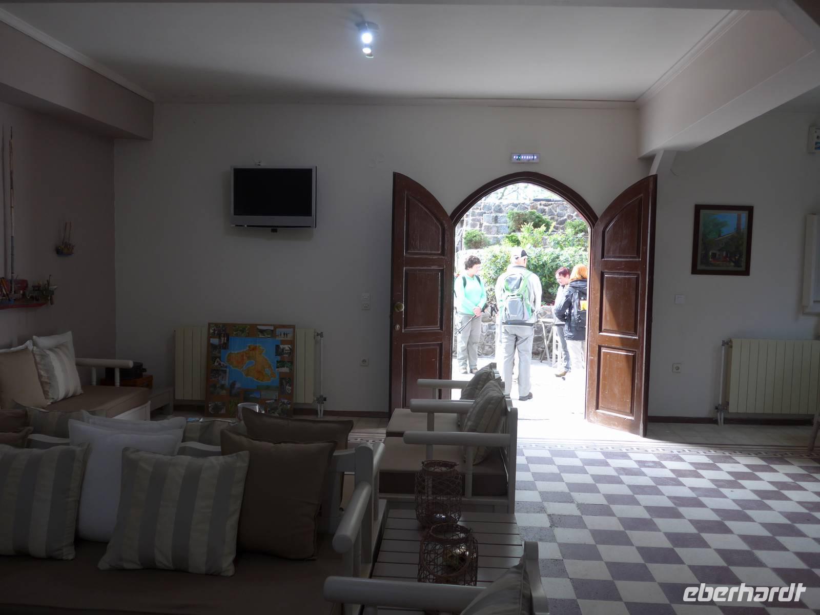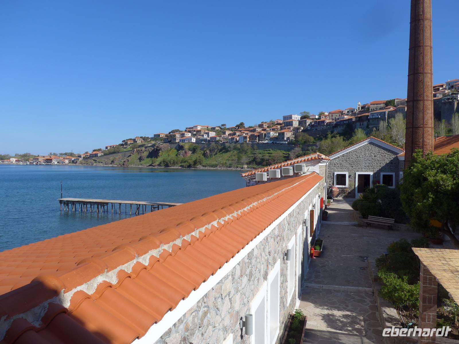 Unsere Reise begann wie so oft am Flughafen in Berlin Tegel. Wir tafen uns alle am Info-Schalter des Terminals A und checkten dann gemeinsam bei Aegean Airlines ein. Unser Flug ging über Athen nach Mytilini auf Lesbos. In Athen wurde uns eine Tür geöffnet, und so waren wir auf kürzestem Weg am nächsten Abfluggate. Der Service bei Aegean Airlines war wieder wie auch schon beim Flug nach Athen ausgezeichnet und so landeten wir halb Zehn auf dem Miniflughafen von Lesbos. Unser Gepäck kam sofort und Eva, unsere Wanderleiterin begrüßte uns bereits am Gepäckband. Noch eineinhalb Stunden Fahrt bis nach Molivos und unser Urlaub konnte beginnen.