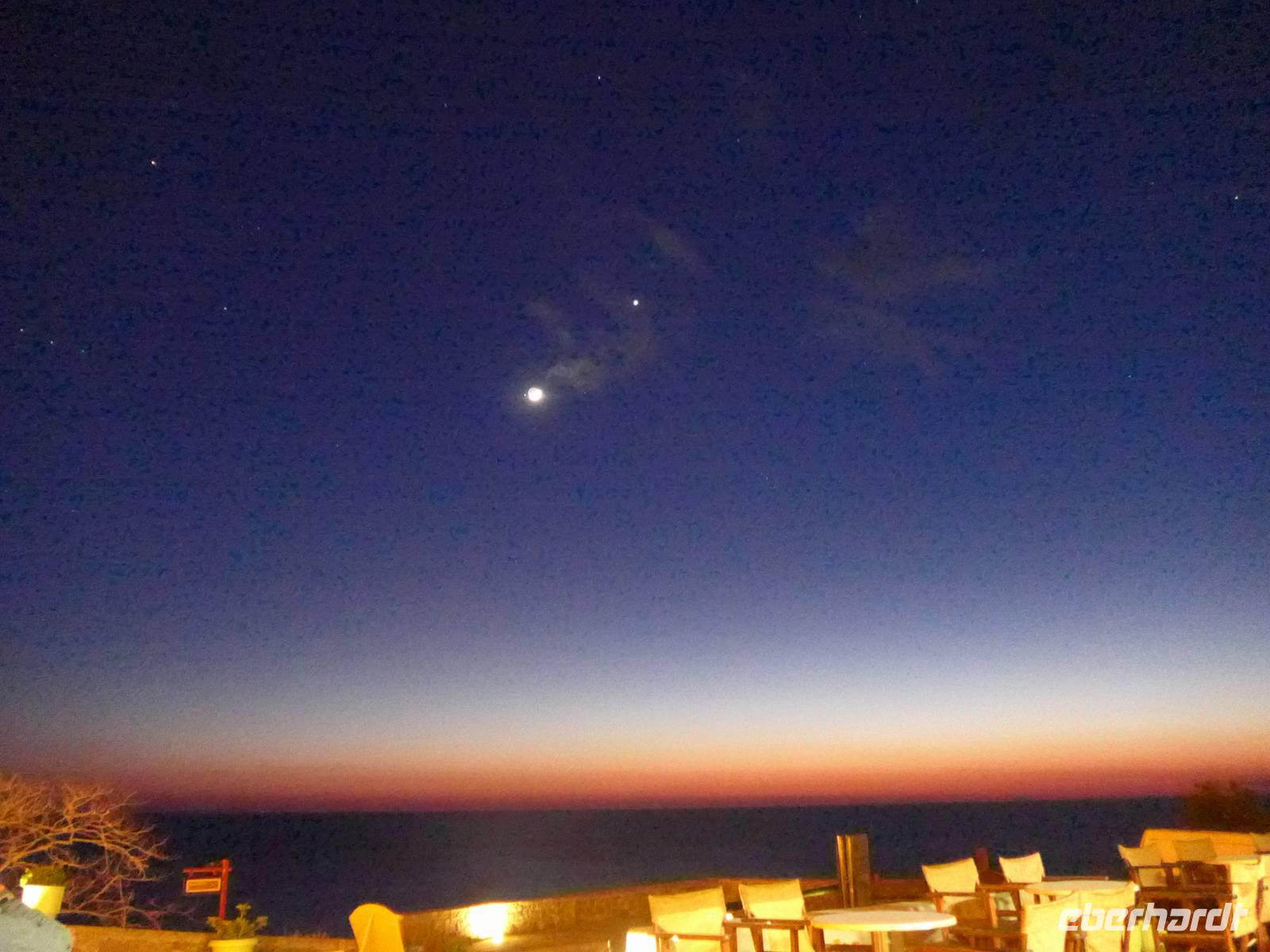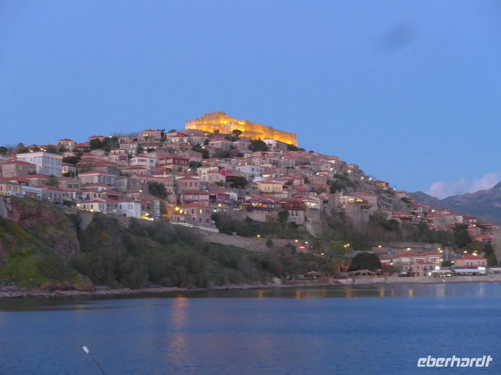 Nach unserer zweiten Wanderung waren wir noch fit für einen Abendspaziergang zum Hafen. Im Schein der vielen Lichter gingen wir zwischen den Booten hindurch auf die Mole und beim Anblick der beleuchteten Burg beschlossen wir, noch auf die Burg hinauf zu steigen. Zu unserer Überraschung gab es da oben sogar eine geöffnete Gaststätte zu später Stunde und so genossen wir den Sternenhimmel bei einem Gläschen Wein, Bier oder Ouzo.