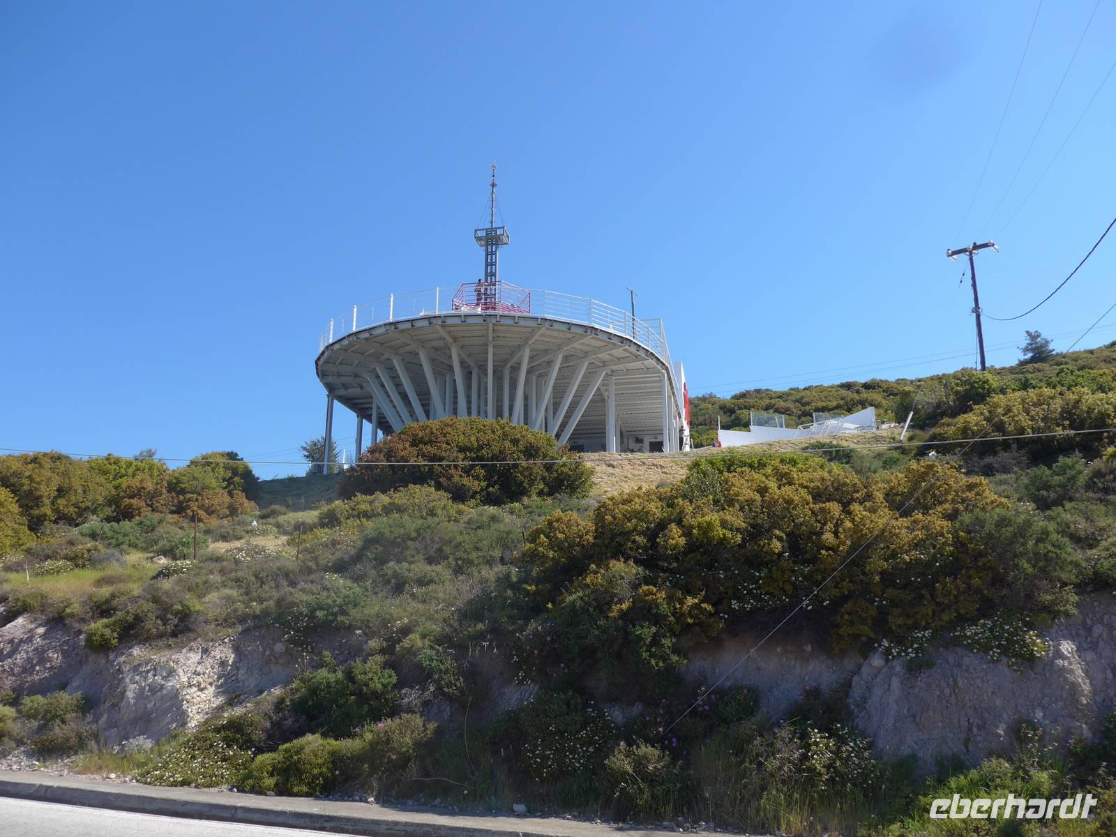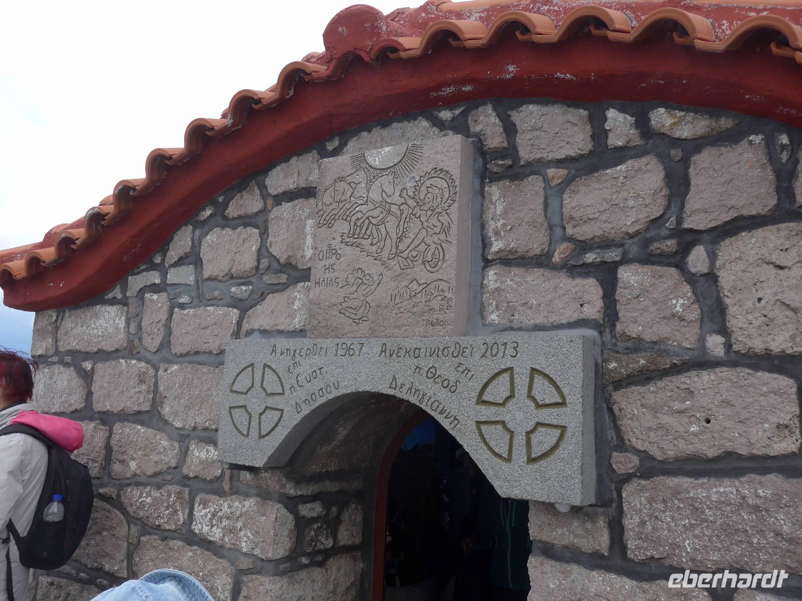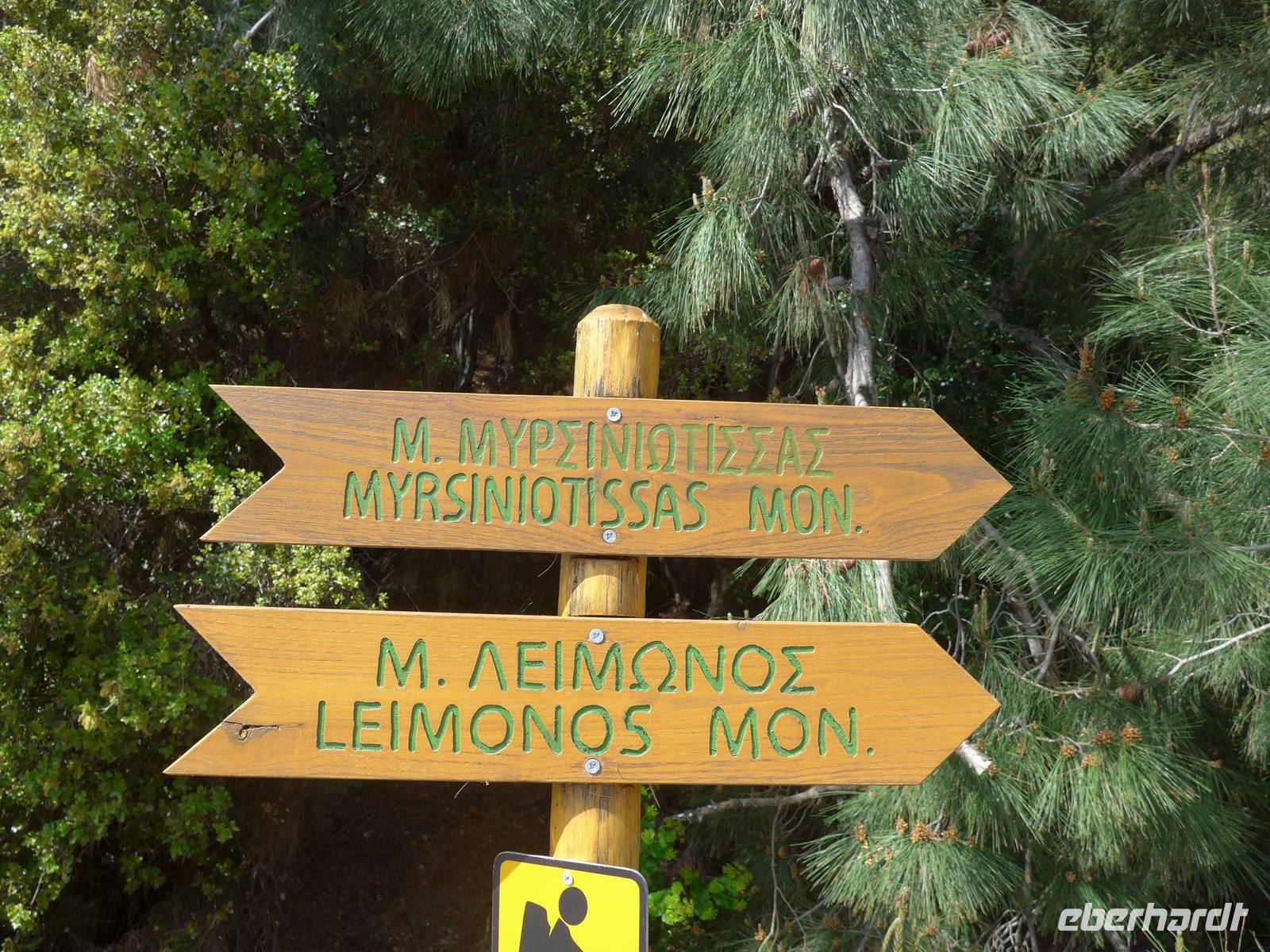 Mit unserem Bus fuhren wir hinauf nach Ypsilometopo auf der Südseite des Gebirges. Dunkle Wolken und erste Blitze am Himmel verhießen nichts Gutes. Wir füllten unsere Wasserflaschen mit Trinkwasser aus Kleinasien und Eva beschloß spontan, doch erst einmal ein Kafenion aufzusuchen. Kaum waren wir drin, ging ein Sturm und Hagelschauer nieder. Wir tranken Tilio-Tee, eine Mischung aus Ahorn- und Lindenblüten und nach einer knappen Stunde schien wieder die Sonne und wir konnten zu unserer Wanderung starten. Der Weg führte steil bergan vorbei an einer Ziegenfarm und durch flechten behangene Bäume. Sonne und Wolken wechselten sich ab und oben am Gipfel waren wir froh über die Einstellmöglichkeit in der kleinen Kapelle. Als Gipfellohn gab es Ouzo, Käse, Oliven und Sesamkringel. Der Ausblick auf die Insel war grandios. Starker Wind und ein tolles Wolkenspiel machten den Ort mystisch. Der Abstieg führte über einen bequemen Weg hinunter nach Pelopi, wo unser Bus bereits wartete. Er brachte uns zurück ins Hotel.