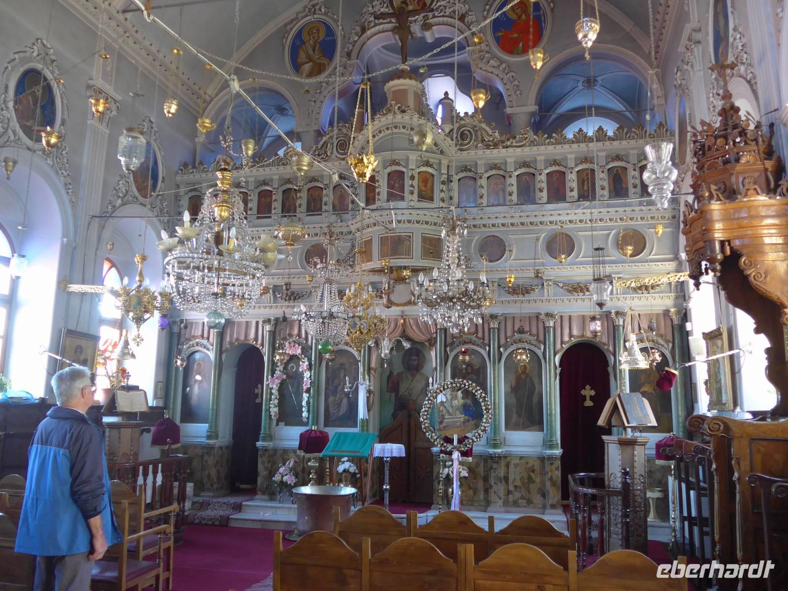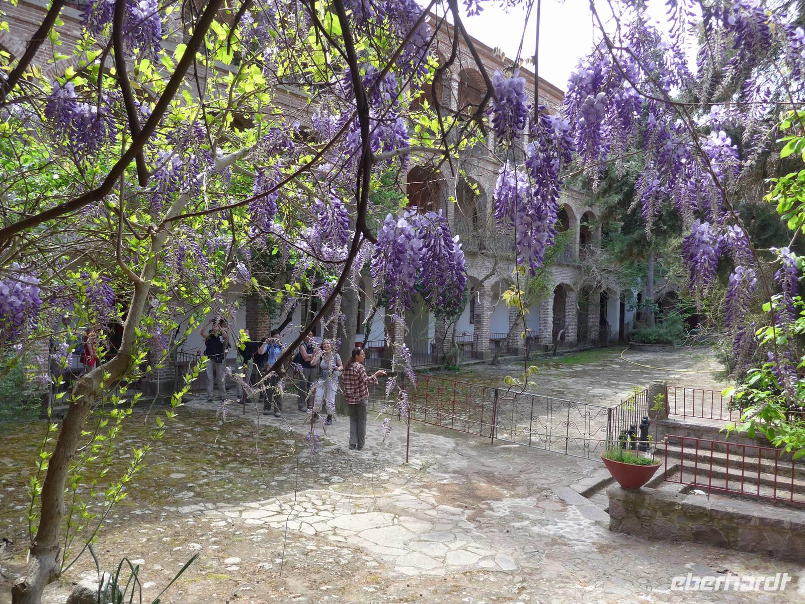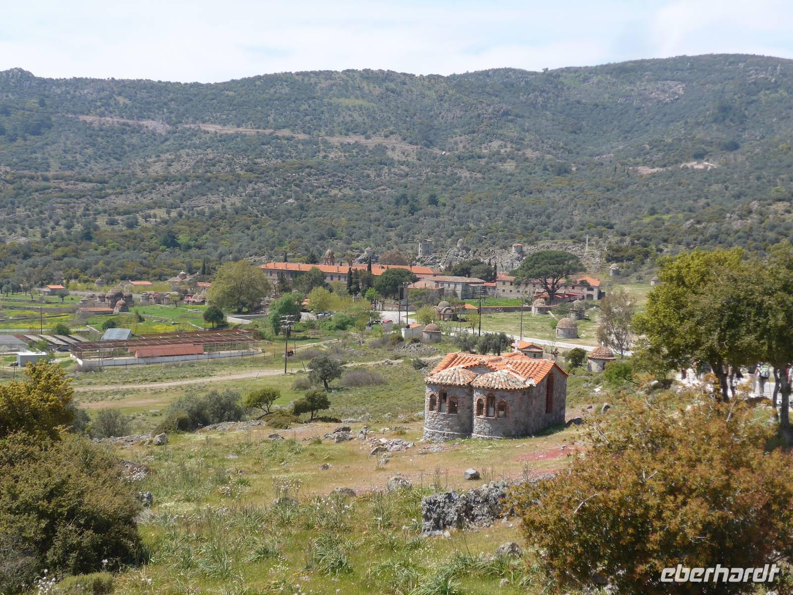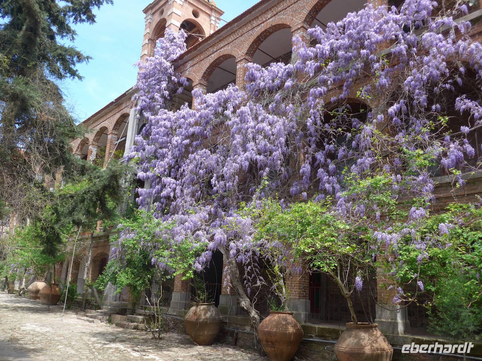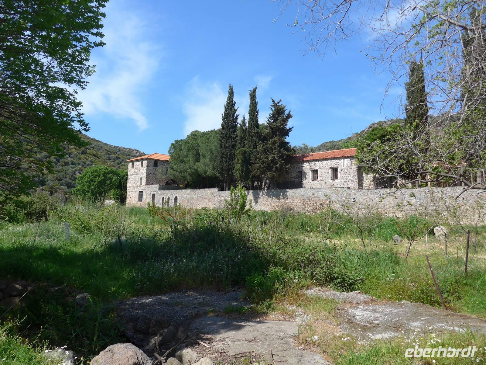 Nach dem Frühstück wurden unsere Koffer hinauf auf den Parkplatz an der Schule gefahren und in unseren Bus verladen. Eva und Flix fuhren mit dem Pkw. Das Inselinnere von Lesbos ist reich an Klöstern und diese Orte hatten in der Zeit der osmanischen Besatzung die Aufgabe, die griechische Sprache und Kultur zu pflegen. Auf einem alten Pilgerweg gesäumt von Orchideen erreichten wir zunächst das Frauenkloster Myrsiniotissas mit einem wunderschönen Garten und großen Pflanzkübeln im Innenhof. Wir machten Rast und besuchten das Kloster. Dann ging es weiter an 2 Klöstern vorbei in die Kalloni-Ebene zum Limonos Kloster. Das Limonos Kloster ist das größte und bedeutendste Kloster in der Ägäis und hat mehr als 100 kleine Kapellen in nächster Nähe. Im Klostercafe nahmen wir ein leichtes Mittagesssen ein und besichtigten dann die Innenhöfe des Klosters, die Zelle des hl. Ignatios und die Klosterkirche. Nun war es nicht mehr weit bis zum Metochi-Kloster, wo wir nochmals eine Rast einlegten und in der Klosterkirche die Heiligen mit Turbanen bestaunten. Wir liefen noch bis zu unserem Bus und waren dann ganz gespannt auf unsere neue Unterkunft am Golf von Gera.