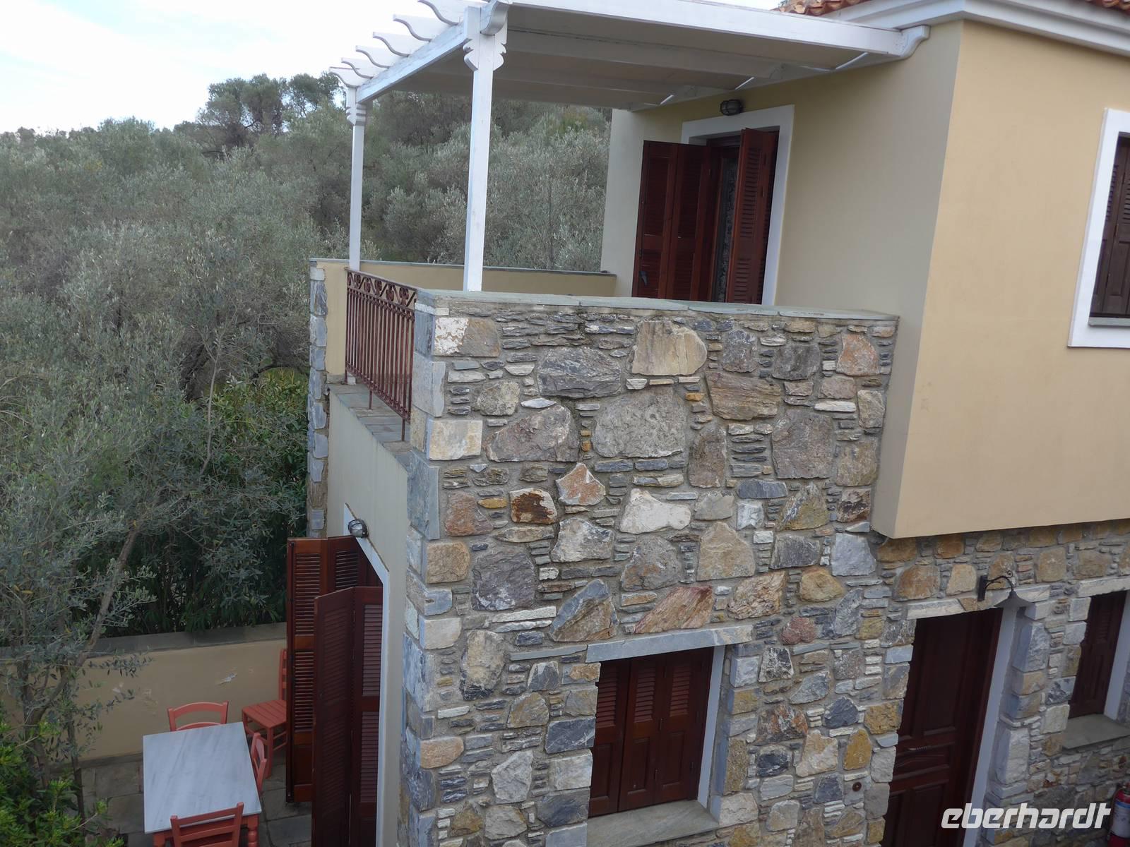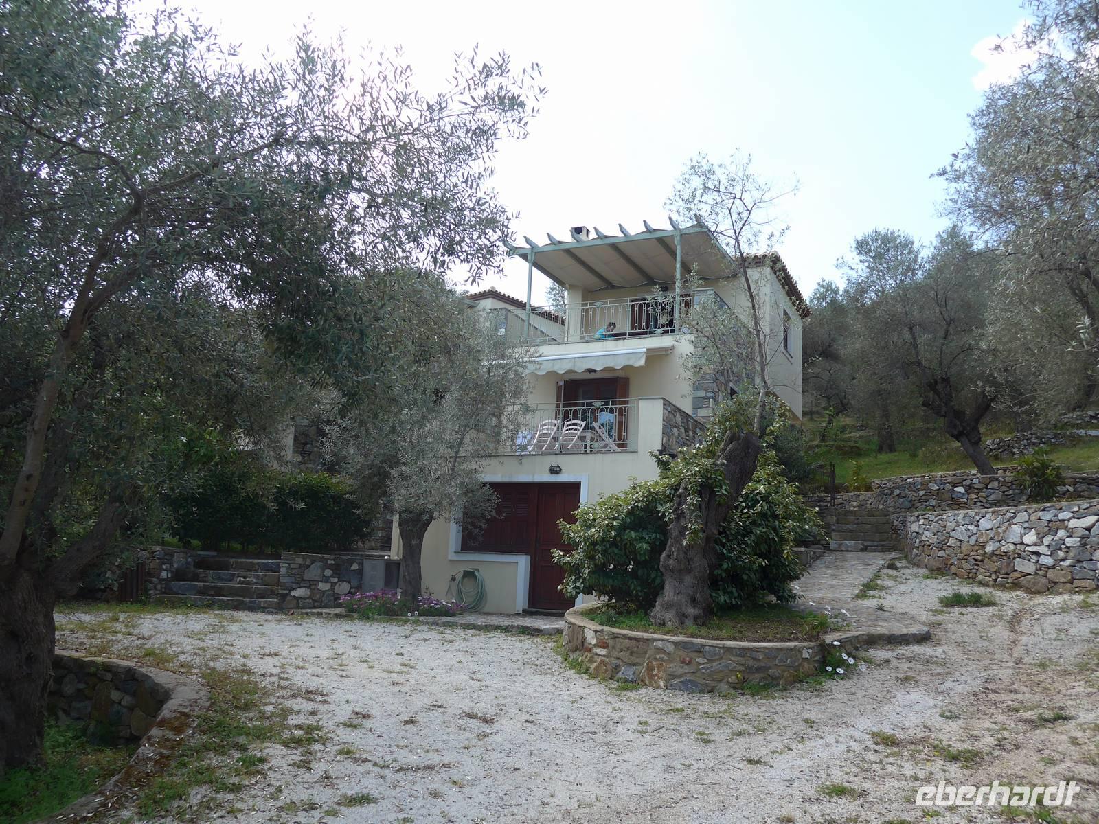 Gegen 17 Uhr erreichten wir den Olivenhain und verabschiedeten uns von unserem Fahrer Strato, der wieder nach Molivos zurück fuhr. Im "Olive Grove" wurden wir von Alesandro und seinen 3 Hunden schon erwartet. Das Verteilen der "Zimmer" ging recht flott und ich unternahm gleich einen Rundgang, um die unterschiedlichen Übernachtungsmöglichkeiten zu sehen. Das "Olive Grove" ist ein tolles Anwesen mit unterschiedlichen Häusern verteilt zwischen den Olivenbäumen. Sie wurden nach und nach gebaut und sind alle einzigartig. Wir fühlten uns alle sofort sehr wohl. Gegen 19 Uhr trafen wir uns wieder und spazierten in den Nachbarort in eine Taverne. Es gab Musaka, das typisch griechische Auflaufgericht, hervorragend zubereitet und sehr lecker !