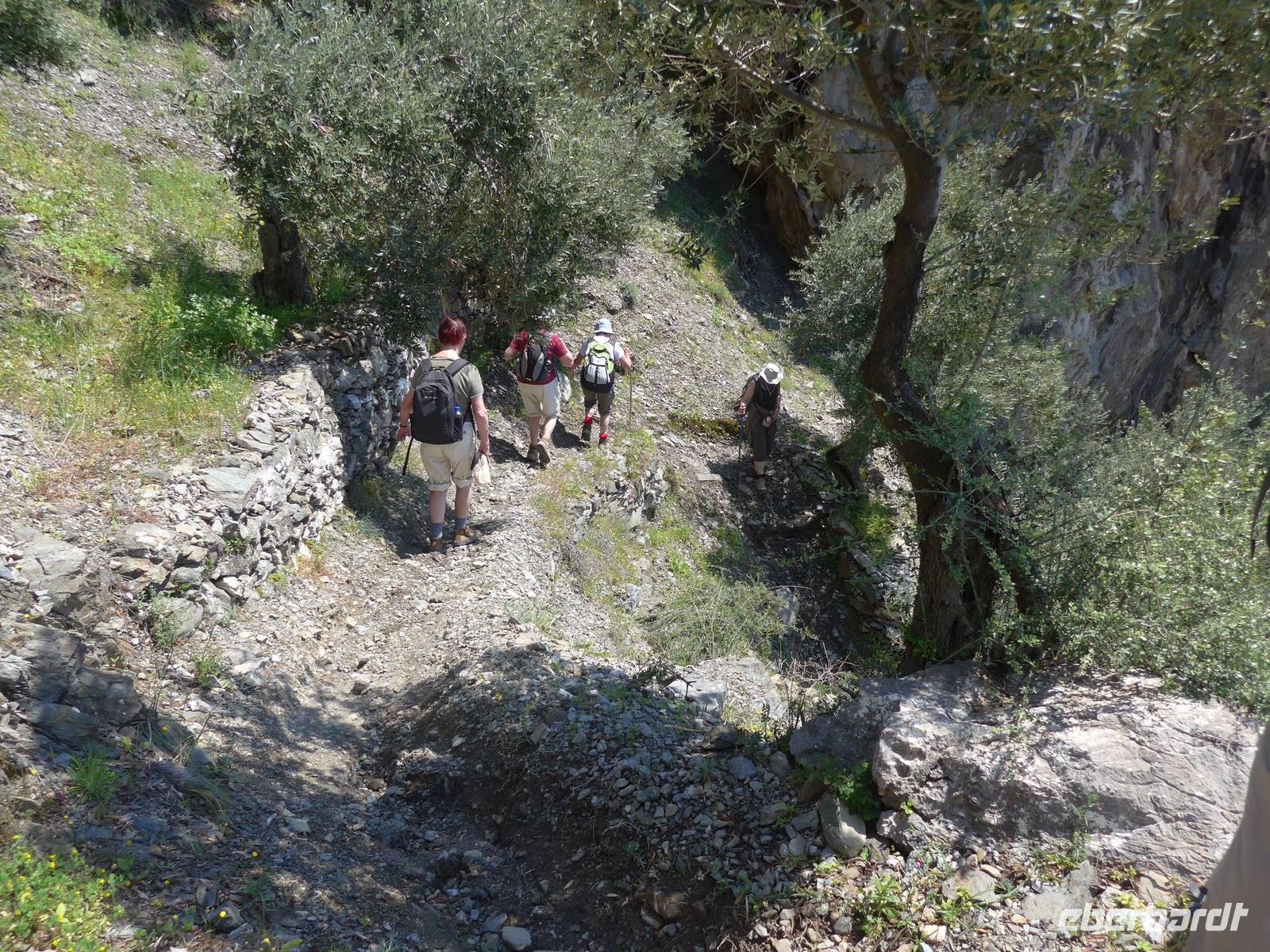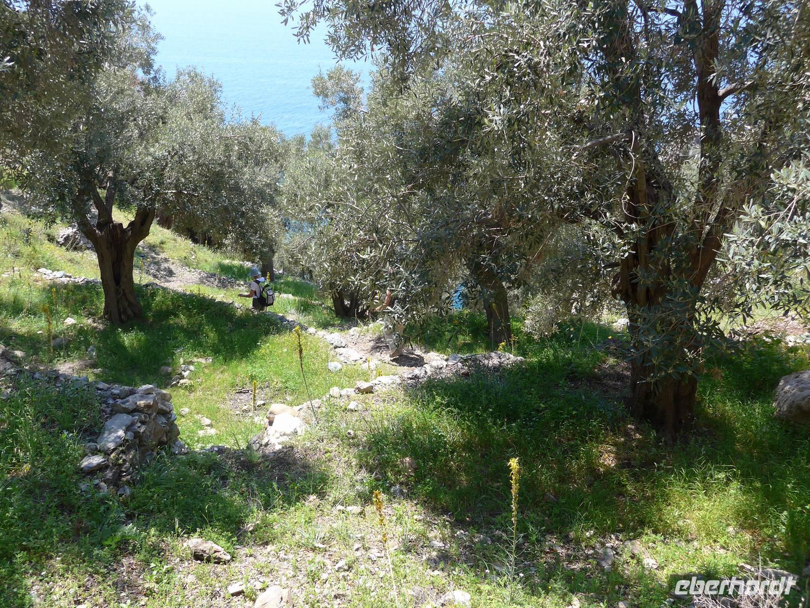 Das Frühstück im "Olive Grove" erinnerte mich an ein Frühstück bei Freunden. Frisch gepreßter Orangensaft, Rüherei, Spiegelei, selbst gemachte Marmeladen, frisch gebackener Kuchen, Brot, Wurst, Käse und wenn noch etwas fehlte ging man in die Küche und bestellte es. Alesandro und seine 2 Helfer hatten mit uns alle Hände voll zu tun. Wir genossen das Frühstück jeden Tag auf der Terrasse in absoluter Ruhe und tollem Ausblick auf den Golf und die Berge. Nun wartete aber unser Busfahrer und brachte uns zum Wanderausgangspunkt.