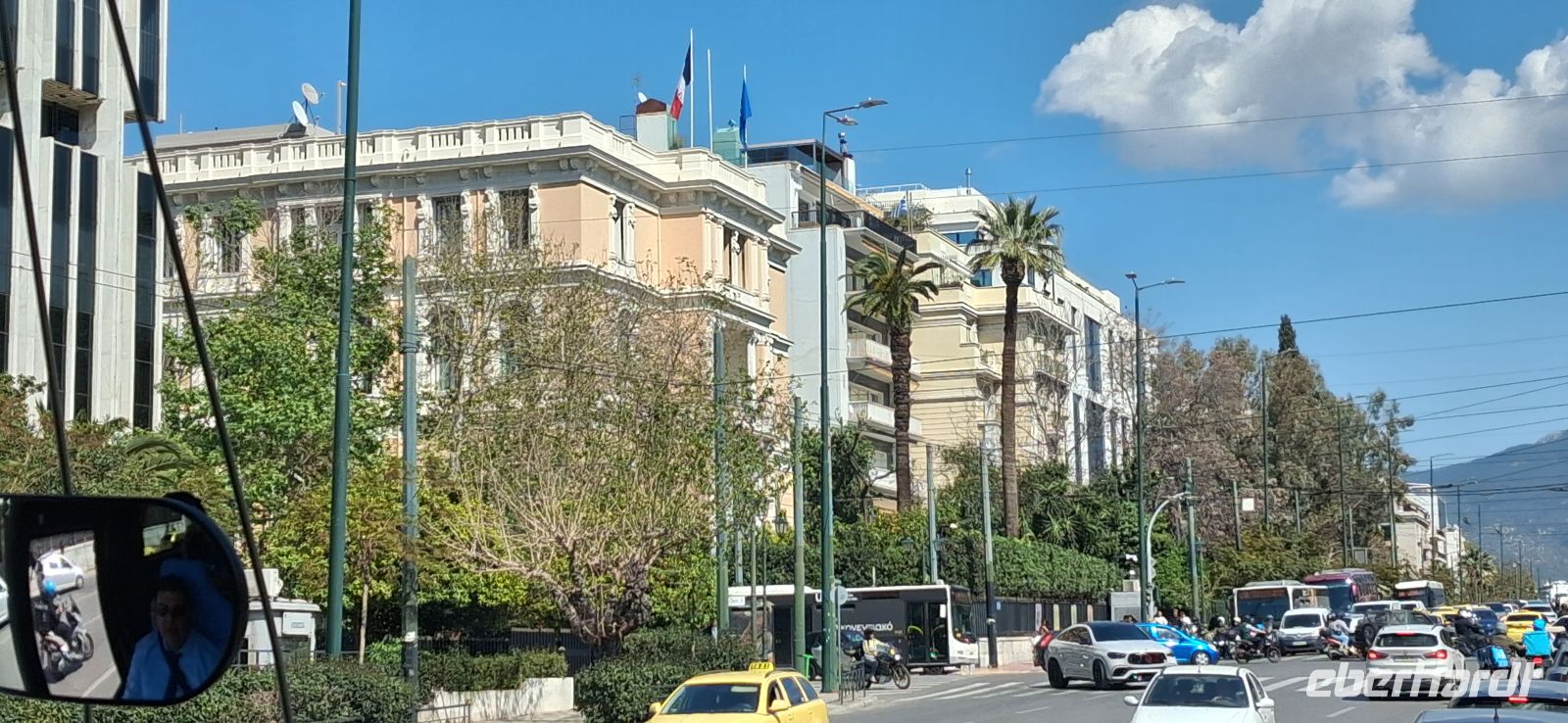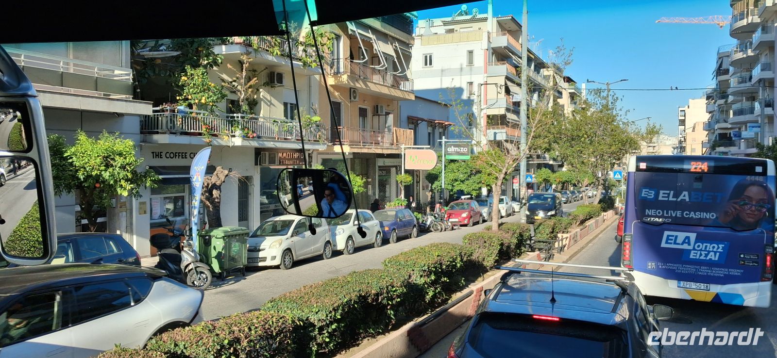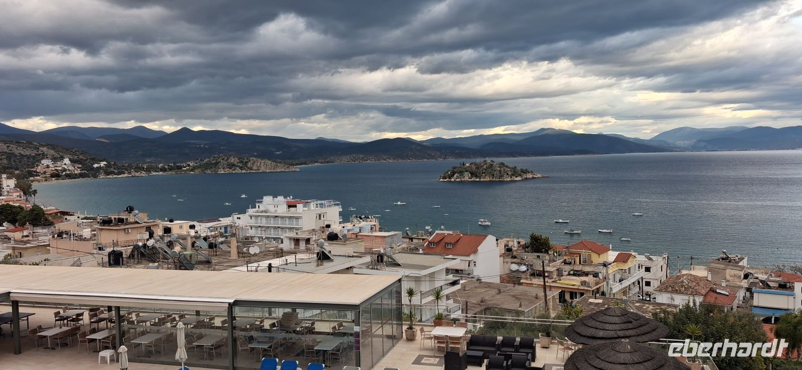 Jetzt ging es auf die Strecke zu unserem zweiten Hotel in Nea Makri/Attika - vorbei an Piräus und Athen, leider in der Hauptverkehrszeit. Auch das war ganz interessant zu erleben, wie Panos uns sicher und vor allem geduldig durch die verstopften Straßen und Staus manövrierte. Bravo! Schließlich erreichten wir unser Hotel, wieder direkt am Wasser, mit Blick auf den Petalionischen Golf und der großen Insel Eubea im Hintergrund.