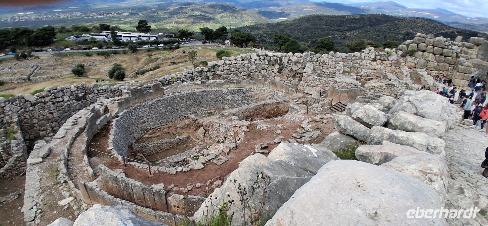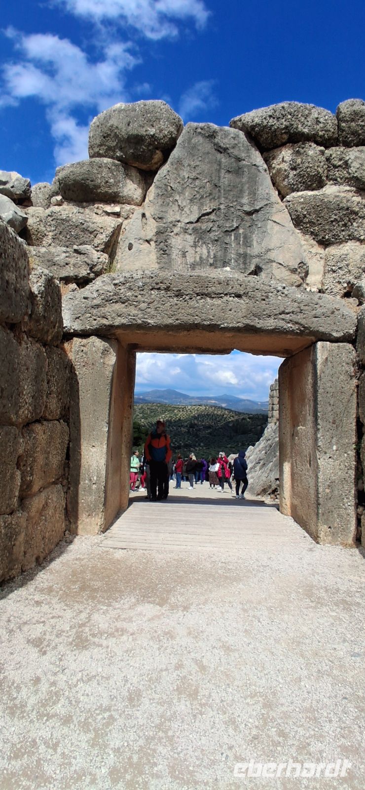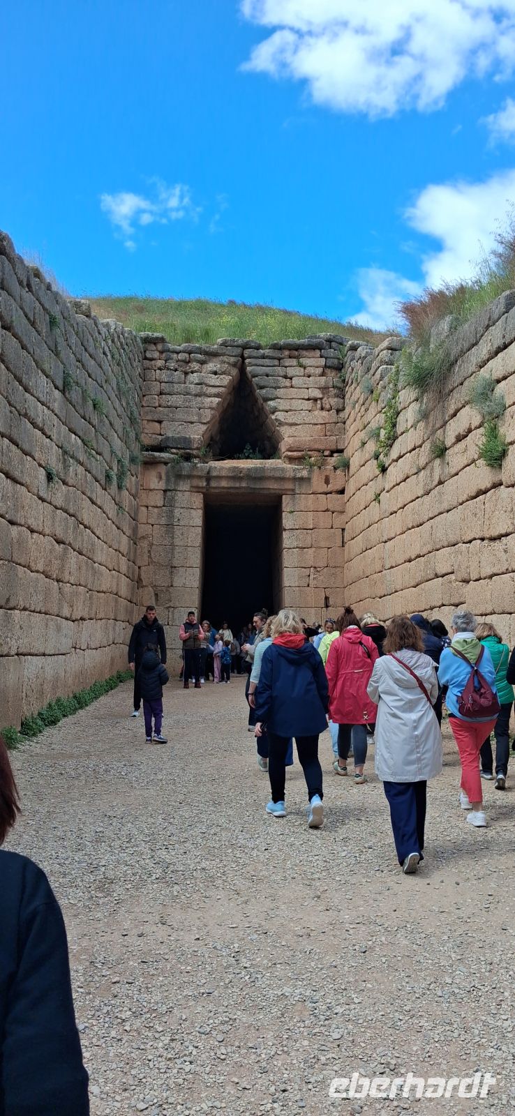 Weiter ging es nun aber mit griechischer Kultur. Auf dem Programm standen die Ausgrabungen von Heinrich Schliemann . Mykene. RL Aris war in seinem Element, als er uns die Entstehung und die Sage rund um die Zyklopische Ringmauer erläuterte, uns weiter durch das Löwentor und dann gleich rechts dahinter zu einer der bedeutendsten Ausgrabungen Griechenlands führte: die Königsgräber, die Ausgrabungen aus der vorklassischen zeit, die heute auf der UNESCO-Liste des Weltkulturerbes stehen. Anschließend gab es noch freie Zeit, die Zitadellen zu besteigen und in eigenem Tempo die bedeutenden Ausgrabungen zu fotografieren. Aber davon nicht genug: RL Aris stoppte den Bus nochmals nur einige hundert Meter weiter am Kuppelgrab aus der gleichen Zeit, dem Schatzhaus des Atreus. Bezeichnend dafür der Bienenkorb-ähnliche Bau mit einem schluchtartigen Zugang und einem kleinen Tor und einem kleinen Nebenraum (aus ungewöhnlich in der Zeit war).
