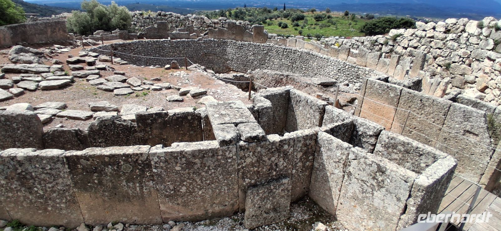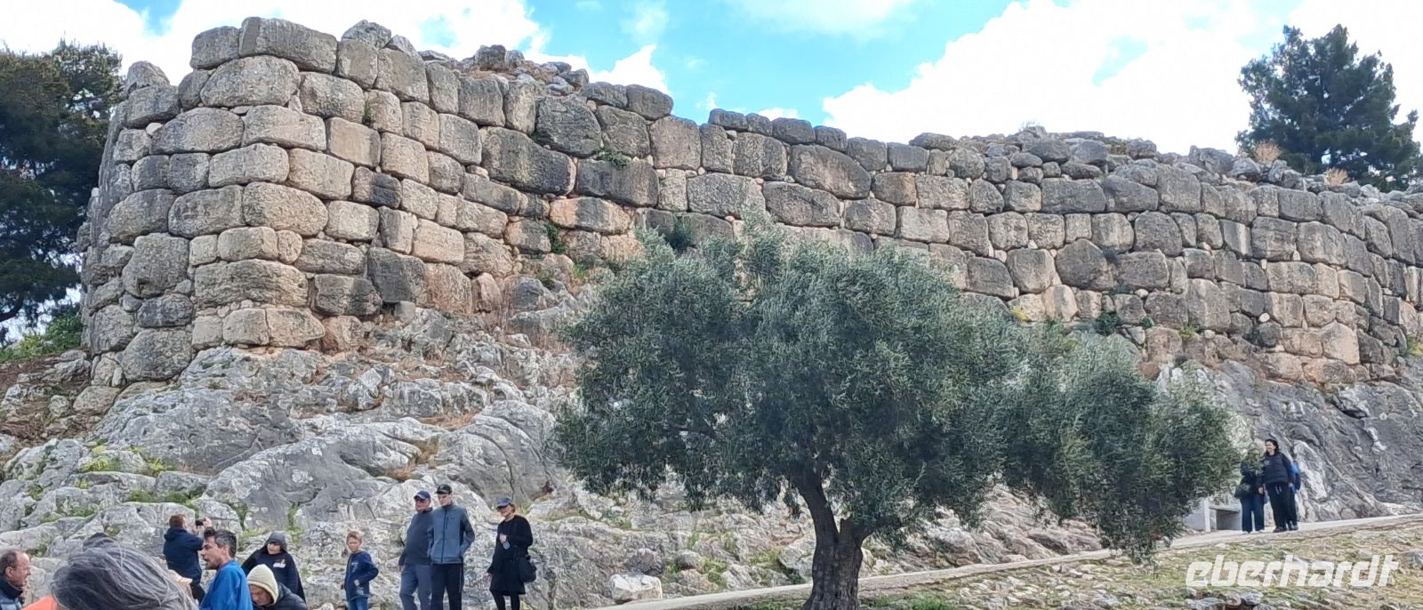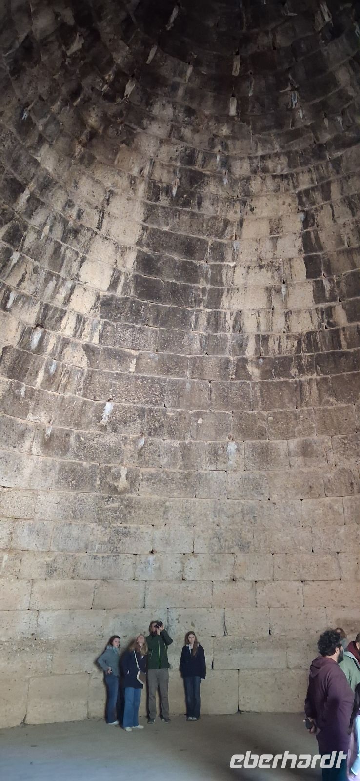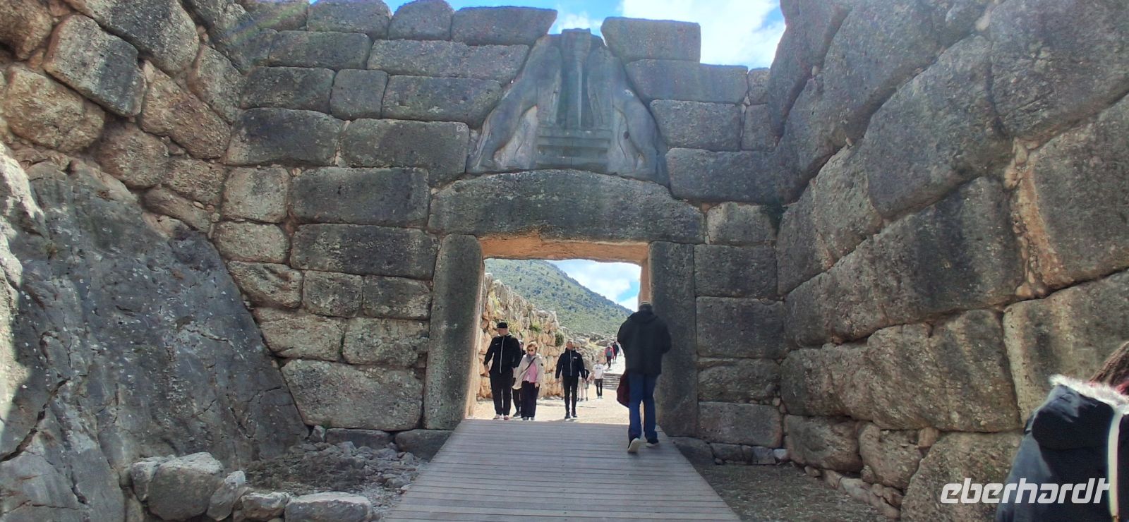 Weiter ging es nun aber mit griechischer Kultur. Auf dem Programm standen die Ausgrabungen von Heinrich Schliemann . Mykene. RL Aris war in seinem Element, als er uns die Entstehung und die Sage rund um die Zyklopische Ringmauer erläuterte, uns weiter durch das Löwentor und dann gleich rechts dahinter zu einer der bedeutendsten Ausgrabungen Griechenlands führte: die Königsgräber, die Ausgrabungen aus der vorklassischen zeit, die heute auf der UNESCO-Liste des Weltkulturerbes stehen. Anschließend gab es noch freie Zeit, die Zitadellen zu besteigen und in eigenem Tempo die bedeutenden Ausgrabungen zu fotografieren. Aber davon nicht genug: RL Aris stoppte den Bus nochmals nur einige hundert Meter weiter am Kuppelgrab aus der gleichen Zeit, dem Schatzhaus des Atreus. Bezeichnend dafür der Bienenkorb-ähnliche Bau mit einem schluchtartigen Zugang und einem kleinen Tor und einem kleinen Nebenraum (aus ungewöhnlich in der Zeit war).