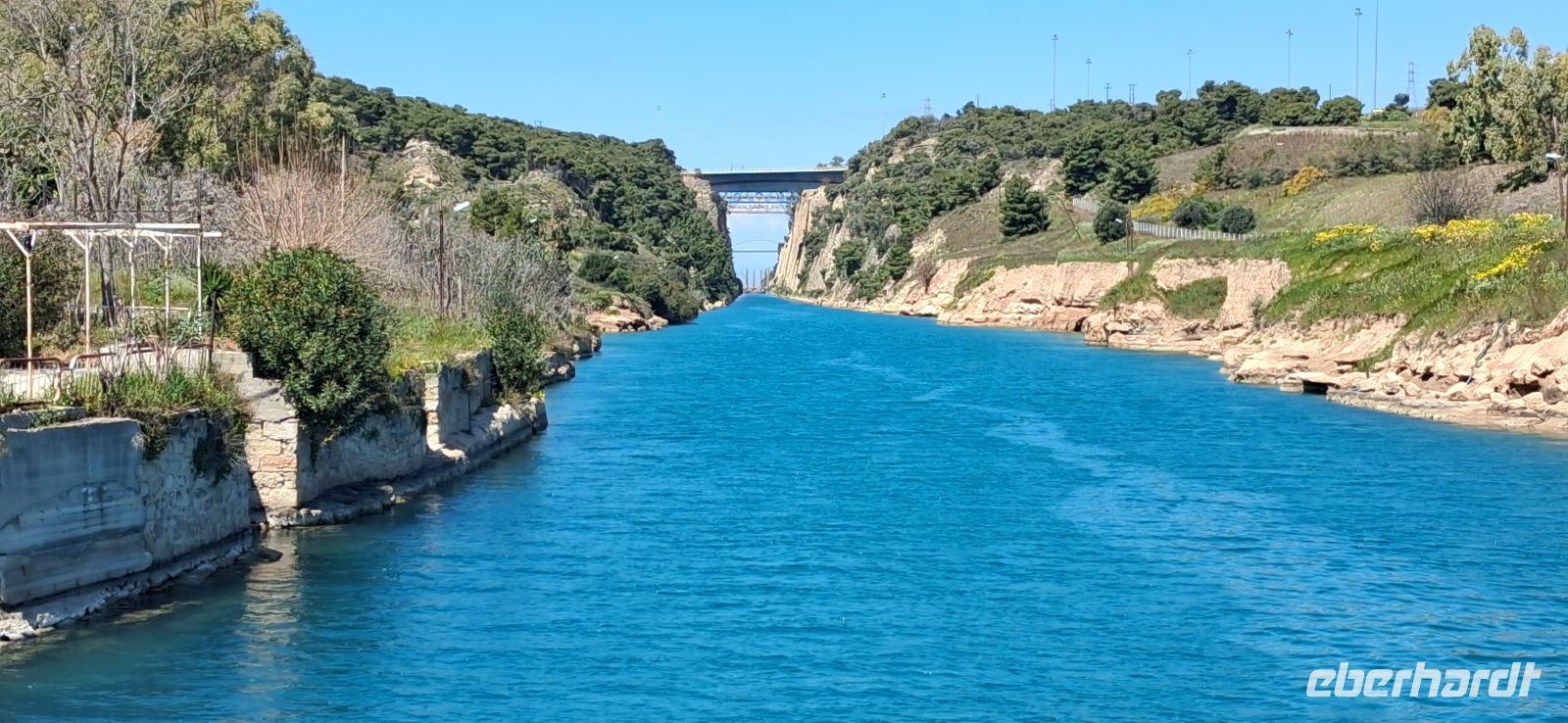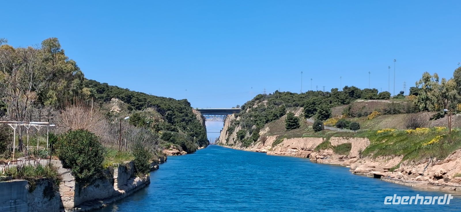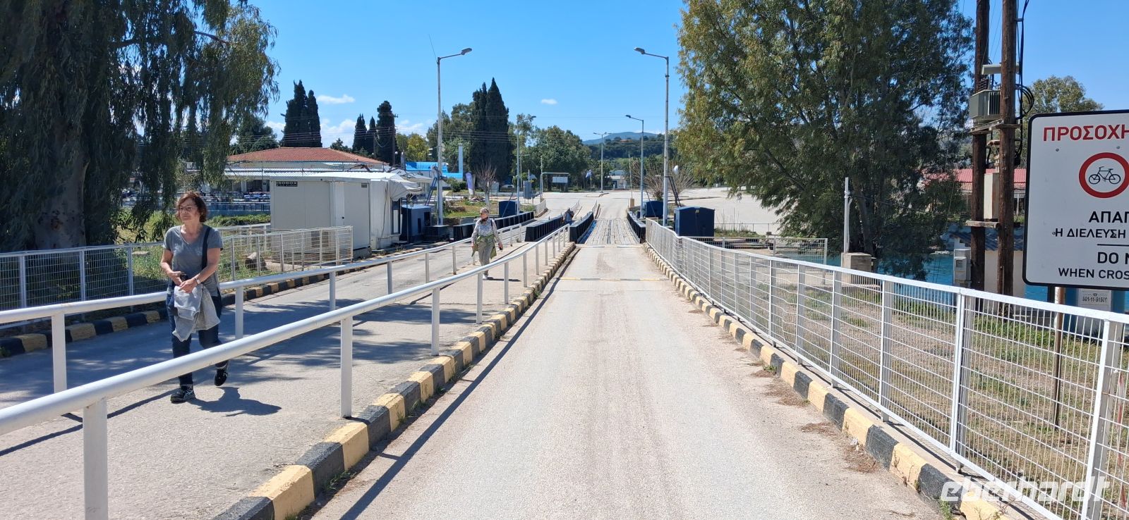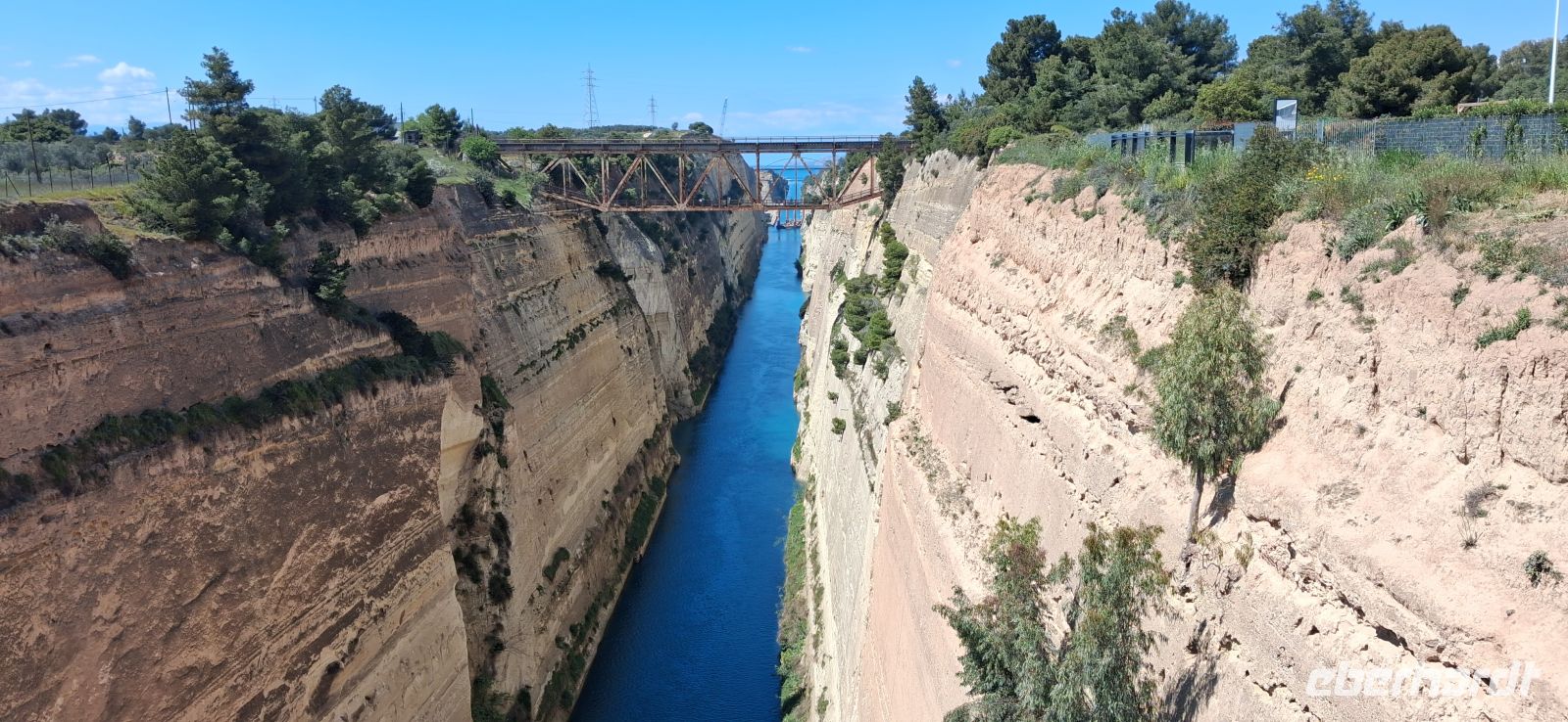Die Mittagspause verbrachten wir an einem spektakulären Ort (dank RL Aris), und zwar am Eingang des Kanals vom Saronischen Golf, bei der alten Brücke. Diese Brücke, über die der Bus nicht fahren durfte, ist beweglich und wird abgesenkt ins Wasser, wenn Schiffe in den Kanal einfahren wollen. Dieses Schauspiel konnten wir wären des Essens miterleben. Dort gab es eine Taverne, wo wir wieder Kleinigkeiten, typisch griechisch, essen konnten. Sehr außergewöhnlich! Nach dem Essen spazierten wir wieder über die Brücke, die wieder aus dem Wasser hochgefahren war, zum Bus. Panos fuhr uns wieder hoch zu der neuen Brücke, wir überquerten den Kanal und stoppten auf der Festlandseite, um den spektakulären Kanal auch von oben zu fotografieren.