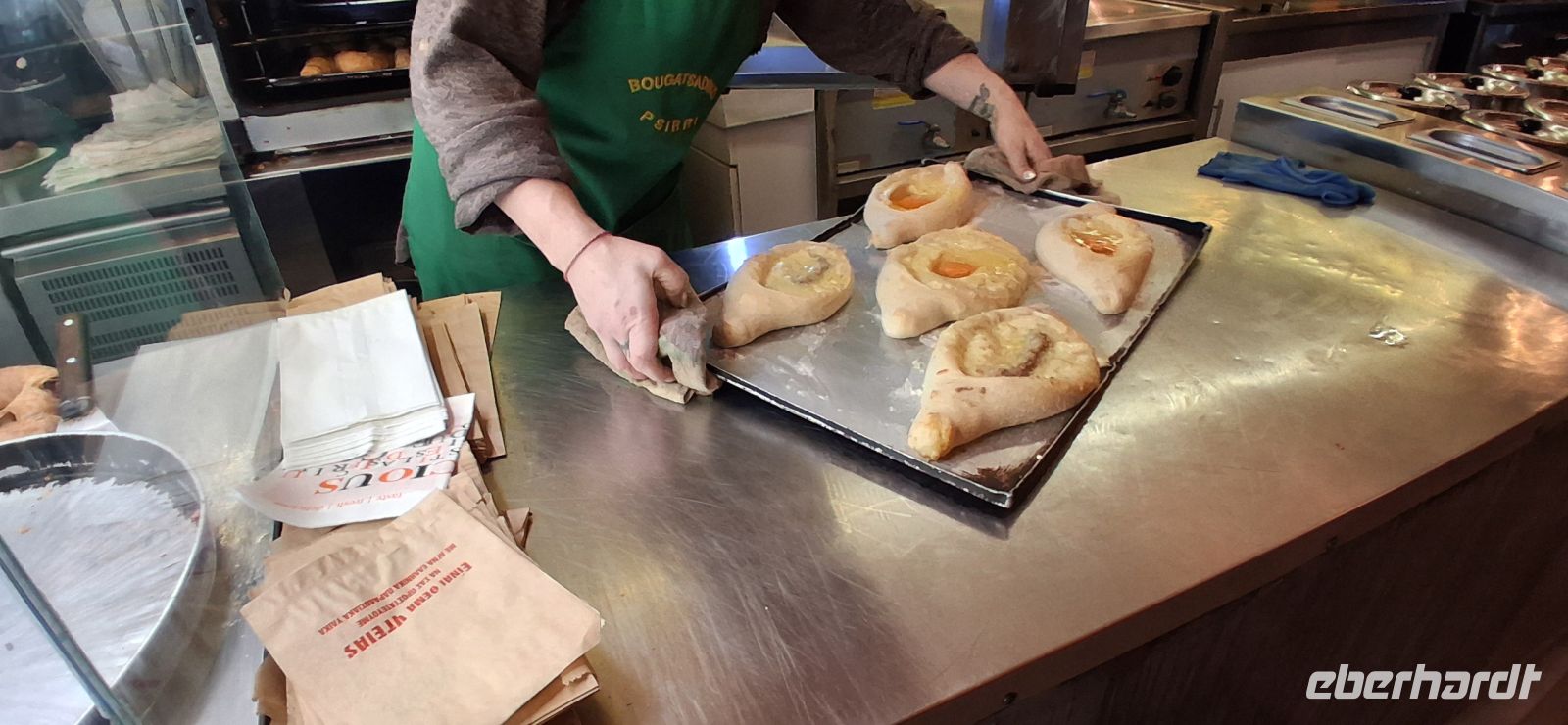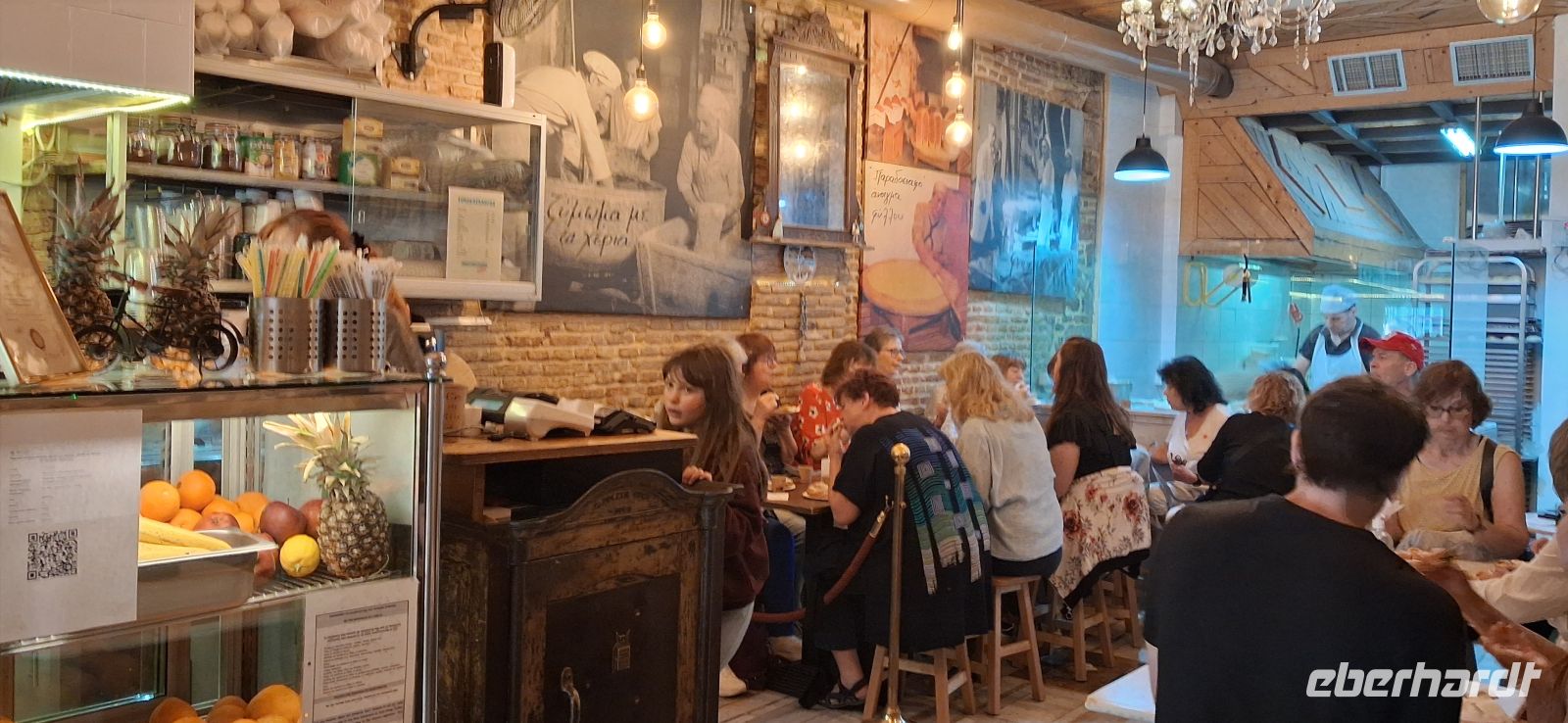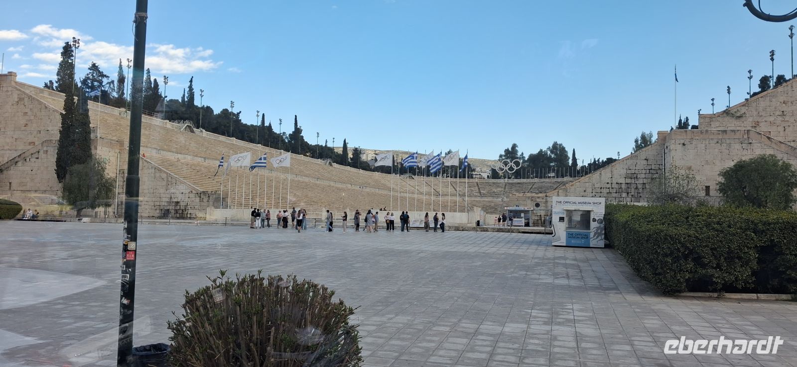 Mit allen den Eindrücken dieser gewaltigen Anlage ging es dann hinunter in die Altstadt von Athen, vorbei an weiteren antiken Sehenswürdigkeiten, und dann hinein in die geschäftigeren, neueren Bereiche der Stadt. Am Manastraki-Platz legten wir einen Stop ein, um diesen zentralen Platz als Treffpunkt zu vereinbaren nach dem Besuch eines traditionellen Bougatsa-Ladens, wo wir gemeinsam diese typisch griechische Spezialität aus Blätterteig probieren und essen konnten. - Sehr urig, sehr gesellig der Laden: es gab Bougatsa mit Kaffee und einem kleinen Likör. Aris erklärte noch, wie man am schnellsten und sichersten zurück zum Manastraki kommt - dann war Freizeit und Mittagspause. - Zur vereinbarten Zeit waren dann auch alle Gäste wieder am Treffpunkt und die Führung konnte weitergehen. Nun standen die zentralen Markthallen auf dem Programm. Aris geleitete uns sicher durch die Straßen, gab eine kurze Einführung zu der Bedeutung des Marktes für die Gastronomie der Stadt und entließ uns, um die riesigen Hallen im eigenen Tempo und Interesse zu erkunden. Ein Treffpunkt, den alle finden konnten, war vereinbart, wo uns dann Panos mit unserem Bus abholte, um die Stadtrundfahrt fortzuführen. Viele hochinteressante Punkte in Athen konnten wir leider nur vom Bus aus sehen, da es nicht mehr erlaubt ist für Busse anzuhalten. So beim Panathinaico- Stadion, in dem heute noch 65.000 Menschen Platz finden, und wo alle vier Jahre das Olympische Feuer, das nach der Entzündung in Olympia von Fackelträgern hier her gebracht wird, an das offizielle Olympische Komitee übergeben wird. Oder die Athena Trilogie, drei klassizistische Bauten, die National-Bibliothek, die Kapodistrias Universität und die Akademie, oder das Hadrians-Tor und so vieles andere mehr, das es in Athen zu sehen gibt. - Das Gute dabei: viele waren auch schon so voll von Eindrücken, so müde vom Aufstieg/Abstieg zur Akropolis und Laufen durch die Straßen Athens, dass sie froh waren zu sitzen. Also machten wir uns nach alle diesen Erlebnisen auf den Weg zurück ins Hotel in Mati, wo noch Zeit war ein bisschen auszuruhen, bevor es wieder ein leckeres Abendbuffet gab.