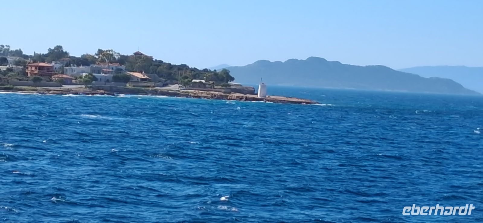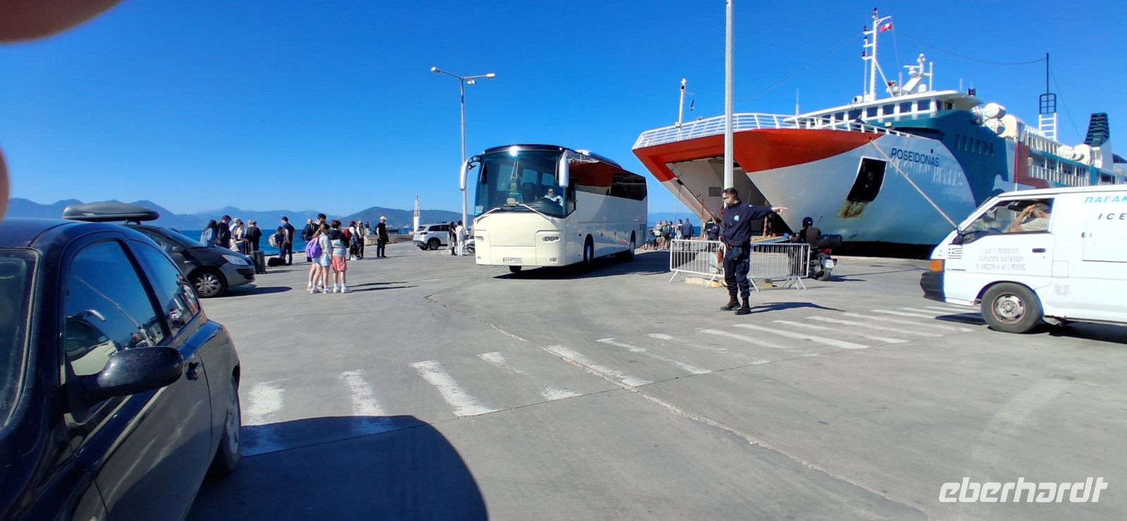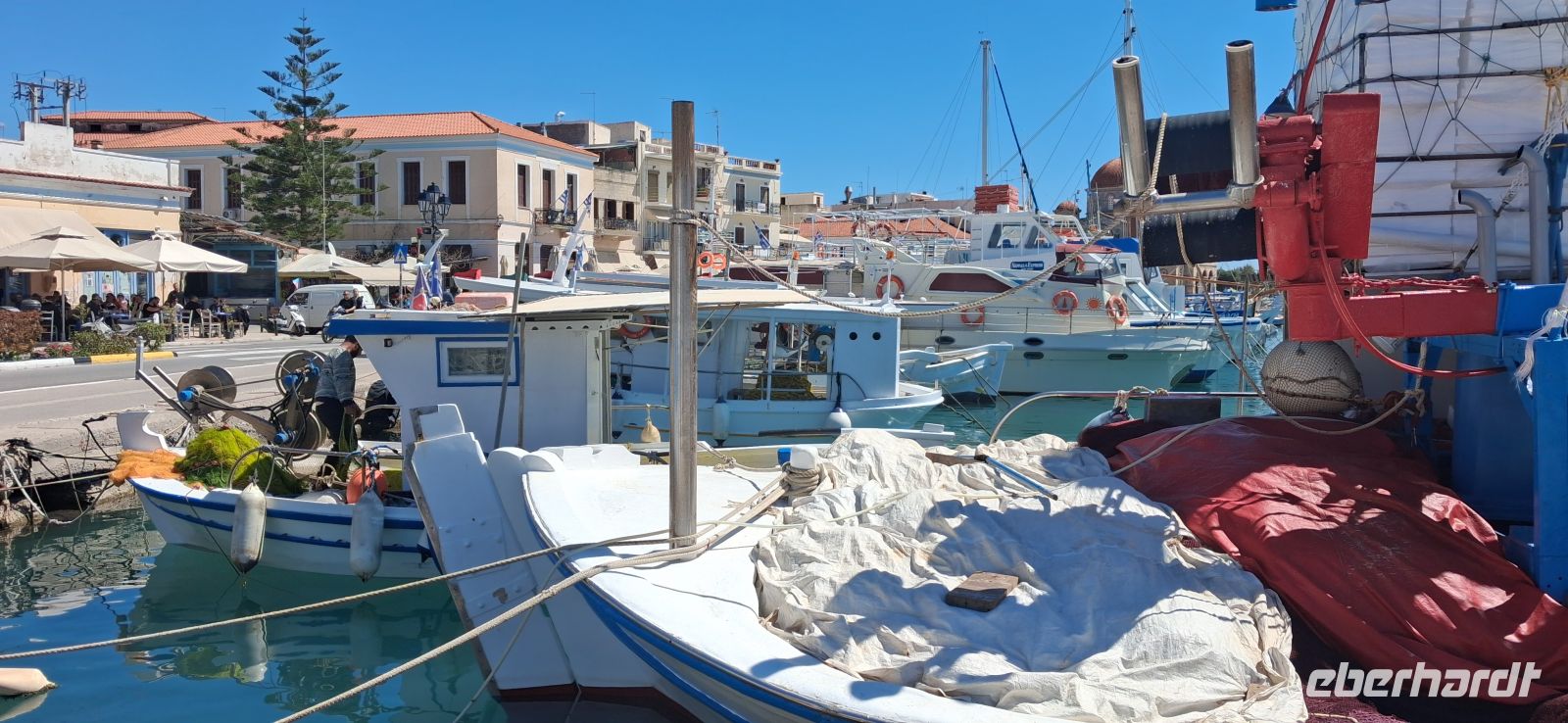 Aber dann ging es zum gemütlicheren Teil der Tagesreise: Freizeit an der Wasserlinie des Hauptortes der Insel mit netten Restaurants und Cafes -und Verkaufsständen für Pestazien und -produkten. Aris bot eine kleine Führung im Hafenstädtchen an, dann verteilten sich sie Gäste nach eigenem Gusto im Ort und treffen sich zum vereinbarten Zeitpunkt und pünktlich zur Rückfahrt ans Festland im Hafen.