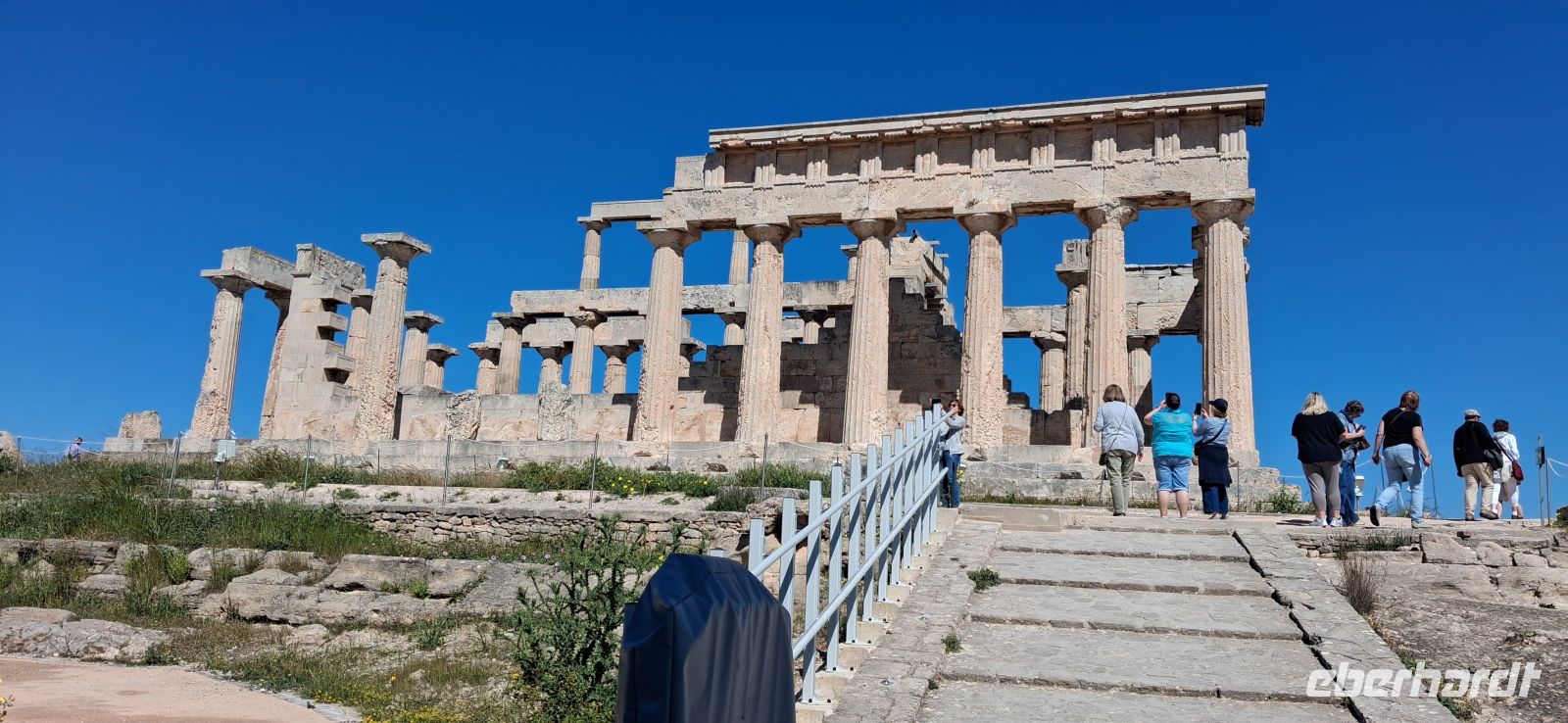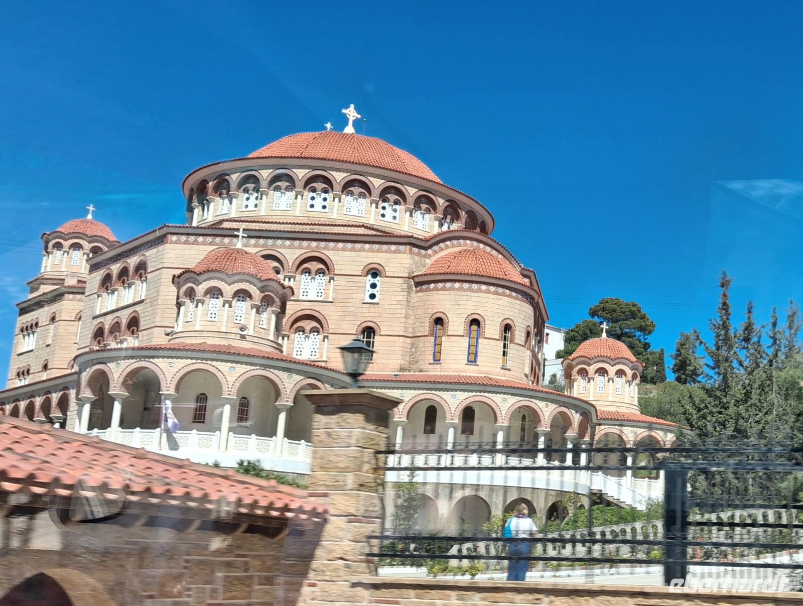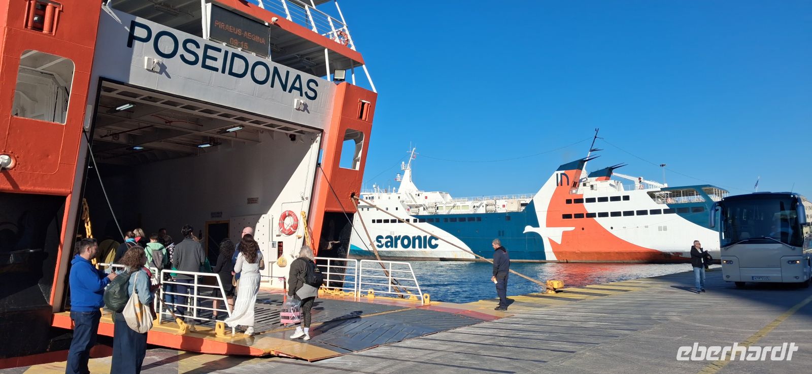 Frühstück, extra für uns, schon ab 06.30 h, weil wir um 07.30 h schon abfahren müssen, um unsere Fähre von Piräus auf die Insel Ägina zu erreichen. Im Fährhafen von Piräus gab es viel zu sehen, aber erst sollten wir und unser Bus auf die Fähre. Alle fanden gute Plätze, draussen oder im Salon der Fähre, und nach etwas mehr als einer Stunde, nach einer angenehm ruhigen Überfahrt, gingen wir von Bord und gleich am Anleger konnten wir in unseren Bus steigen und unsere Inselrundfahrt beginnen. Gleich ging es bergauf, vorbei an der schönen Kathedrale des heiligen Nektarios direkt an der Straße, und weiter hinauf vorbei am Nonnenkloster Chryssoleodissa. Immer wieder gab es Ausblicke über die Insel und das Ägäische Meer. - Erstes Ziel war Tempel der Aphaia, der Schutzgöttin der Insel, ein gut erhaltener und restaurierter kleiner Tempel mit einem kleinen, aber auch sehr schönen Museum. Aris erklärte wie gewohnt mit besten Sachkenntnissen den Tempel und die Geschichte dazu, sowie die ausgestellten Kostbarkeiten im Museum.