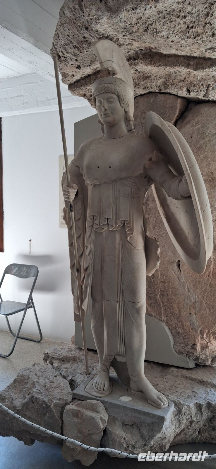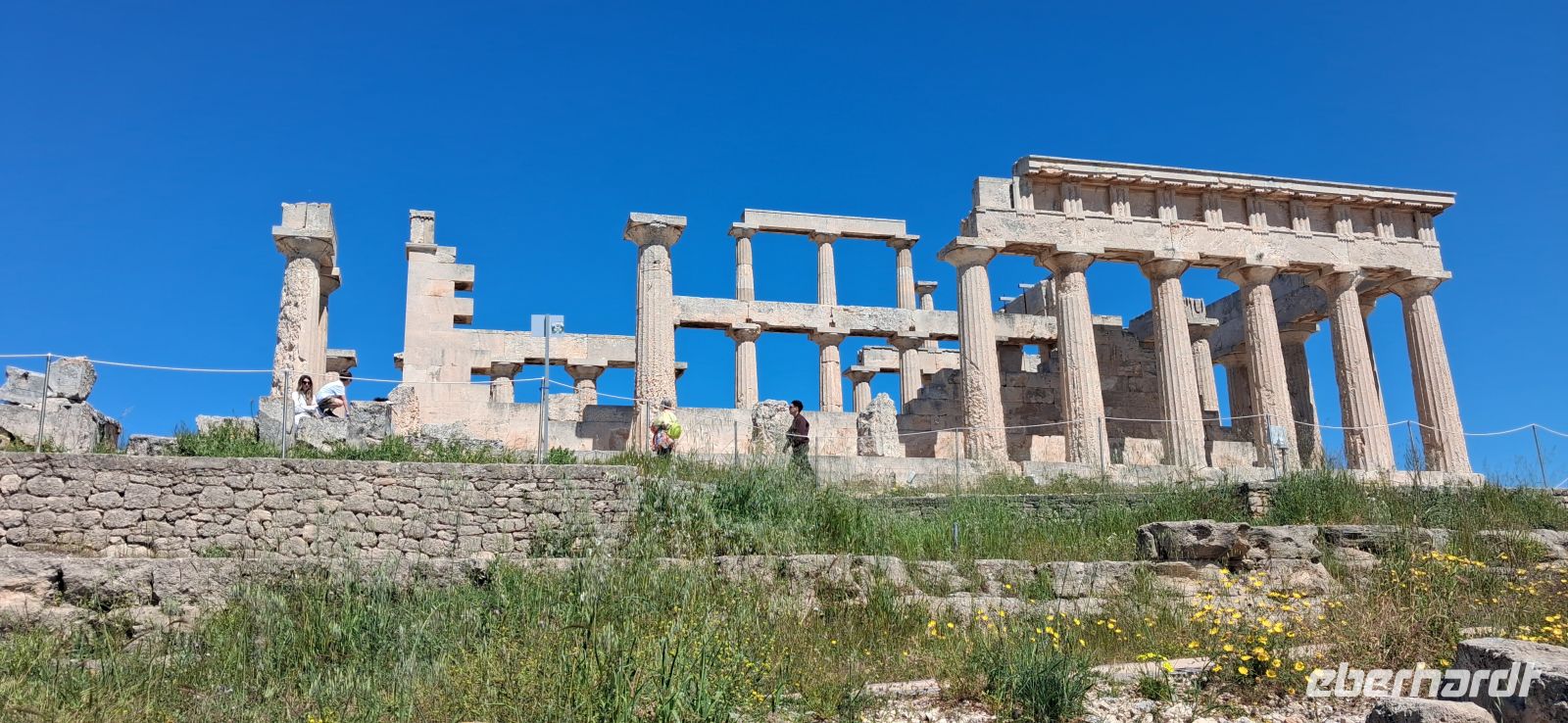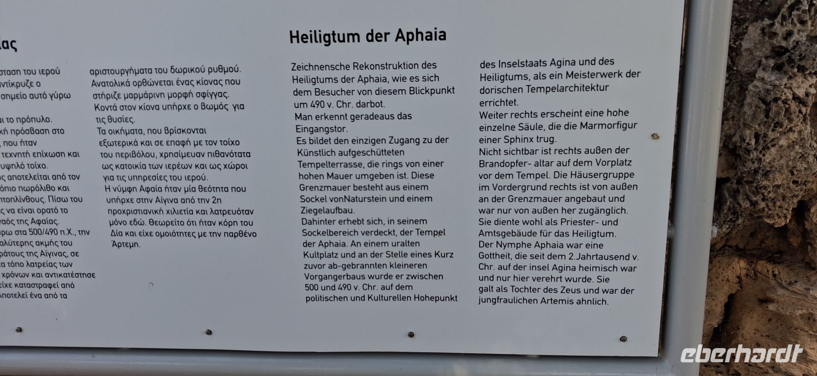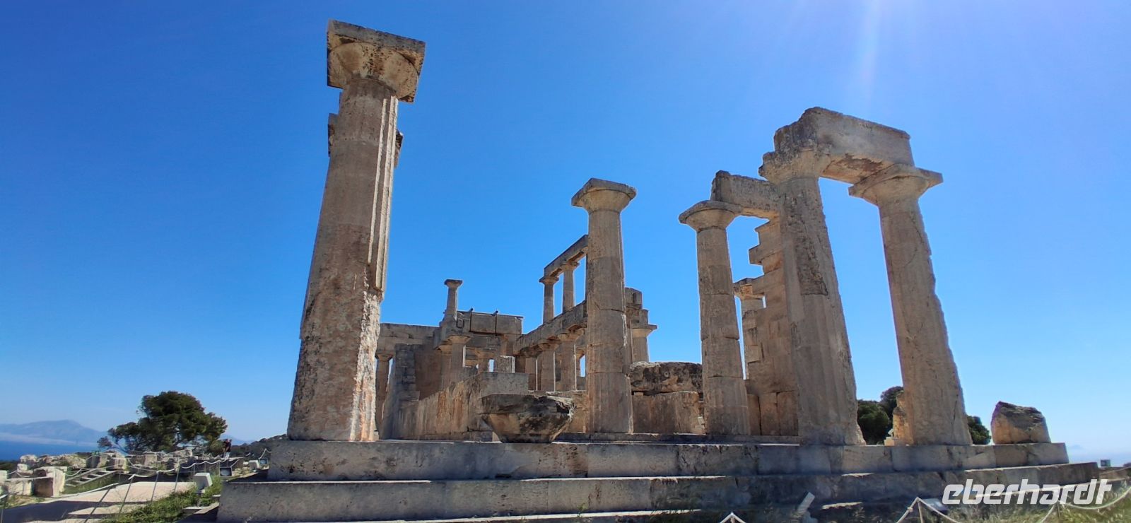 Frühstück, extra für uns, schon ab 06.30 h, weil wir um 07.30 h schon abfahren müssen, um unsere Fähre von Piräus auf die Insel Ägina zu erreichen. Im Fährhafen von Piräus gab es viel zu sehen, aber erst sollten wir und unser Bus auf die Fähre. Alle fanden gute Plätze, draussen oder im Salon der Fähre, und nach etwas mehr als einer Stunde, nach einer angenehm ruhigen Überfahrt, gingen wir von Bord und gleich am Anleger konnten wir in unseren Bus steigen und unsere Inselrundfahrt beginnen. Gleich ging es bergauf, vorbei an der schönen Kathedrale des heiligen Nektarios direkt an der Straße, und weiter hinauf vorbei am Nonnenkloster Chryssoleodissa. Immer wieder gab es Ausblicke über die Insel und das Ägäische Meer. - Erstes Ziel war Tempel der Aphaia, der Schutzgöttin der Insel, ein gut erhaltener und restaurierter kleiner Tempel mit einem kleinen, aber auch sehr schönen Museum. Aris erklärte wie gewohnt mit besten Sachkenntnissen den Tempel und die Geschichte dazu, sowie die ausgestellten Kostbarkeiten im Museum.