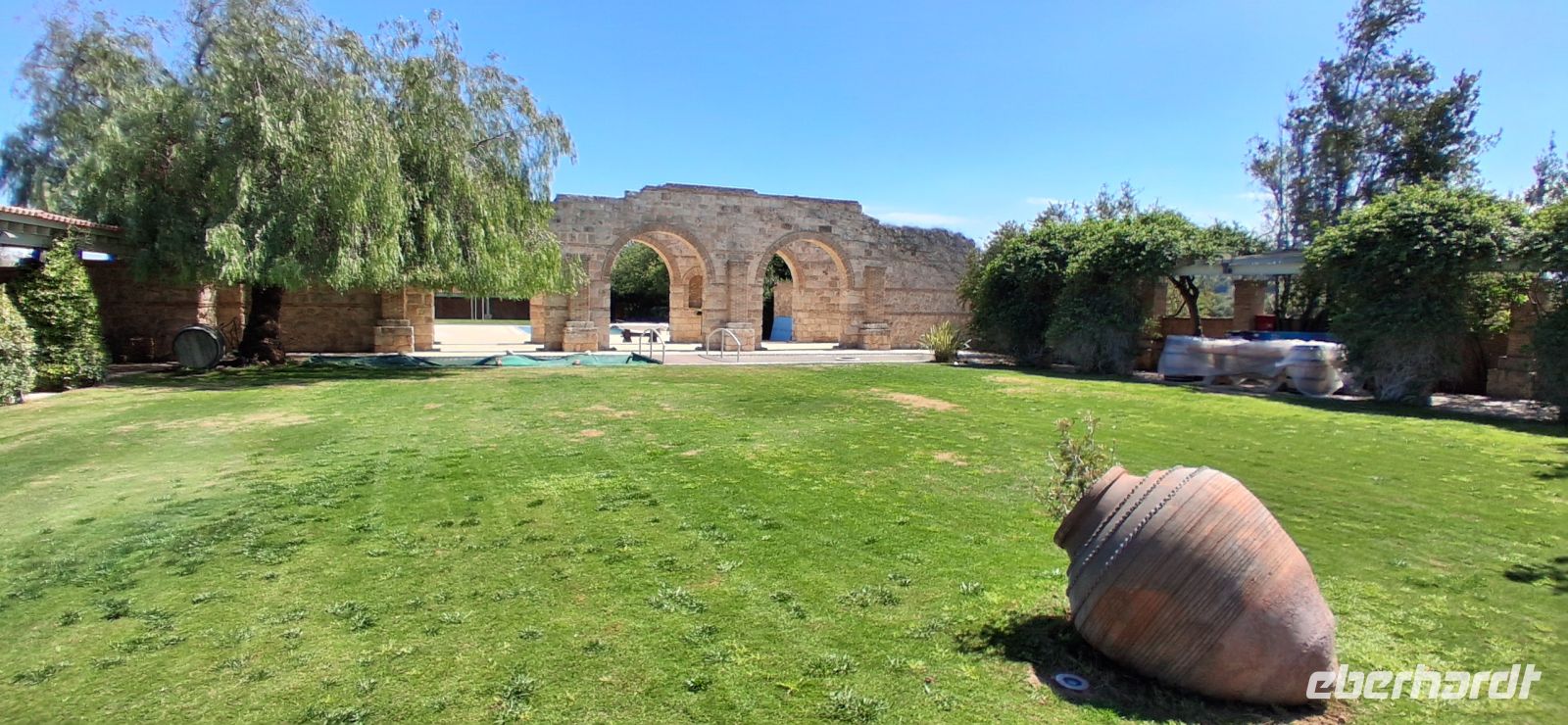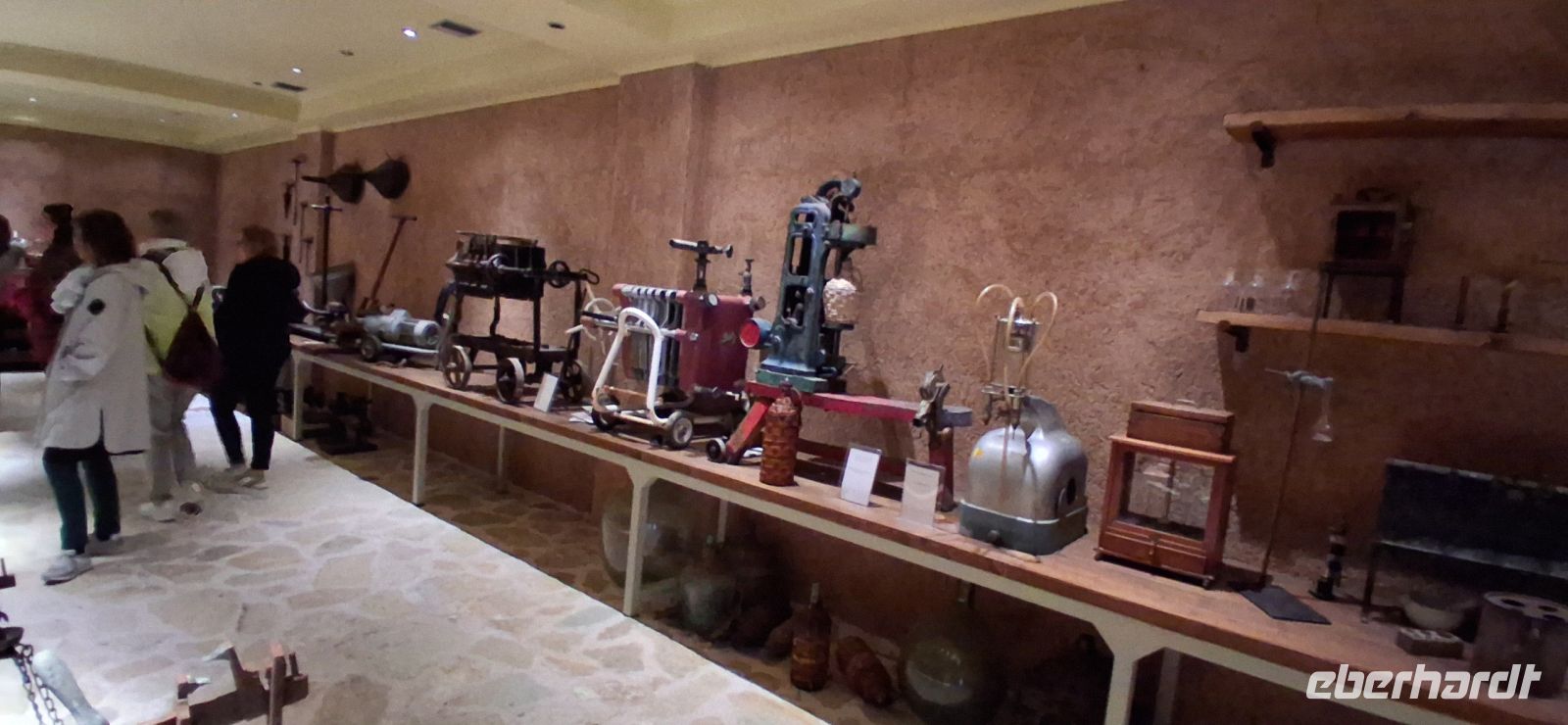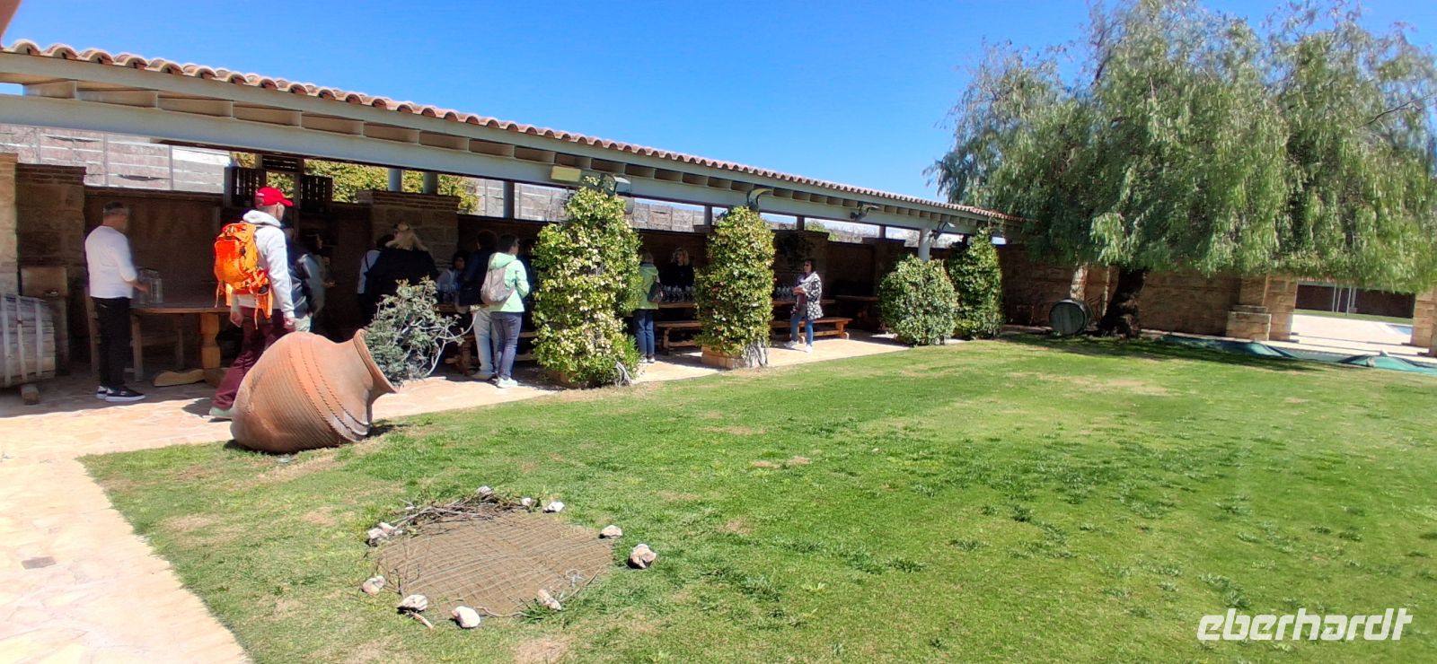 Nach so viel kulturellem Input hatten wir es verdient, noch einen entspannten Besuch in der traditionellen OUZO-Destillerie KARONIS zu erleben. Aber vor der Verkostung steht die Besichtigung der produktion und des kleinen Museums. Der Inhaber erklärte, beantwortete Fragen, und RL Aris übersetzte. Dann war es soweit: unter überdachten, schattigen Plätzen, aber im Freien gab es drei Produkte zu kosten: Tsipouro, immer aus Trester destilliert (ähnlich Grappa in Italien), Ouzo, auch meist aus Trester, aber -bei den großen industriellen Marken oft auch mit pflanzlichen Stoffen (Getreide, Melasse etc.) hergestellt wird. Beide Produkte gibt es ohne und mit Anis aromatisiert. Dann den Likör Masticha, der nicht so hochprozentig ist und mit Mastixharz aromatisiert wird. Alle Sorten wurden uns serviert, und die Gläser nicht zu knapp befüllt.... Ein total entspannter Ausklang des Besuchsprogrammes.