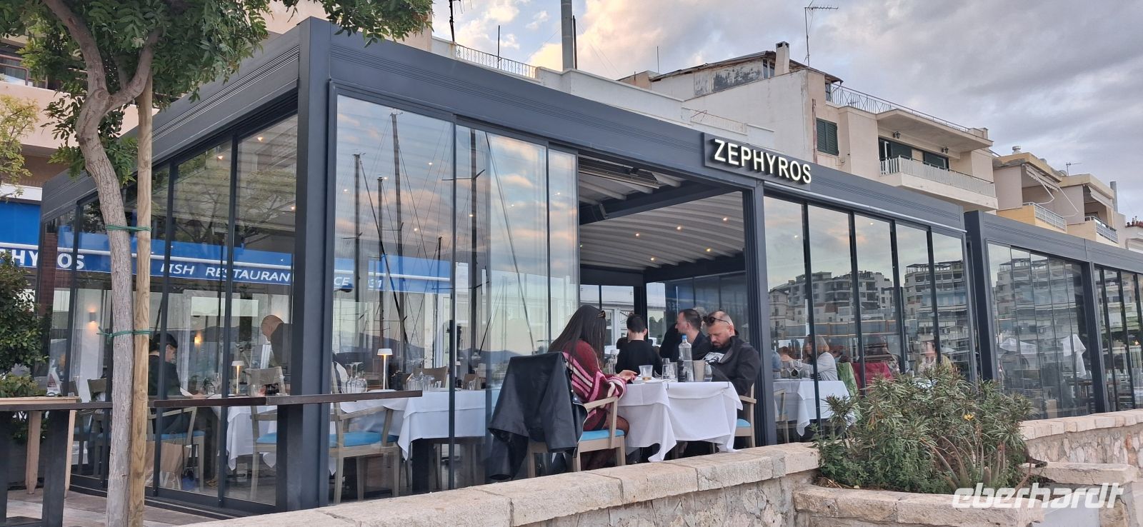 Zerfiro in Piräus. Panos brachte uns mit dem Bus noch einmal die Südküste von Attika entlang, vorbei an Athen in den noblen Teil von Piräus zu diesem exzellenten Fischrestaurant direkt am Yachthafen. Das hervorragende Essen wurde begleitet von einem frischen, leichten Weißwein - ein gelungener Abschluss einer wunderbaren Reise.