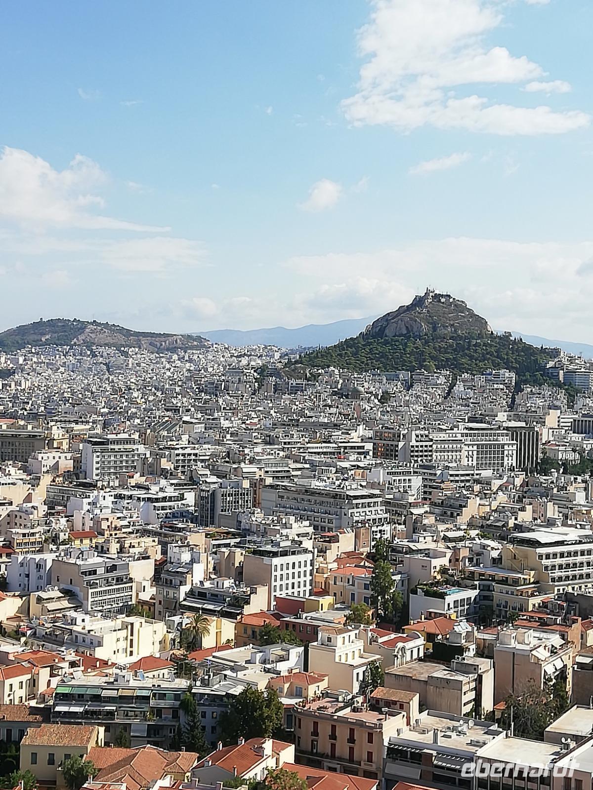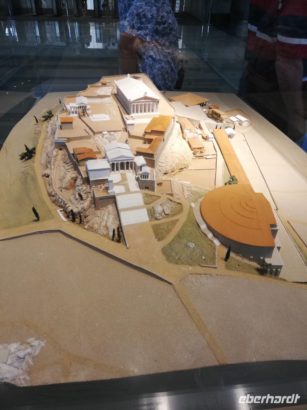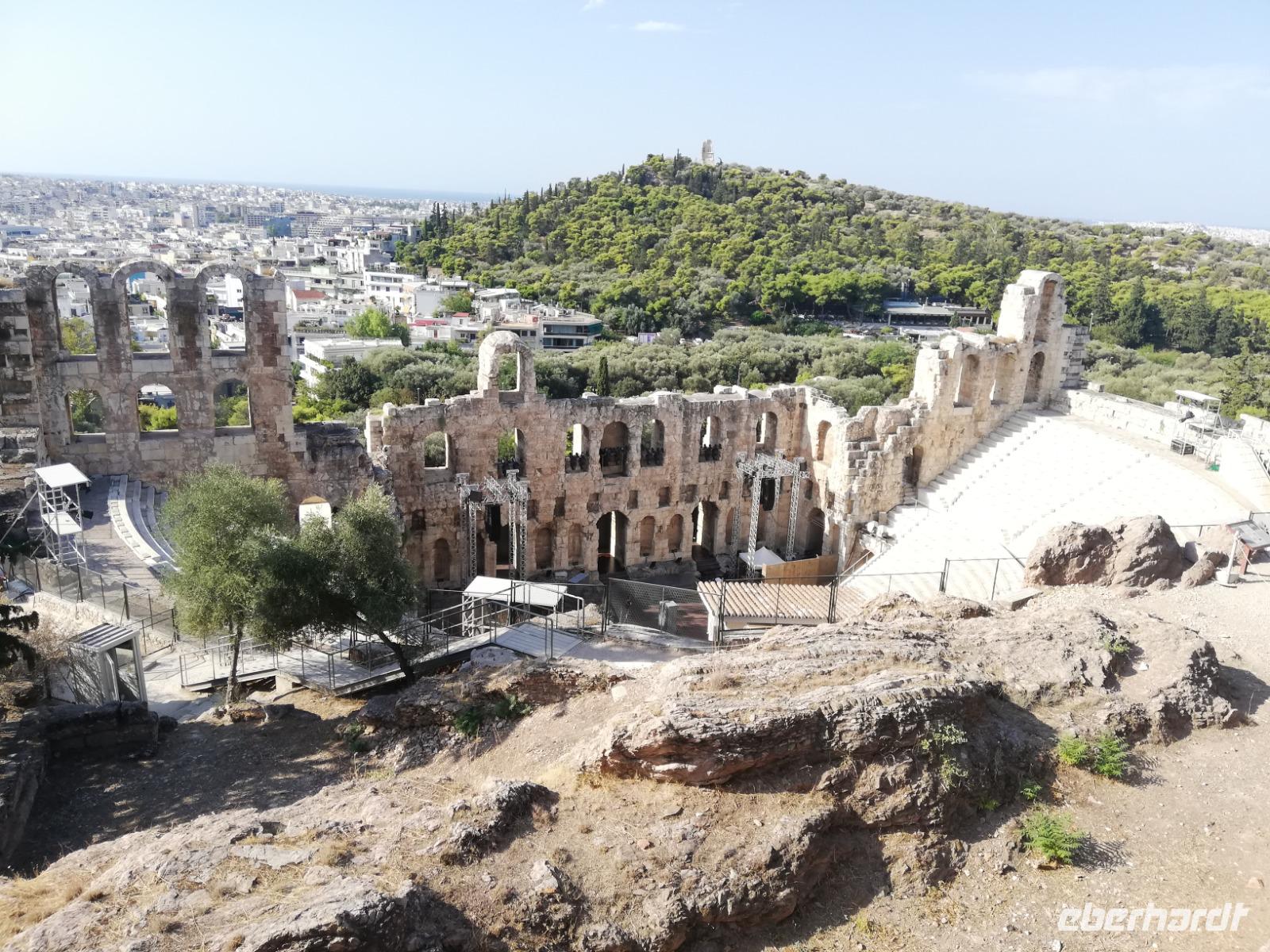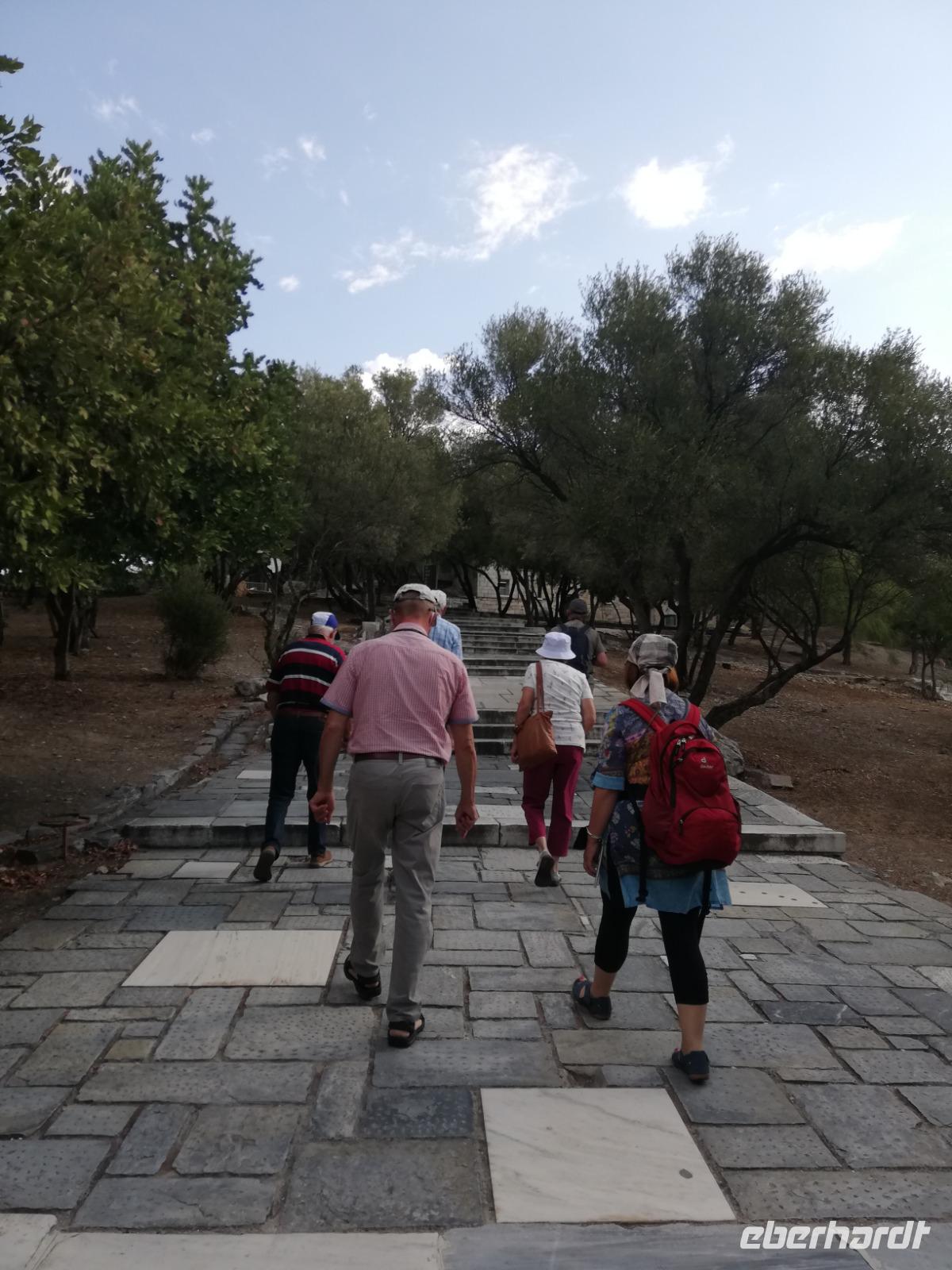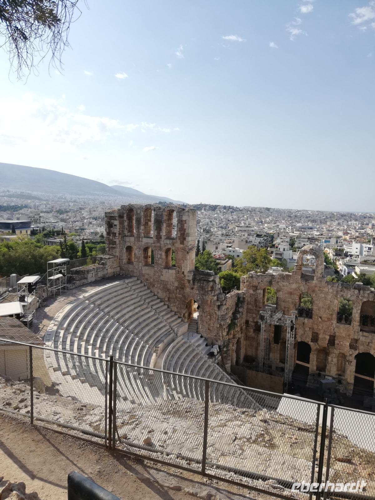 Im Anschluss fahren wir zum unserem Highlight für diesen Tag: die Akropolis, was so viel bedeutet wie die „Spitze der Stadt". Mehrere Tempel sind auf diesem Hügel erbaut worden. Bei einer Temperatur von ca. 29 Grad schlängeln wir uns die etwas rutschigen, durch viele Touristen abgelaufenen Marmorsteinwege hinauf. Das Odeon Theater mit seiner erstaunlichen Akustik, in welchem auch bis heute immer noch das „Athens Festival" mit musikalischer Unterhaltung stattfindet, ist unser erster Stopp. Auch sehen wir von hier den Philopappos Hügel, welcher das Grabmal eines syrischen Prinzen aus dem 2.Jhd n.Chr. darstellt. Die Akropolis wurde ursprünglich als Fluchtburg erbaut - durch Ihre Lage und den Überblick auf die Stadt. Im Laufe der Jahrhunderte entwickelte sich dieser Ort allerdings zu einem Heiligtum.