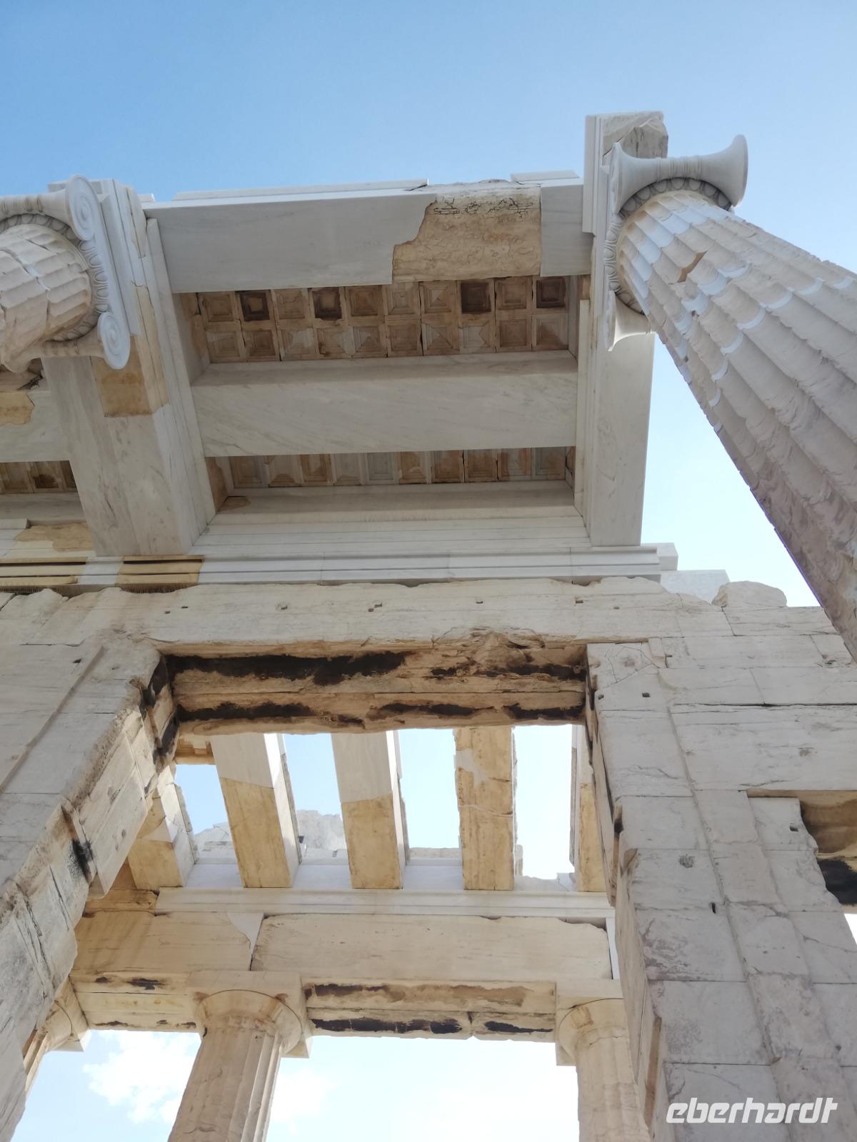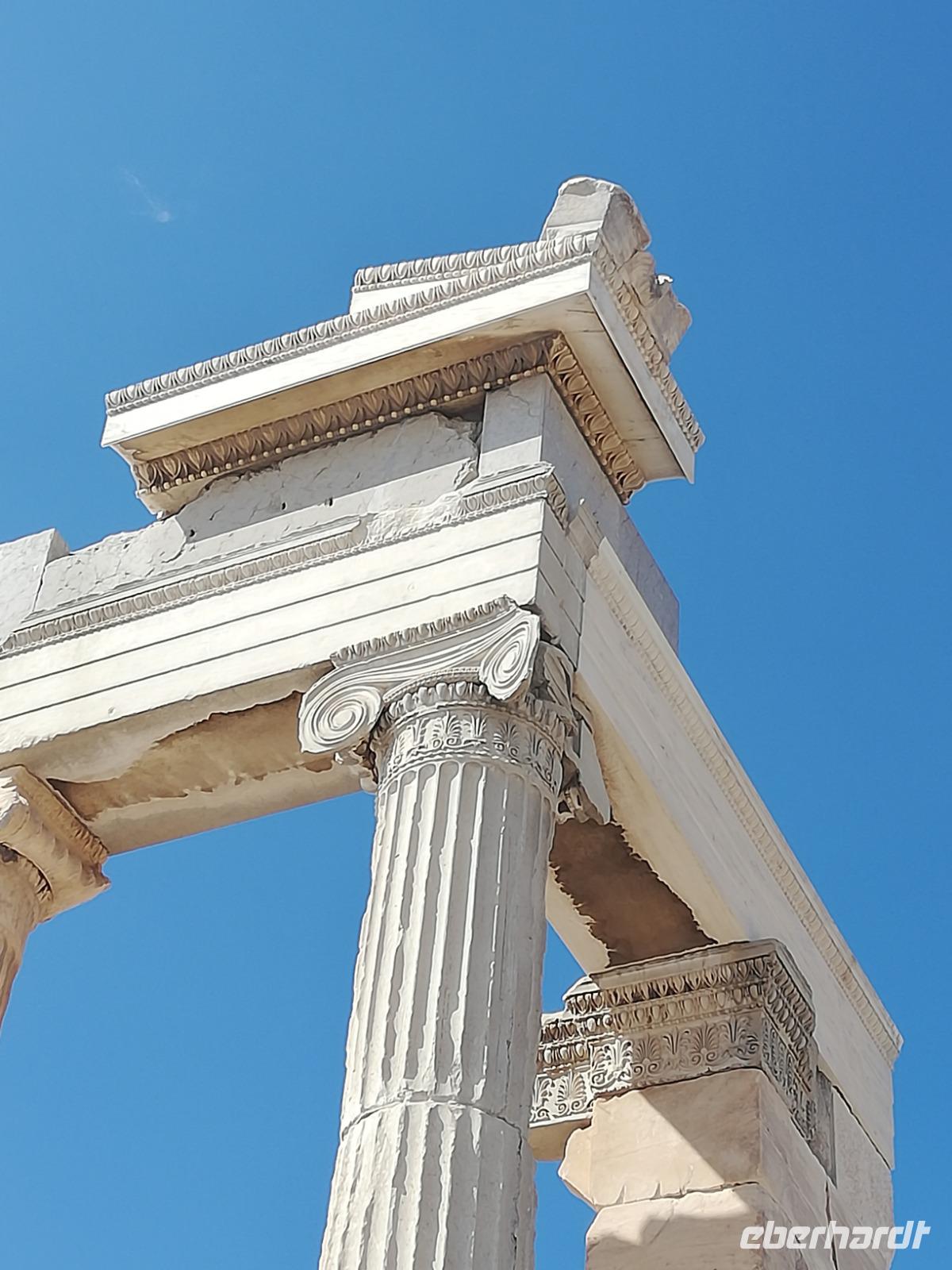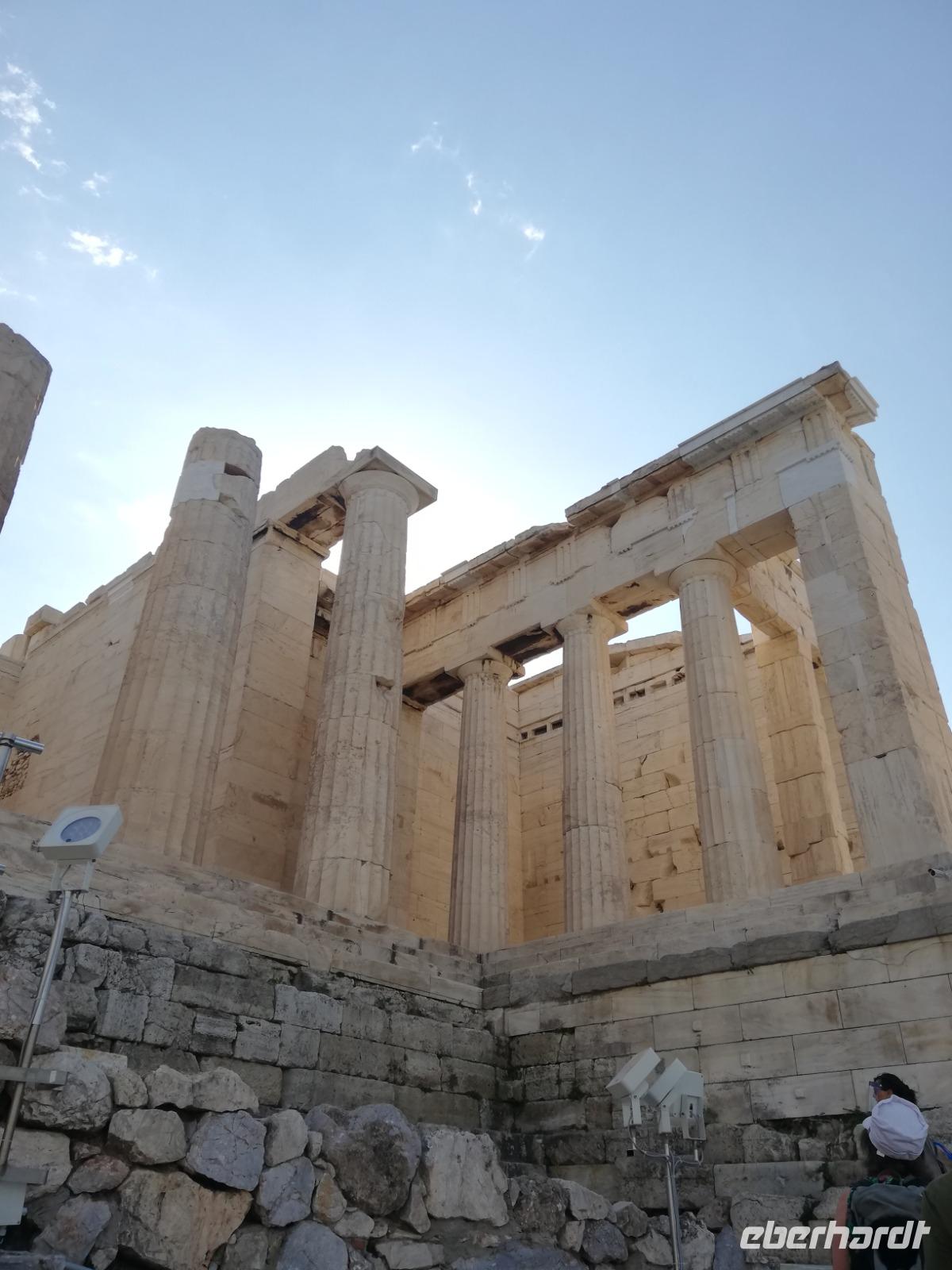Zunächst gehen wir weiter zu den Propyläen - was so viel wie Eingangstor oder Vorhof bedeutet - zu den weiteren Tempeln der Akropolis. Hier sind einige Ionische Kapitelle in den massiven Säulen verbaut - gut erkennbar durch Ihre schneckenförmigen Verzierungen. Der Weg führt uns weiter hinauf und wir erkennen hier schon den zweiten gut erhaltenen Tempel für die Athene Nike. Eine Frau mit Flügeln stellte sich dort dar, welche für den Sieg und eine Errungenschaft steht, wie wir lernen dürfen. Nun endlich erreichen wir den Gipfel und sehen den großen Parthenon Tempel (Tempel der Jungfrau) nun zum ersten Mal. Hier oben geht ein starker Wind - eine gelungene Abwechslung zu der inzwischen sehr waren Meeresluft.