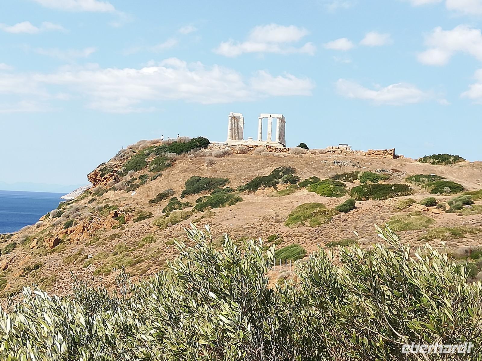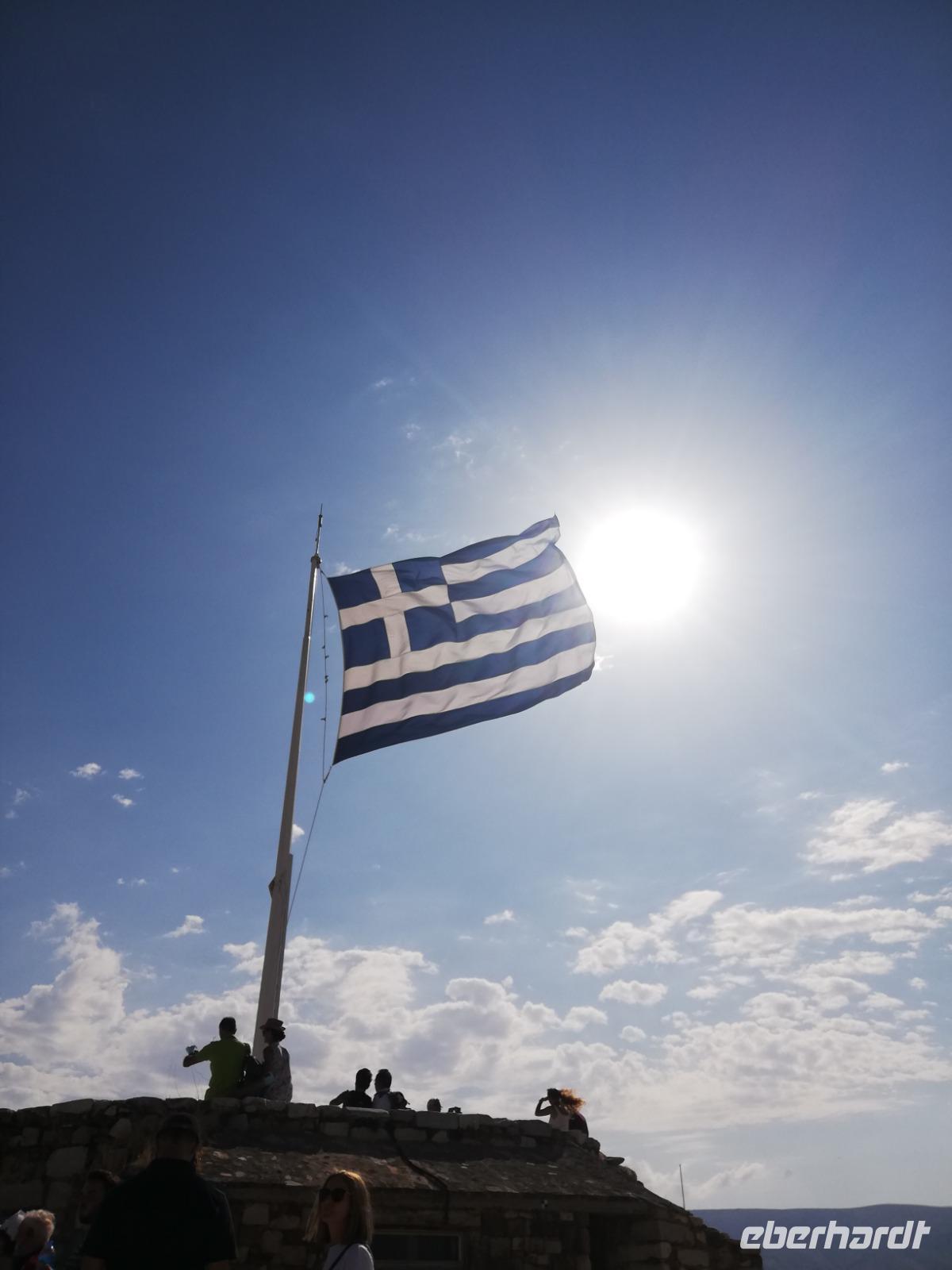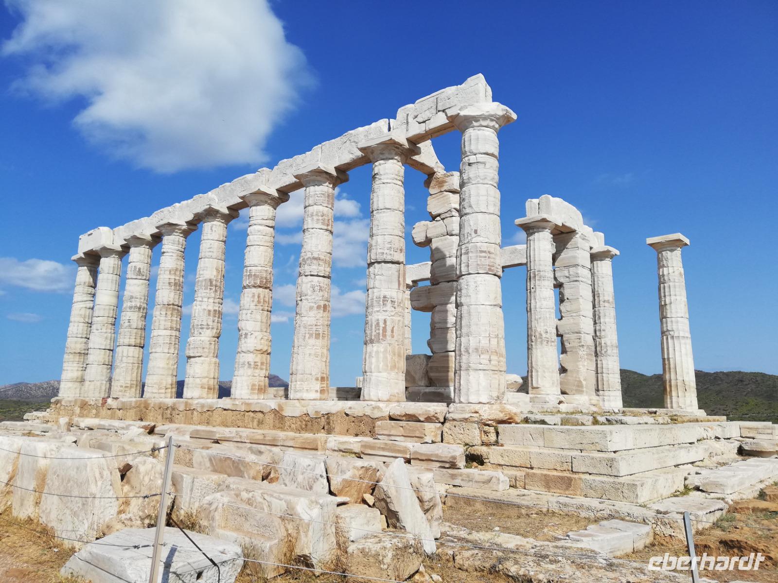 Das letzte Frühstück unserer Eberhardt petit Reise nehmen wir wieder im „Olive Garden" ein und starten 9.30 Uhr pünktlich mit unserem Bus - da unser Flug erst um 18.00 abhebt, haben wir uns entschieden, noch einen kleinen Ausflug zum Kap Sounion zu machen - der südlichsten Spitze des griechischen Festlandes. Durch die lebendige Metropole Athen schlängelt sich unser Bus, vorbei am Sintagma Platz mit dem Parlament, bei welchem wir aus dem Bus heraus auch den Wachwechsel der Soldaten in olivgrünbraunen Uniformen betrachten. Den Zeustempel, welchen wir auch schon von der Akropolis aus sahen, wirkt von Boden aus betrachtet noch umso gigantischer - er soll damals doppelt so groß wie der Parthenon gewesen sein. Weiter geht es entlang einer Küstenstraße, hinaus aus der Stadt, neben uns spült sich das klare türkisblaue Wasser an die Steinklippen. Nach circa 1,5 Stunden erreichen wir das Kap, an welchem - wie es sich gehört - ein kräftiger Wind weht. Der Hügel wird gekrönt durch den aus dem 5.Jhd v.Chr. entstandenen Poseidontempel - hier wurde der Gott des Meeres verehrt. Wir können von der Spitze aus die kleinen Inseln Kythnos, Khea und Serifos erkennen. Die am weitesten vorn im Blickfeld befindliche Insel Makronisos war ein verachtetes Stück Land, da dorthin die Verbannten und Außenseiter der Gesellschaft entsendet wurden. Aufgrund der guten Lage des Kaps und der weiten Sicht auf das Meer war Sounion immer stark bewaffnet - vermutlich auch, weil im benachbarten Dorf Lavrion große Silberminen ansässig waren. Wir unternehmen noch einen Spaziergang um den Hügel herum und schießen noch ein paar schöne Abschlussfotos, bevor wir uns zum Mittag in die Silberminenstadt Lavrion für ein Mittagessen begeben. Bei einem ausgedehnten Essen mit Bifteki, gebratenen Auberginen, sowie einem typisch griechischen „Schwein in Backpapier" angemacht mit Tomaten und Paprika, lassen wir es uns noch einmal richtig gut gehen. Auf dem Weg zum Flughafen verabschieden wir uns von unserer lieben Anastasia und checken unser Gepäck ein. Ein wenig Zeit bleibt noch um die warmen Sonnenstrahlen auf dem Gelände des Flughafens zu genießen. Mit etwas Verspätung hebt unser Flugzeug 18.30 Uhr in Athen ab und schafft es trotzdem die Landezeit 20.20 Uhr in Berlin einzuhalten. Dort stehen auch schon unsere Transferfahrzeuge nach Dresden bereit uns bringen uns sicher in unsere Heimatstadt, die wir gegen 23.00 Uhr erreichen.