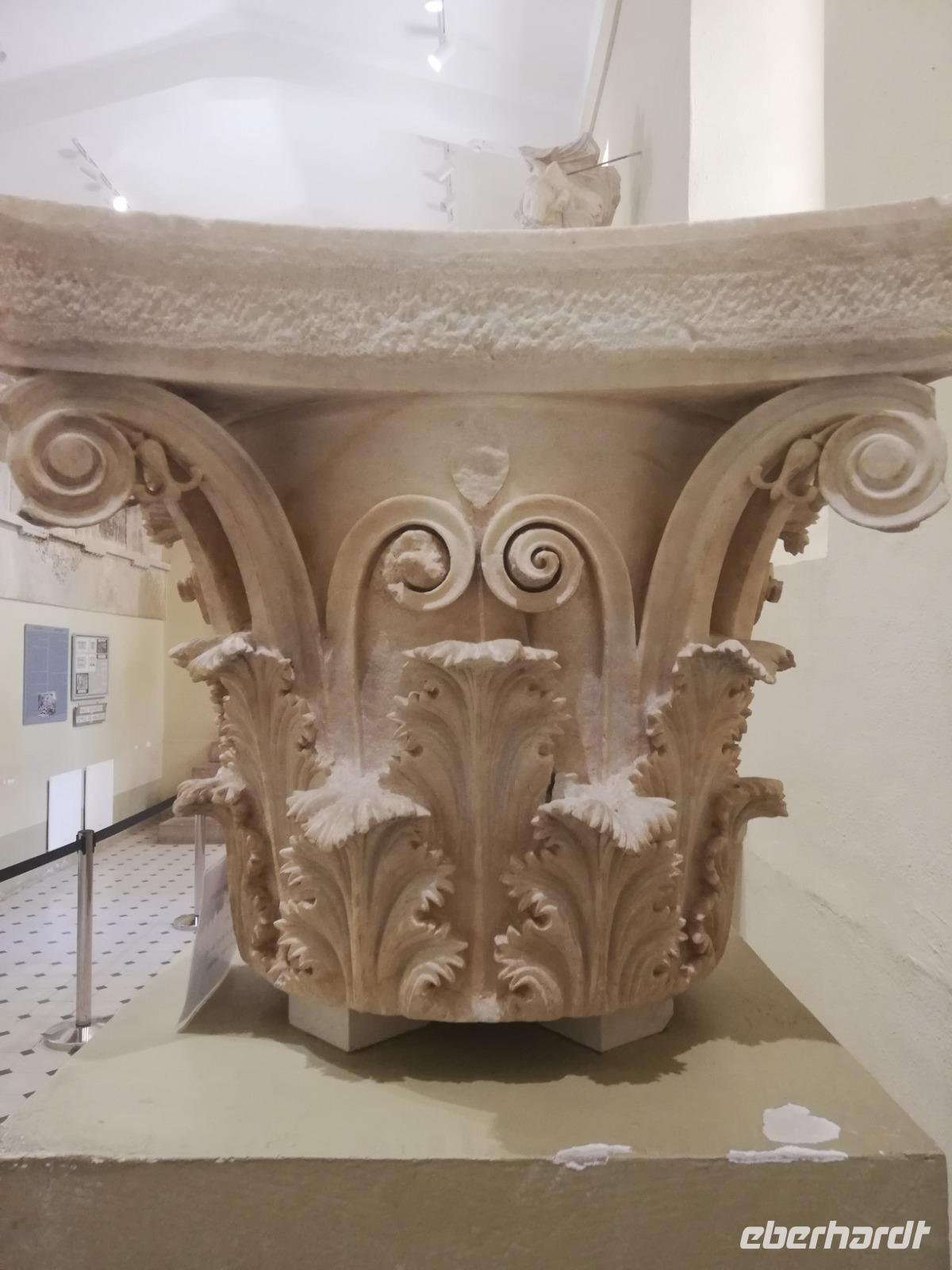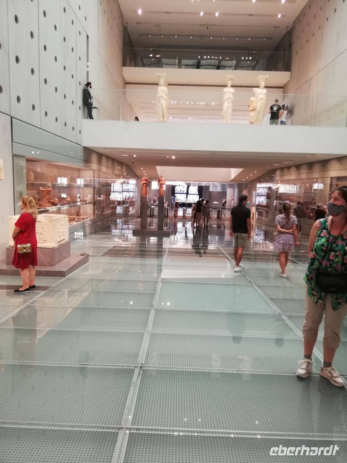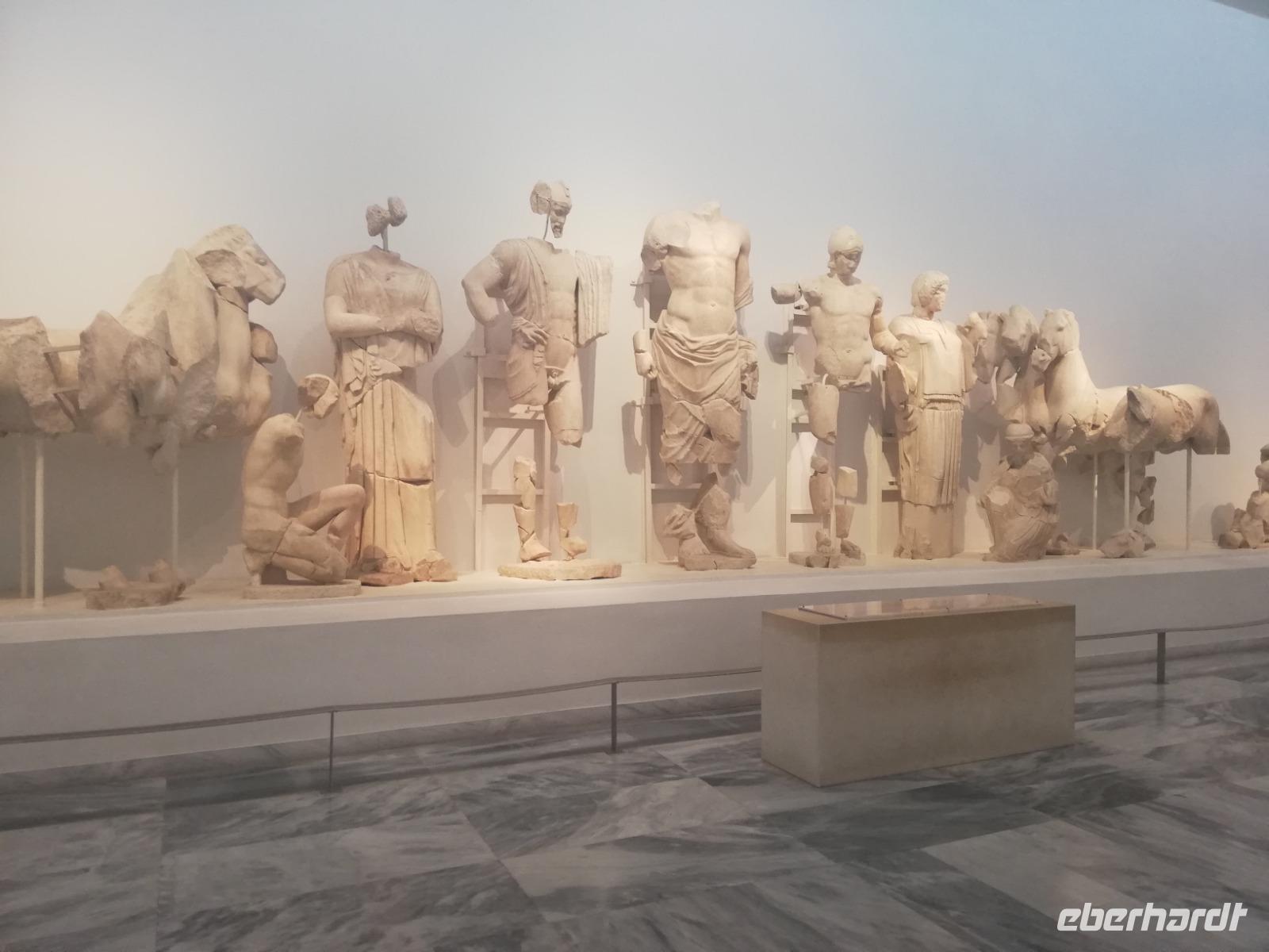 Im Museum müssen wir nun eine Maske tragen, dennoch ist es hier angenehm kühl und dadurch ist es auch nicht mehr unangenehm. Unsere Reiseleiterin führt uns durch den großen Glasbau, beginnend mit Vasen und Haushaltsgegenständen der alten Athener, weiter über die Ausgrabungen und Statuen der Akropolis, welche noch im Original stückweise oder teils restauriert vorhanden sind. Nach ca. 1,5 Stunden verlassen wir das Museum und genießen einen kleinen Snack bei einer Gyros Pita in einer Nebenstraße - für uns definitiv füllend und ausreichend bei mittlerweile 31 Grad.