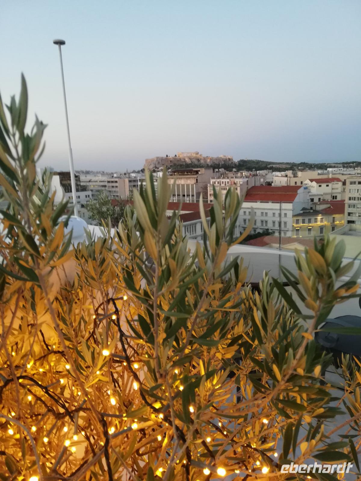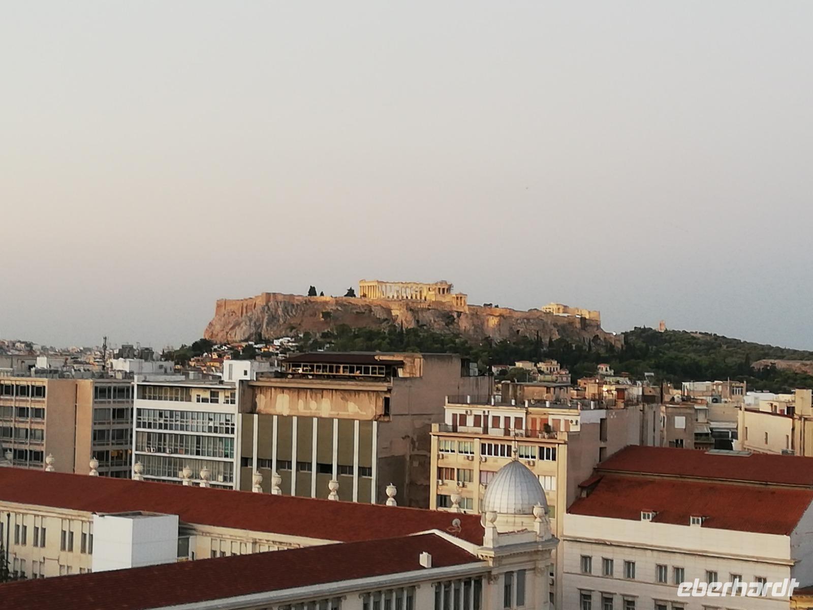 Unsere Reiseleiterin Anastasia begrüßt uns am Flughafen Athen und bringt uns zu unserem Reisebus - für uns elf Personen ist dieser sehr groß und wir haben alle genügend Platz zwischen den Reihen - dennoch müssen wir eine Schutzmaske tragen, da die Regeln und Strafen in Griechenland diesbezüglich sehr genau sind. Über die griechische Autobahn geht es dann in Richtung des Zentrums der Hauptstadt Griechenlands, welche circa fünf Millionen Einwohner hat, wie wir von unserer örtlichen Reiseleitung Anastasia erfahren. Sie erzählt uns ein wenig zur Geschichte, Wirtschaft und Aufbau der Stadt in den vergangenen Jahrhunderten. Gegen 21.15 Uhr erreichen wir unser Hotel und bekommen schnell unsere Zimmerschlüssel - in der siebten Etage werden wir untergebracht. Nur eine viertel Stunde später treffen wir uns noch einmal auf der wunderschönen Dachterrasse des Hotels Titania mit herrlichem Blick auf die angestrahlte Akropolis. Dort genießen wir ein leckeres Abendessen von Tagliatelle über Black Angus Burger und frischen Sandwiches. Nach diesem doch langen Reisetag begeben wir uns gegen Mitternacht in unsere Betten und werden die Ereignisse des ersten Tages ein erst einmal verarbeiten.