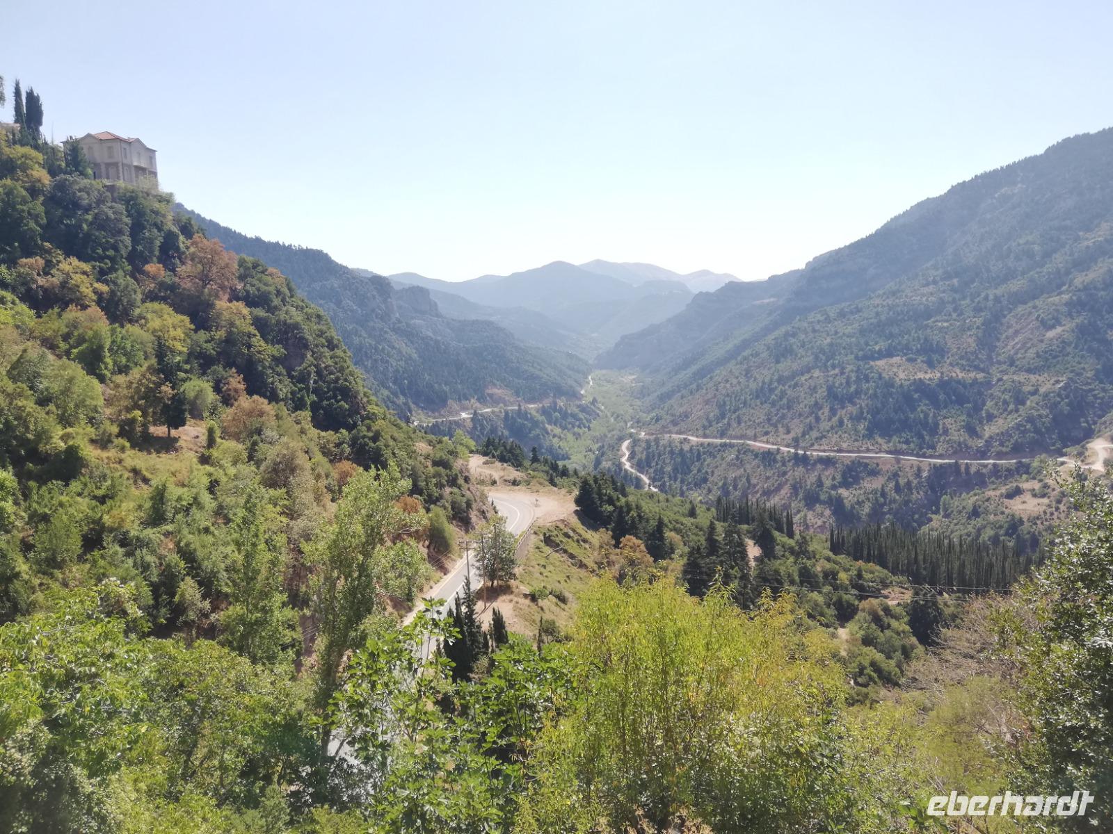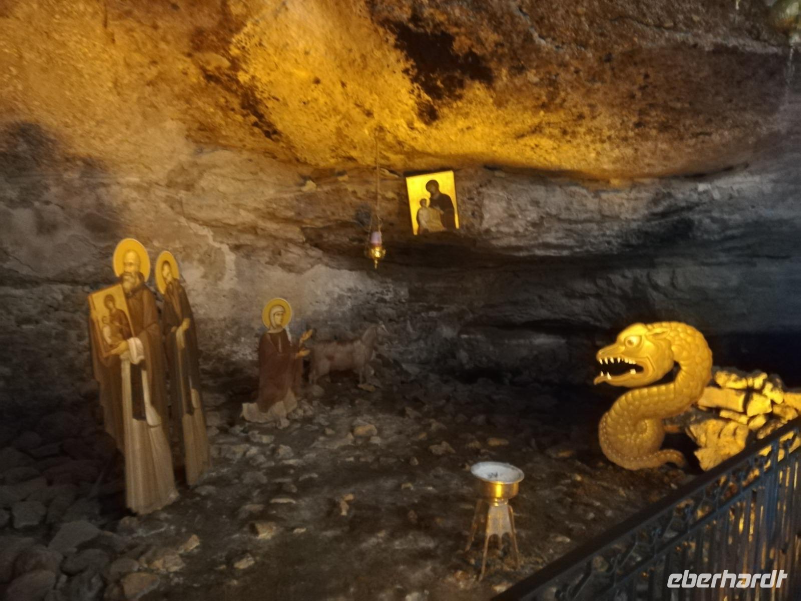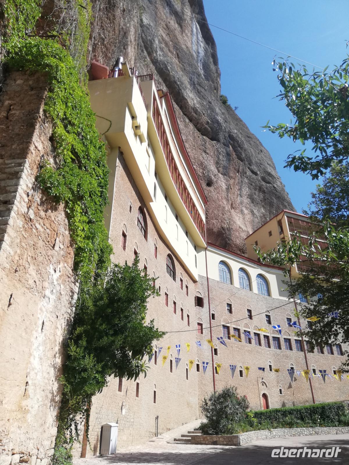 Wir unternehmen noch einen Verdauungsspaziergang im Ort, bevor es für uns zu unserer letzten Station geht: dem Felsenkloster Mega Spileo - das wohl Älteste Kloster in ganz Griechenland aus dem 4 Jhd. n.Chr. Leider ist dieses Kloster im Laufe der Jahrhunderte mehrfach abgebrannt - zuletzt aber 1934. Aufgrund dessen wurde der Bau dieses Kloster mehrfach restauriert und erscheint eher ziemlich modern. Wir treten ein in das Haus am Hang und besuchen auch die Kapelle, in welcher ein kleiner Mönch mit langem grauem Vollbart unseren Besuch genauestens beobachtet. Auch haben wir die Möglichkeit, in den hinteren Bereich einzutreten, in welchem in einer Steinhöhle am Fels unterschiedliche christliche Szenen dargestellt werden.
