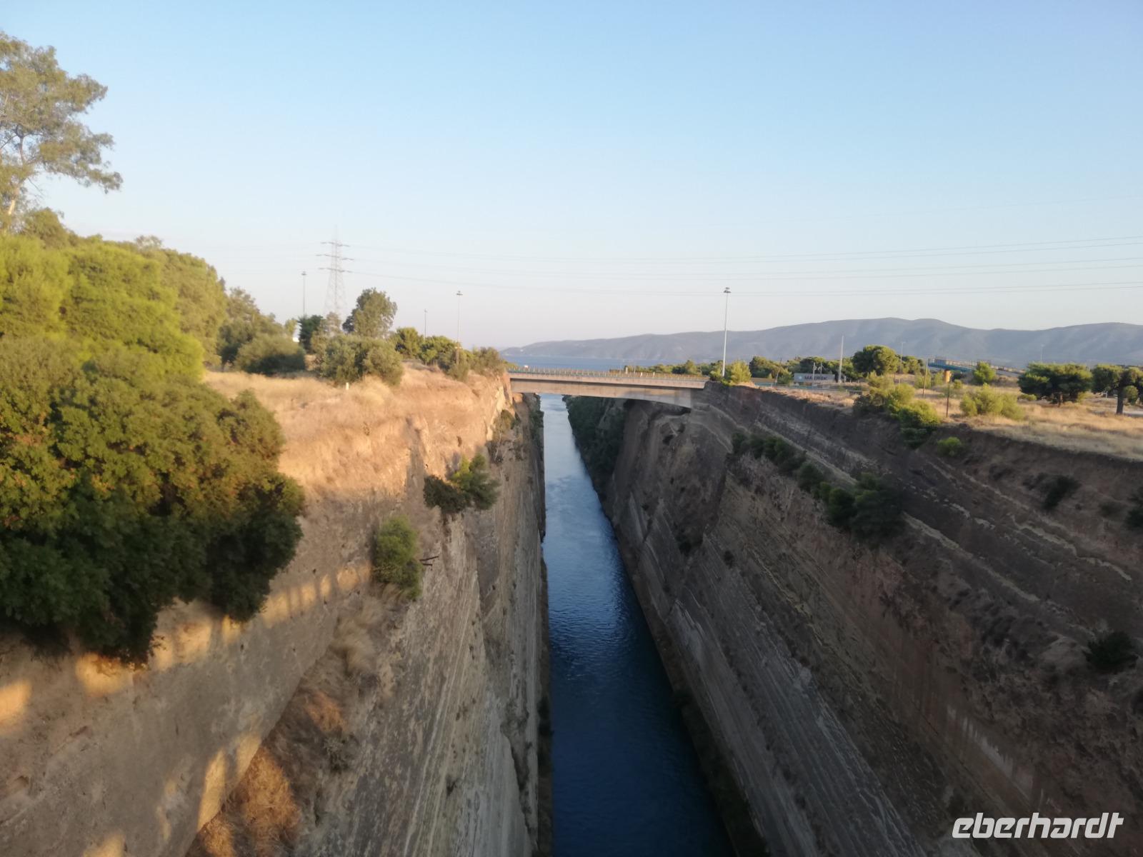 An den Seiten der Autobahn wachsen wilde kleine Olivenbäume und Oleander in allen Farben- ein Traum für jeden Pflanzenliebhaber! Kurz bevor wir unser heutiges Domizil erreichen, machen wir noch einen Fotostopp am berühmten Kanal von Korinth -welcher mit einer Länge von 6 km und einer Breite von 25m sehr beeindruckt. Um 1893 wurde dieser Kanal fertiggestellt. Wir bestaunen den länglichen offenen Tunnel auf der Istmos Brücke, die circa auf einer Höhe von 60m über dem Kanal liegt. Er verbindet das ägäische und das ionische Meer miteinander und ist auch noch heute abgesehen vom Tourismus ein wichtiger Verbindungspunkt für Handelsschiffe.