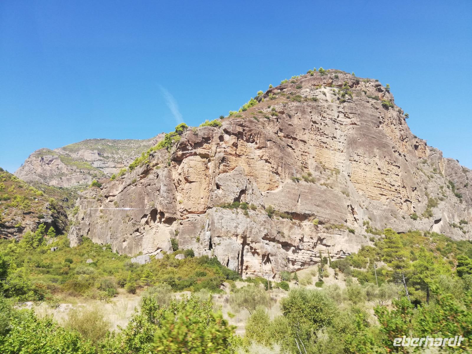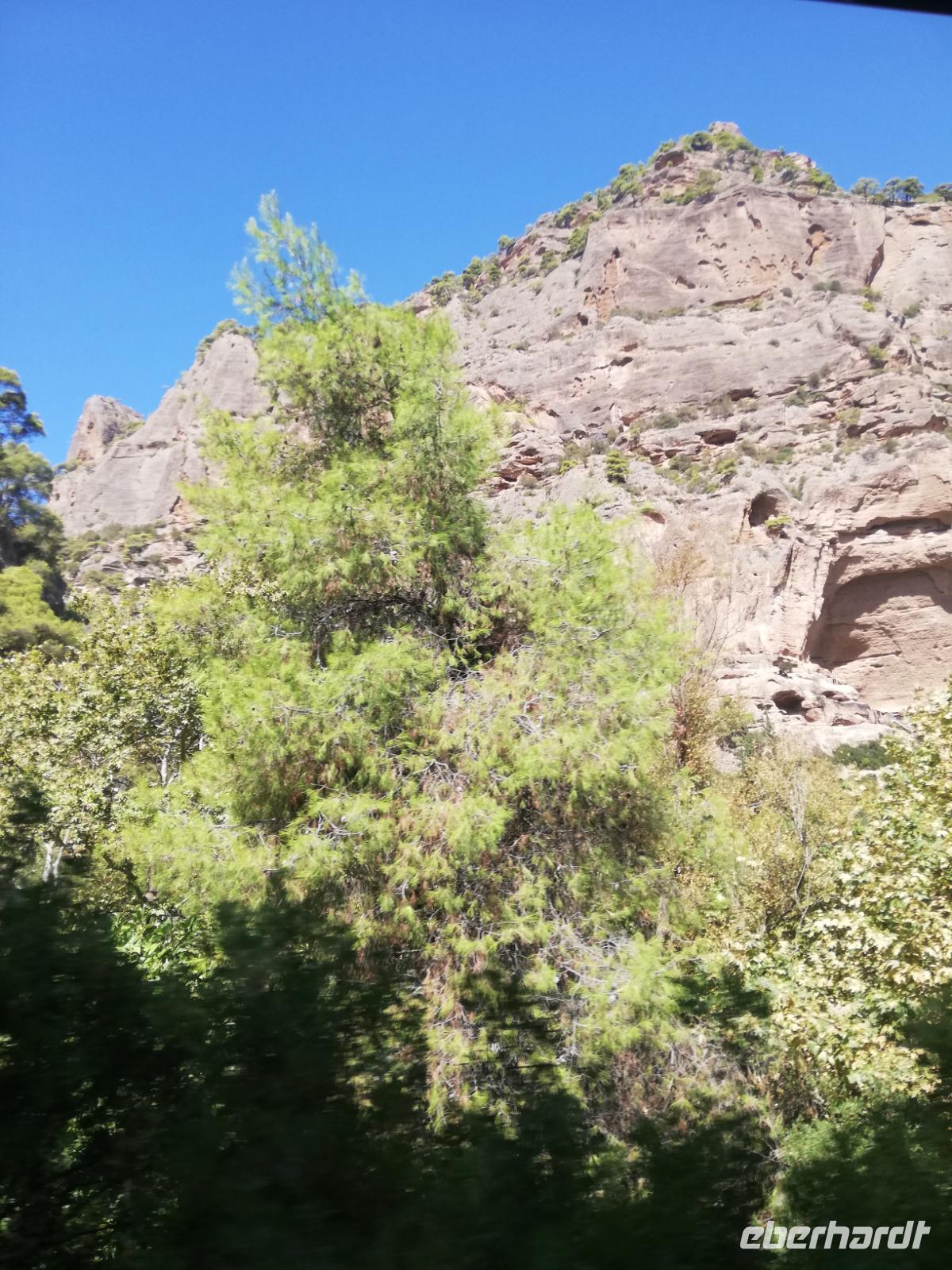 Um 11.45 Uhr fährt die Odontosbahn los und schlängelt sich durch die Schluchten der wunderschönen Vouraikos Schlucht. Sie überwindet dabei einige Höhenmeter und dies bei einer Steigung von maximal 17.5%. Die 1896 fertiggestellte Bahn verbindet den Ort Diakofto und Kalavrita miteinander, welche circa 22 km voneinander entfernt liegen. Über eine knappe Stunde lang zuckeln wir bei ungefähr 30km/h mit der Schmalspurbahn immer entlang eines kleinen Bächleins. Das schroffe rotbraune Gestein des Gebirges bildet einen herrlichen Kontrast zum blauen Himmel und den sattgrünen Bäumen. Das leise Zuckeln und Wackeln der Bahn lässt uns in andere Gefilde abtauchen. Wir erreichen nun Kalavrita - ein hübsches kleines Bergdorf mit nur 1. 700 Einwohnern und nehmen Kurs auf die bereits reservierte Taverne für unser Mittagessen. Verköstigt werden wir wie immer reichhaltig: es gibt Salat, Käse, Brot und hausgemachten Zaziki!