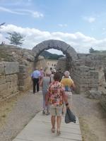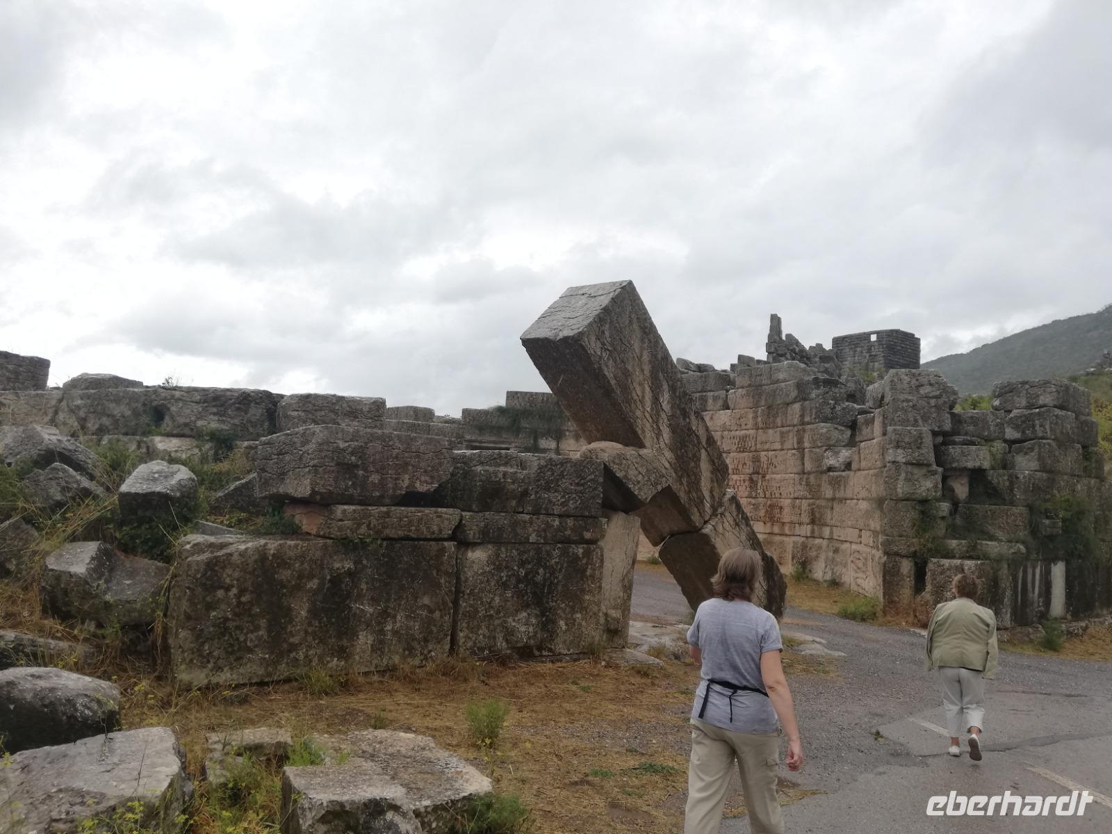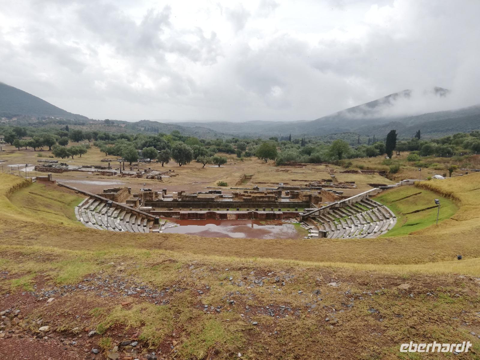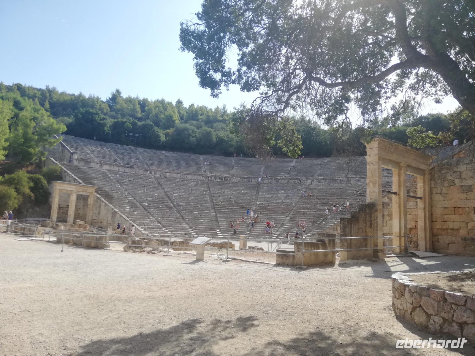An unserem Ausflugsziel angekommen, erfahren wir, dass in dieses besondere Theater circa 14.000 Menschen Platz gefunden haben. Es muss im 4.Jhd. v.Chr erbaut worden sein und kaum ein Theater der Neuzeit hat es je geschafft, die Akustik dieses Ortes nachzuempfinden- /-zubauen. Archäologen behaupten, dass dieser einzigartige Klang nicht durch die Maße des Baus zu erklären ist, sondern auch im Detail den Wölbungen der Steine im Allgemeinen, dem Material , der Steigung der Treppen, aber auch der Lage auf einem natürlichen Hügel, sowie dem stets aufkommenden Lüftchen zu verdanken ist. Wir bekommen nun auch eine kleine Kostprobe - alle Gäste verteilen sich auf unterschiedliche Etagen des Theaters - es sind kaum Touristen hier, sodass wir unser Experiment ohne Nebengeräusche ausprobieren können. Anastasia stellt sich in die Mitte der Bühne, die Orchestra genannt wird und spricht in normaler Lautstärke weiter - wir können alles verstehen. Auch als sie eine Münze fallen lässt, ist dies bis in die letzte Reihe hörbar - faszinierend!