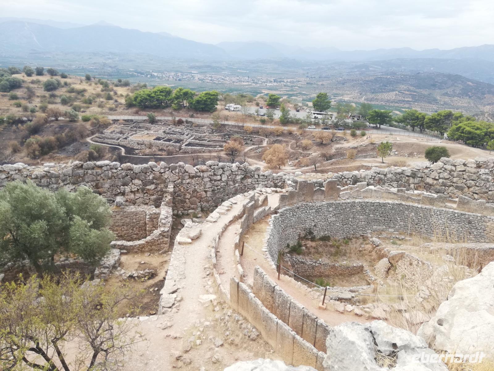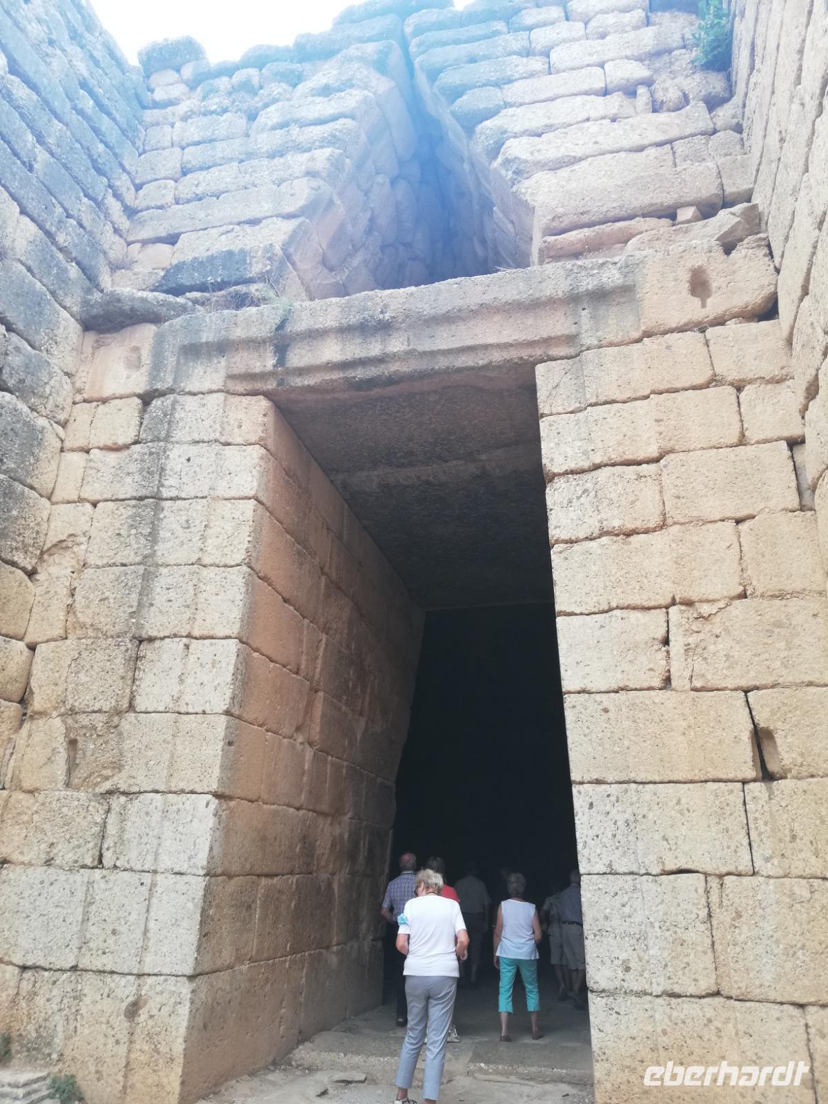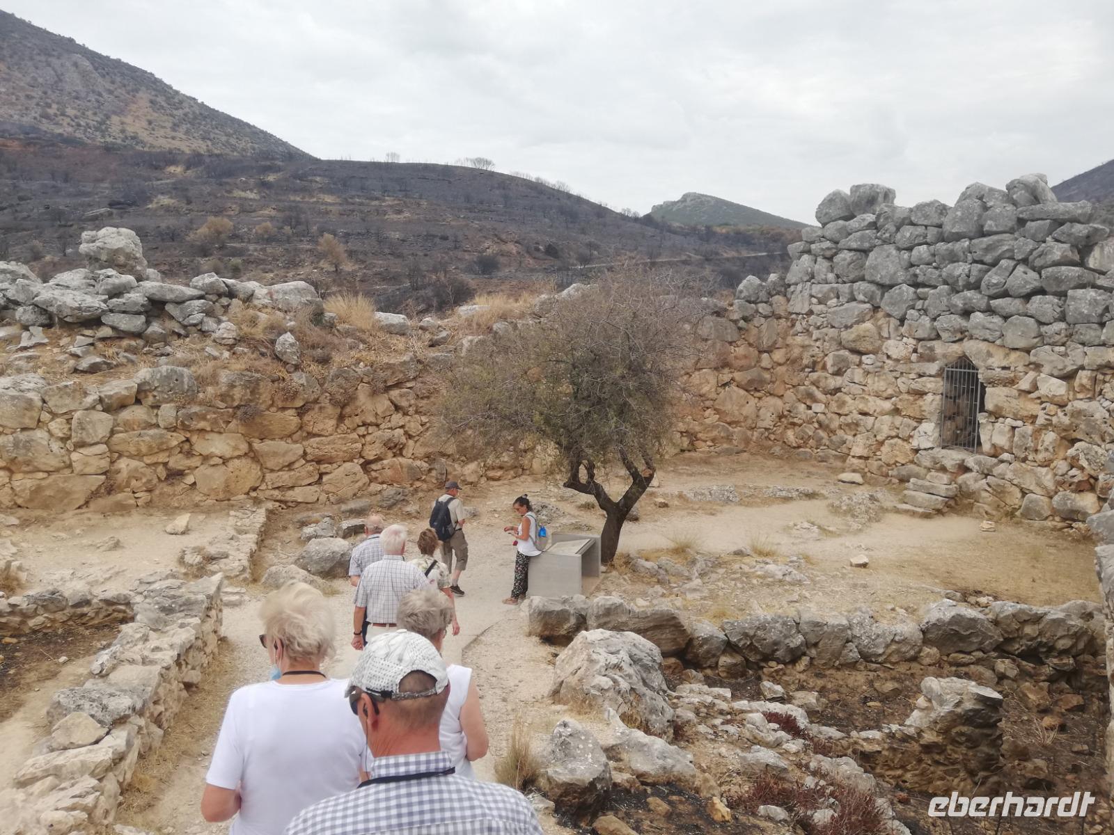 Nach diesem Hörerlebnis betreten wir ein kleines Museum des Eskulap - auf Griechisch Asklepio genannt - welchem dieses Theater geweiht wurde. Der Eskulap war laut Überlieferungen eine Art Mediziner, welcher sowohl die körperliche, als auch die geistliche Heilung versprach. Zu damaliger Zeit sollen die Menschen aus ganz Griechenland angereist sein. Doch vor der körperlichen Heilung musste der Geist gereinigt werden und somit wurden im Epidaurus auch Predigten für die Heilung und geistige Vorbereitung gehalten. Im Museum können wir sowohl ein Abbild des Eskulap betrachten, als auch unterschiedliche Marmortafeln, auf welchen medizinische Rezepte und Handwerkszeug aus der alten griechischen Zeit ausgestellt sind. Besonders sehenswert ist ein Stück aus parischem Marmor, welches filigran verarbeitet auf einer Säule auf Augenhöhe sitzt. Wir begeben uns anschließend auf den Weg in die schöne leine Hafenstadt Nauplia, welche starken venezianischen Einfluss hat. Bei Erreichen des Städtchens springt uns die Burg Palamidi ins Auge - sehr hoch oben thront sie majestätisch auf einem Felshang. Leider bleibt uns keine Zeit die 999 Stufen zur Burganlage hinauf zu gehen. Wir verweilen ein wenig in den niedlichen Gässchen des Ortes, in welchem viele kleine Läden zum Bummeln einladen. Da der Ort ebenfalls an einem Berg bis an das Wasser gebaut ist, kann man nach Überwindung einiger Stufen dennoch auch noch einen wunderschönen Blick über die rötlichen Dächer auf das türkisblaue Meer erhaschen. Weiter führt uns die Fahrt nach dieser kleinen Mittagspause vorbei an vielen Orangenbaumplantagen zu der wohl bedeutendsten Ausgrabungsstätte Griechenlands - der Mykene, der ursprünglichen Festung des Königs Agamemnon. Hier sehen wir die alte Burgbefestigungsmauer, welche allerdings aus dem 13.-14. Jhd stammt mit ihrem gewaltigen Löwentor. Wir erfahren, wie die Menschen die Last aus den Tonnen-schweren Steinen umgeleitet haben durch ein Entlastungsdreieck, - und das das Löwentor eigentlich nur eine Verzierung dieses „Loches" ist. Das Problem der Statik wurde hier also bewusst gelöst und die Löwen stellen die älteste monumentale Skulptur Europas dar. Wir laufen noch ein wenig durch die Stätte, entdecken hier und da allerdings verbrannte schwarze Stellen. Vor nicht einmal zwei Wochen hat es hier einen Brand gegeben, der die Stätte als auch das Umland für einige Stunden übersähte. Aus heutiger Sicht sind keine schweren Schäden an der Mykene entstanden, dennoch wirkt die verbrannte Erde an vielen Stellen etwas karg und traurig. Wir sehen noch die natürliche Zysterne, welche Wasser aus einer auf dem Berg liegenden Quelle enthalten haben muss, bevor wir noch die Schatzkammer des Artreus (Vater des Agamemnon) direkt neben der Ausgrabungsstätte besuchen. Das Kuppelgrab besitzt 33 massive Steinringe und hat eine gewaltige Höhe von 13,5 m. Nun fahren wir nach all diesen neuen Informationen aber auch weiter in den Ferienort Kalamata, welcher direkt am Meer gelegen ist. Unser Hotel liegt etwas außerhalb direkt an der Küste zum kristallblauen Wasser. Über einen Fahrstuhl unter der Straße entlang erreichen wir das kühle Nass und der Ein oder Andere watet auch gern noch einmal hinein nach diesem langen windstillen und dadurch sehr warmen Tag. Am Abend erwartet uns ein kleines, aber gut abgeschirmtes Buffet im Hotel - wir dürfen hinter einer Plexiglasscheibe auswählen, welche der leckeren Speisen wir wählen und lassen uns es bei einem „Mythos-Bier" schmecken.