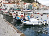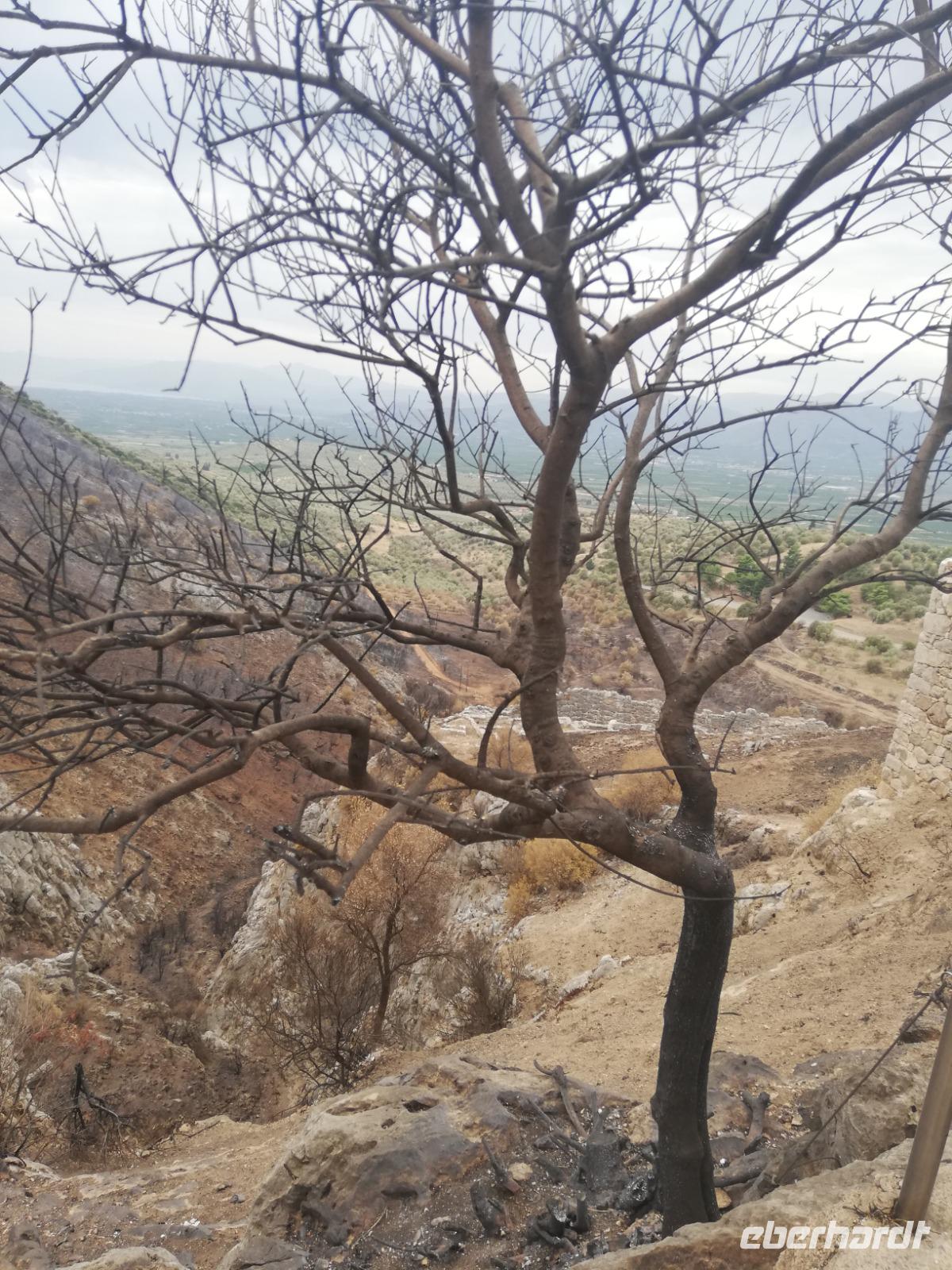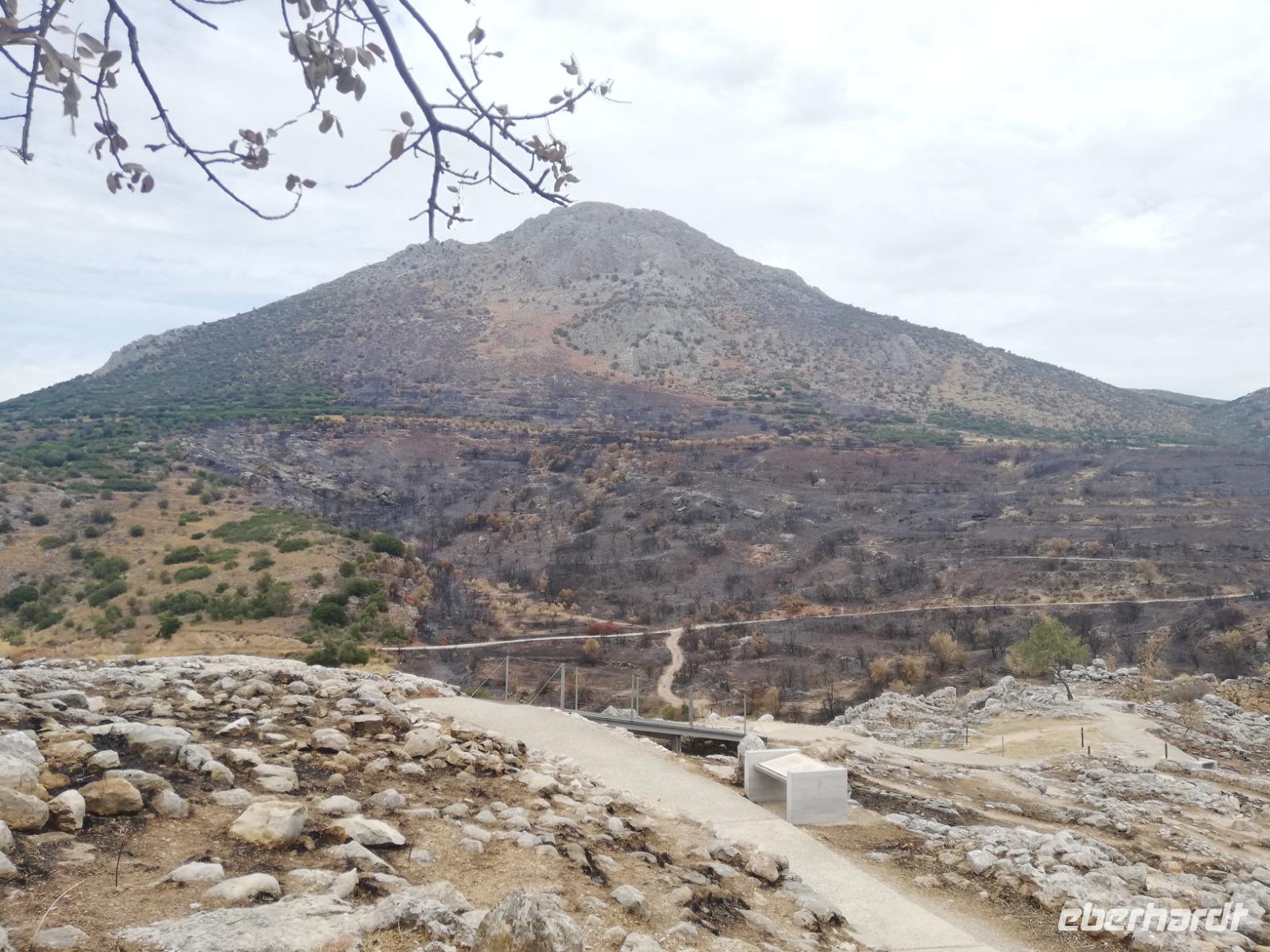 Das laute Meeresrauschen hat sich heute etwas beruhigt, die tosenden Wellen vom gestrigen Abend sind nun nur noch ein paar flache Wogen, die sich an den Strand heranspülen. Mit Regenjacke und Schirm ausgerüstet,fährt uns unser Busfahrer zunächst in den kleinen Ort Gythion, welcher schon in mykenischer Zeit erwähnt wurde. Zu den Seiten der Bergstraße sehen wir erneut große verbrannte Flächen auf den Hügeln und Bergen - die züngelnden Flammen müssen aufgrund des Ausmaßes der schwarzen Rückstände hier tagelang gewütet haben. Nach einer knappen Stunde Fahrt erreichen wir das gerade erst erwachende Städtchen und haben ein wenig Freizeit, um den Ort fußläufig zu erkunden. Die kleinen Fischerboote schwappen sanft auf und ab in der Bucht des Hafens und die bunten Häuser an der Promenade verleihen dem Ort ein romantisches Dasein. Das Wetter ist stabil und die Sonne traut sich sogar ein paar Mal durch die Wolken hindurch und bringt Wärme mit sich. Wir ziehen noch ein wenig durch die schmalen Gassen und knipsen ein paar Fotos. Auf einer Insel vor Gythion, heute mit einem Leuchtturm bestückt, sollen laut einer Sage Paris aus Troja und die gestohlene Helena aus Sparta ihre erste Nacht verbracht haben. Das Städtchen wurde wohl außerdem in antiker Zeit einmal von einem Erdbeben mit anschließendem Tsunami getroffen und Teile des Ortes sind damit leider versunken.