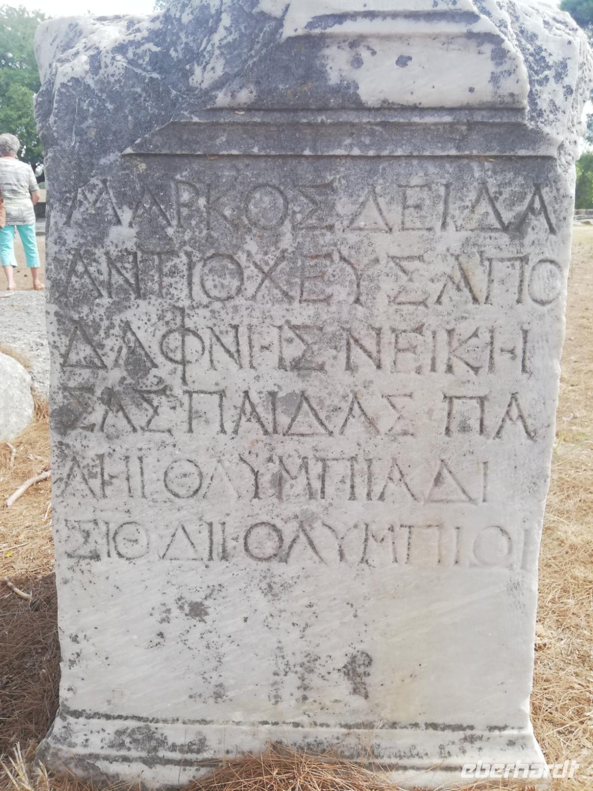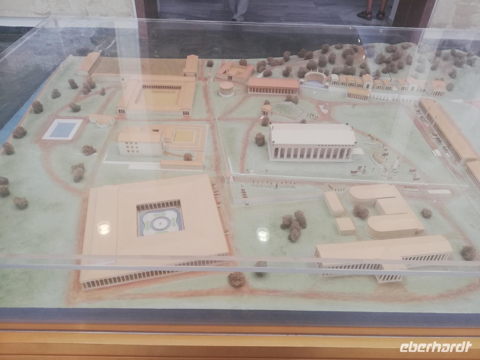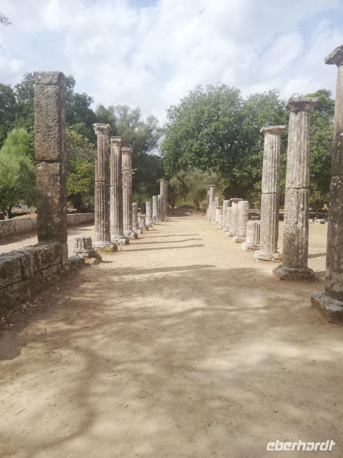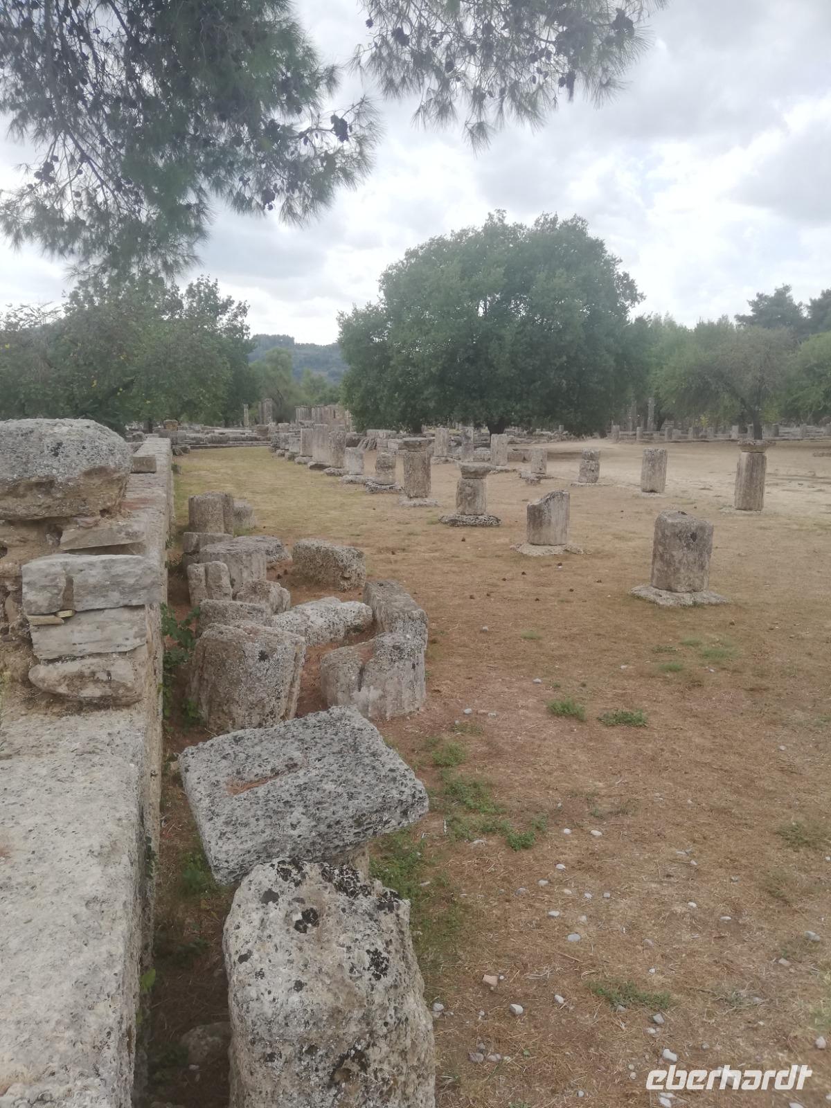 Der Ort Olympia befindet sich zwischen zwei Flüssen, die umliegenden Felder erhalten also reichlich Wasser. Nach ungefähr zwei Stunden Fahrt erreichen wir den Ort des Heiligtums und Anastasia beginnt ihre Führung. Hier in Olympia wurde der Göttervater Zeus verehrt - anders als im nördlich von Griechenland gelegenen Delphi, das dem Apollon geweiht war. Den absoluten Ursprung der Spiele soll laut Sage wohl ein Wettrennen der fünf Korinthen des Zeus gewesen sein, welche alle die Begünstigten des Gottes sein wollten. Seit 1100 v.Chr sollen die Spiele aller vier Jahre stattgefunden haben. Wir laufen vorbei am Gimnasio (was so viel wie „nackt" bedeutet), in welchem die Dauerläufer und Diskuswerfer für die Spiele übten. Tatsächlich sollen alle Teilnehmer sowohl zum Training, als auch bei den Spielen keine Kleidung getragen haben. Weiter geht es zur Palästra, einem mit vielen Säulen erhaltenen Bau, der eine Überdachung besaß. Hier wurde der Boxkampf geübt und die Techniken verfeinert. Die komplette Anlage ist mit vielen Judasbäumen bestückt - sollten wir erneut einmal in die Gegend kommen, lohnt sich ein Besuch vor allem im Frühjahr, da diese in dem Zeitraum herrlich pink und rosa blühen. Die Überreste der Werkstatt des Aiphideas zur Erstellung der Zeus Skulptur-bestehend aus Gold und Elfenbein - sowie das Leonidaion, welches als Art "Hotel" für die Ehrengäste der Spiele wie bspw. Politiker und hoch Angesehene, betrachten wir im Anschluss.