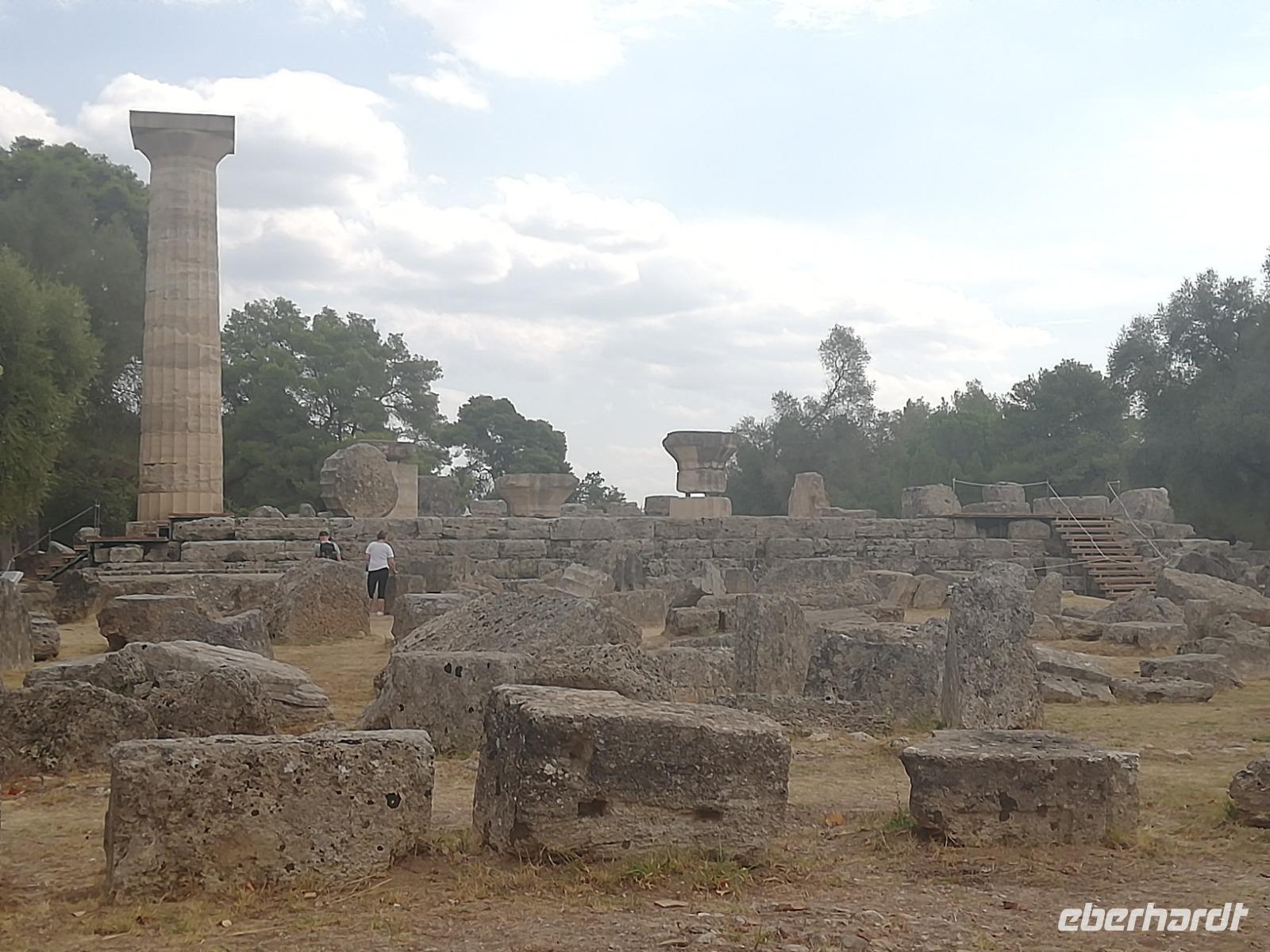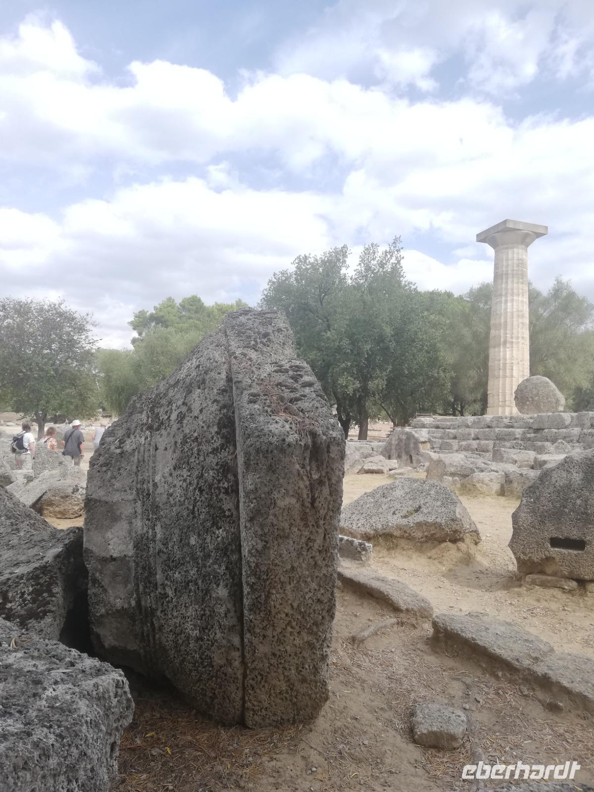 Der Zeus Tempel spielt selbstverständlich die wichtigste Rolle in der Anlage des Heiligtums. Eine gigantische dorische Säule, welche von Archäologen nachgebaut wurde, lässt uns die gewaltige Größe des Monumentes erahnen.