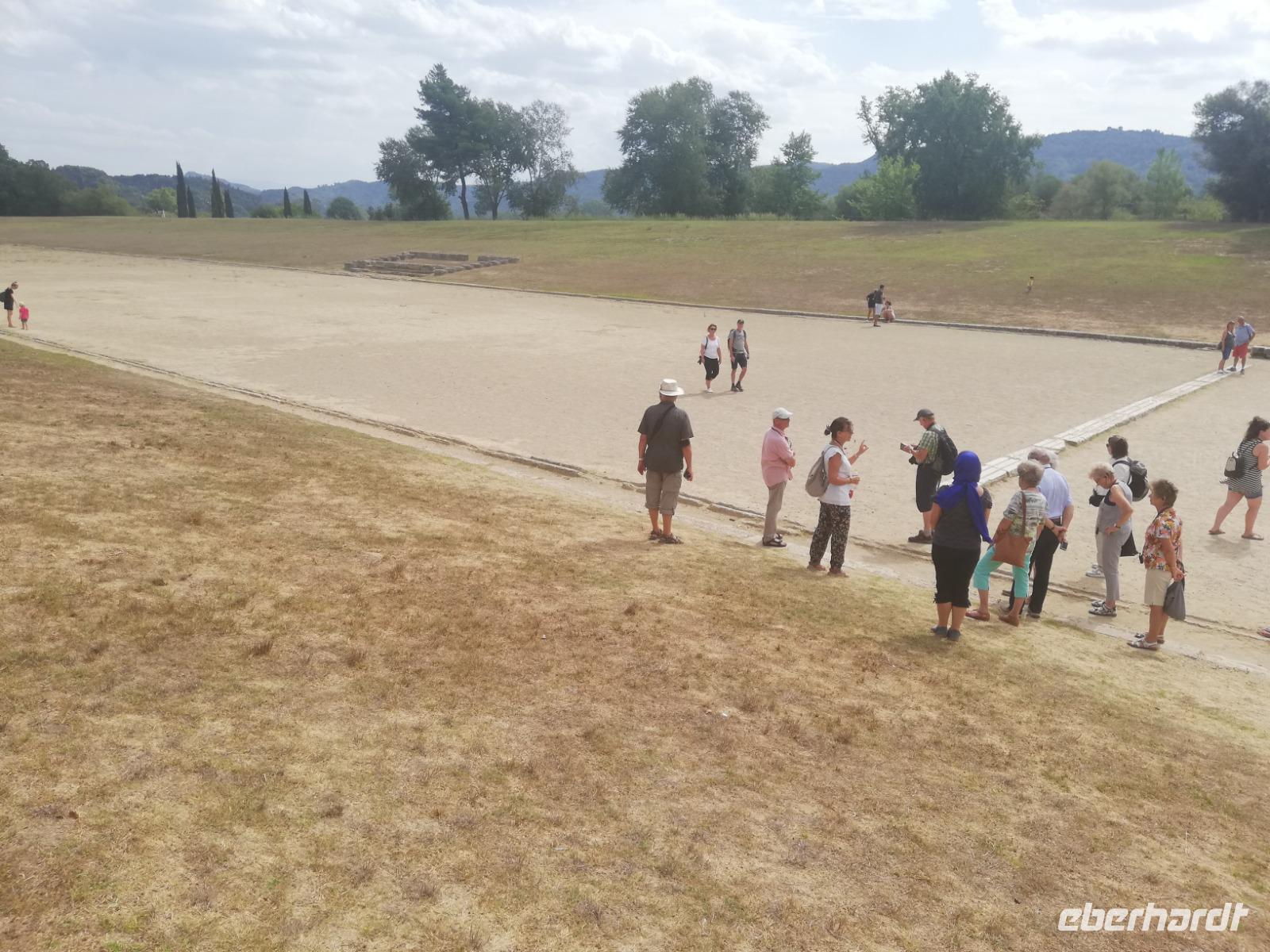 Die Sieger der olympischen Spiele erhielten dennoch kein Geld, sondern bekamen einen Kranz aus wilden Olivenbaumästen. Auch war es Frauen nicht gestattet bei den Spielen teilzunehmen oder gar zuzusehen. Wir erreichen ein römisches Tor und anschließend einen großen Platz - das Stadion von Olympia. Ein Gast und ich müssen aber dennoch austesten, ob wir der Götter würdig sind und wir rennen eine einfache Strecke hin und her über die 192m lange Bahn. Zum Glück dürfen wir unsere Kleidung anbehalten und erhalten anschließend einen großen Applaus - fast so groß wie der der 50.000 Zuschauer die hier ursprünglich Platz fanden. :)