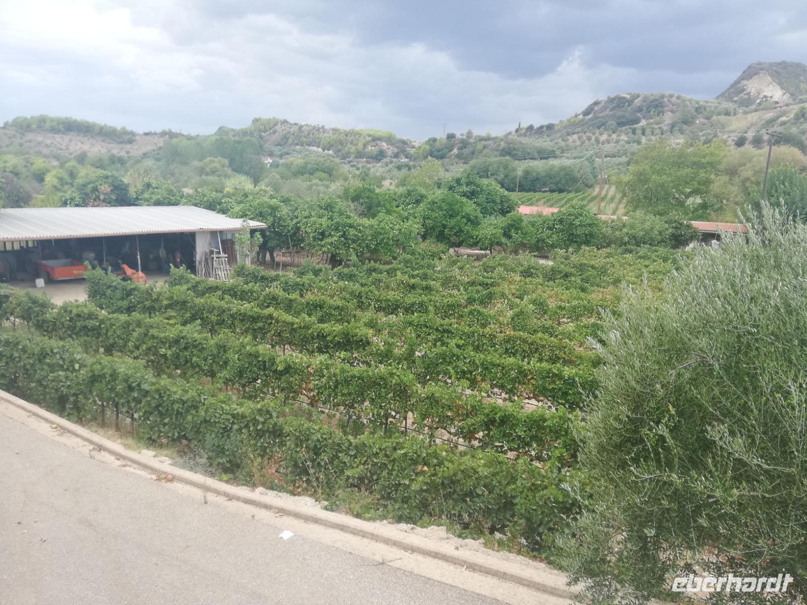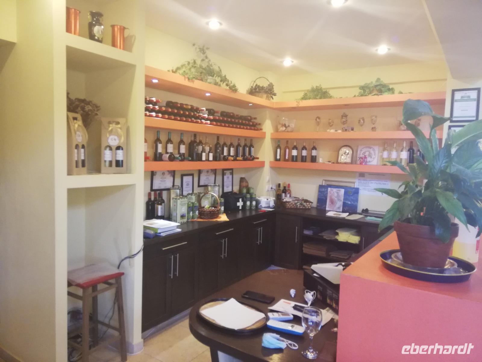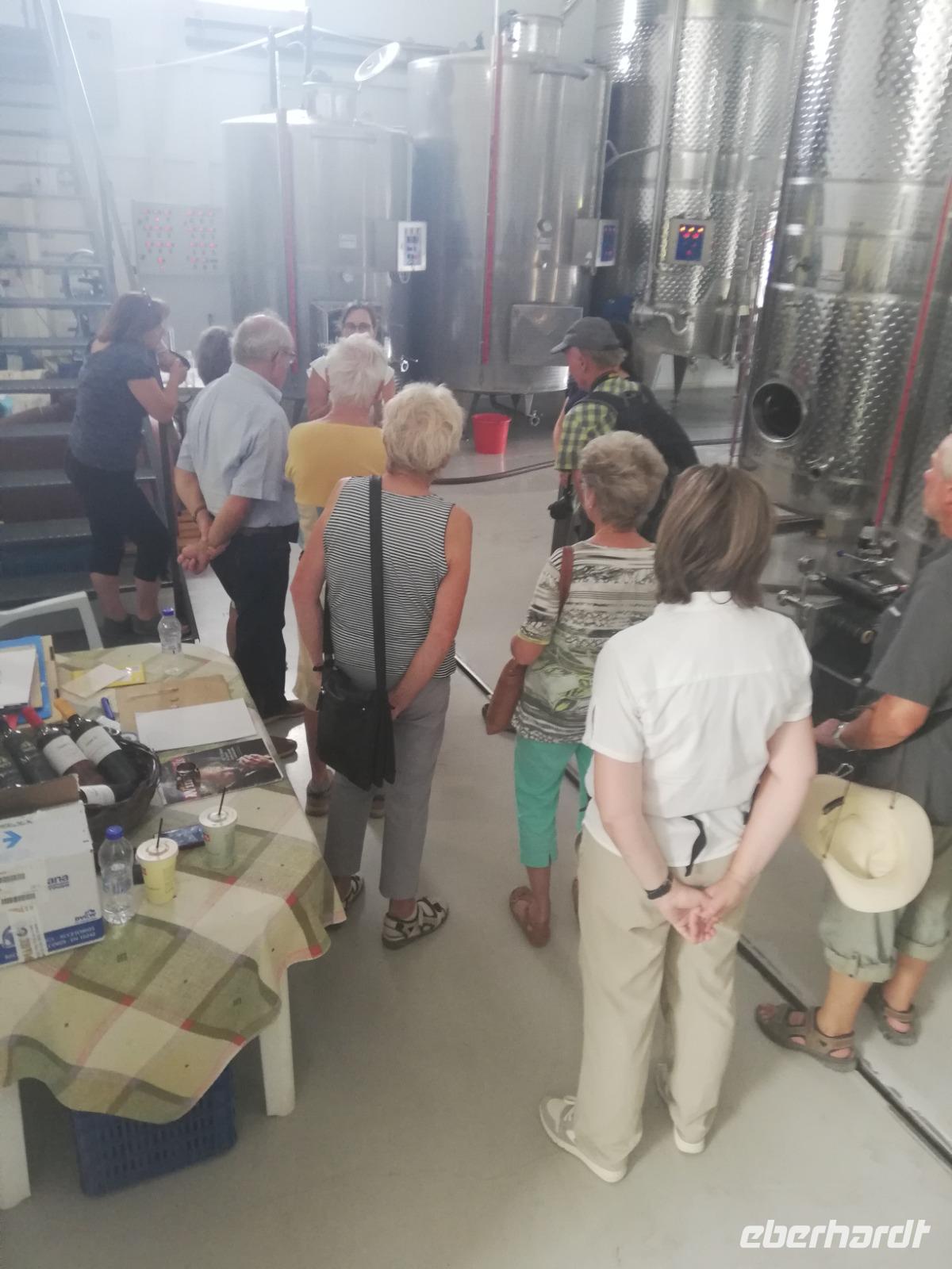 Am frühen Nachmittag erreichen wir das Weingut Olymipia Land Winery, einen Familienbetrieb, dessen Land seit 150 Jahren in deren Besitz ist. Wir erleben eine kleine Führung im Gut - der Vater hatte in den achtziger Jahren nur hobbymäßig mit dem Weinanbau begonnen, doch inzwischen produziert dieses Weingut über sieben verschiedene Sorten Wein wie z.B. Chardonnay, Syrah und Merlot auf 100 Hektar Land. Doch damit nicht genug - auch köstliches Olivenöl wird außerdem von den Bäumen auf einem Hain hinter den Weinreben gewonnen. Wir haben die Möglichkeit, in die Produktionshalle des Hauses einen Blick zu werfen und erfahren, dass sowohl Weiß- als auch Roséwein nach nur 5-6 Monaten bereits abgefüllt werden kann, nachdem er zwei Tage bei 10 Grad Celsius in großen Saftfässern garen konnte. Der Rotwein hingegen bleibt einen Monat in diesen Behältern und wird dann für ein Jahr in Eichenfässer gefüllt, wo er seine volle Reife und den Geschmack entfaltet. Wir erleben eine Verkostung von fünf Weinen und erhalten dazu noch einen kleinen Snack aus frischen Tomatenstückchen, Gurke, Brot und Käse. Einige von uns erwerben noch ein paar Flaschen der verkosteten Weine - wir möchten natürlich ein Andenken mit nach Hause nehmen! Wieder geht es zurück in den Bus - inzwischen hat sich der Himmel zugezogen und es regnet stark. Apostolis manövriert den Bus mi Bravour nach Kalamata, welches wir gern noch einmal gesehen hätten. Doch auch hier hat der Wettergott es heute nicht so gut mit uns gemeint und es regnet leider. Wir begeben uns also zurück in unser Hotel und lassen diesen sportlich köstlichen Tag noch einmal bei einem Abendessen im Hotel an uns vorbeiziehen.