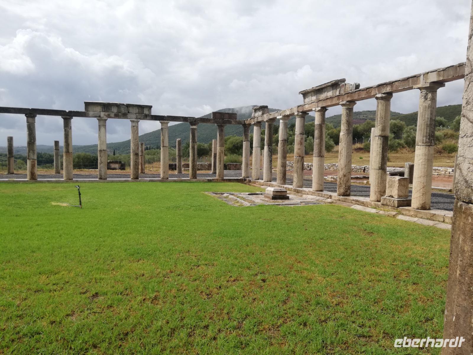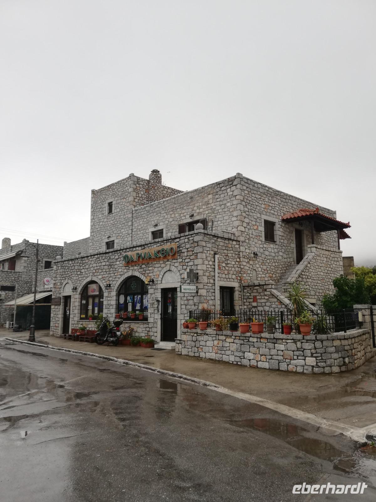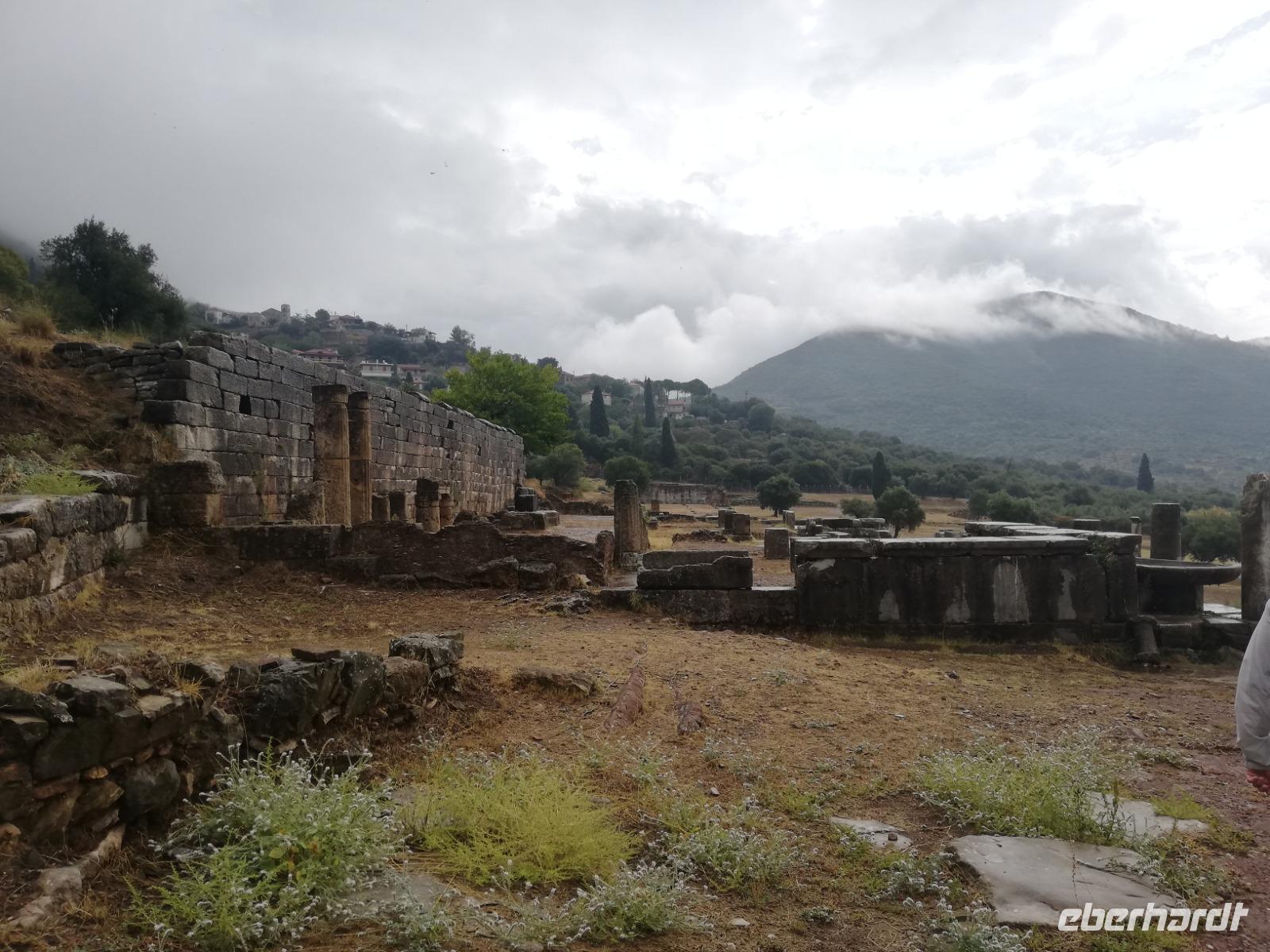 Die Landschaft zeigt sich uns heute etwas verregnet - wir starten ein wenig später in den Tag und unser Weg führt uns mit gepackten Koffern nach Myssene - eine ziemlich junge Ausgrabungsstätte etwas nördlich von Kalamata, die erst seit 1996 so richtig archäologisch erkundet wurde. Die dicken Regenwolken verhängen die großen Berge des Taygetos Gebirges und tauchen deren Gipfel in Ihre vernebelten Schwaden ein. Immer wieder kommt ein kleiner Schauer vom Himmel. Als wir nach circa 1,5 Stunden die alte Stadt Myssene erreichen, nieselt es zum Glück nur ein wenig und für die Zeit unserer Besichtigung hält das Wetter tatsächlich stand und mehr noch - es stibitzt sich auch einmal die Sonne durch die Wolkenlöcher- die Götter sind mit uns! Die Ausgrabungen, die wir hier betrachten können stammen aus dem 4.Jhd v.Chr. und wurden größtenteils durch Sponsoren finanziert. Direkt am Eingang zeigt sich uns ein antikes Theater. Dieses ist noch fast komplett im Urzustand erhalten, da es so viele Jahre unter Bäumen und Büschen behütet wurde. Des Weiteren sehen wir die Fundamente der Arsinoe Quelle, welche die Mutter des Eskulap war. Eine Verehrung eines Sterblichen oder Halbgottes , wie Eskulap (Vater war Gott Apollon) oder Arsinoe, war erst zu Zeiten der Römer üblich, was auf die Entstehungszeit der Quelle hinweist. Das Gelände ist sehr weitläufig und führt uns den Berg hinab erneut zu einem imposanten Stadion, in welchem Spiele und Wettkämpfe ausgetragen wurden. Deutlich wird zum zweiten Male die besondere Form des Stadions, welches immer zu einer Seite geöffnet ist. Die Wiesen um das Gelände herum sind saftig grün und strahlen im Sonnenlicht. Die quadratisch geformte Palästra mit Innenhof und dorischen Säulen - also die Trainingshalle der Sportler - ist hier noch deutlich zu erkennen. Ebenso wie die ehemaligen Waschräume mit instand gehaltenen „Waschbecken", deren Wasserzulauf aus einem benachbarten Bächlein kommt. Eine solche Art des Bades wurde in dieser Form wohl bisher nur in Myssene gefunden und stellt einen sehr hohen Wert dar. Auch in dieser Stadt gab es ein religiöses und politisches Zentrum - das Eskulapium, welchem regelmäßig Opfergaben und Geschenke wie Bronzestatuen und andere wertvolle Güter vermacht wurden. Neben einigen natürlichen Brunnen und dem Tempel der Artemis besaß Myssene eine gewaltige Stadtmauer, deren zwei erhaltene Türme wir im Anschluss noch besuchen. Die ursprüngliche Stadtmauer muss 9,5 km lang gewesen sein und bestand aus massivem Gestein, welches kein Gegner so schnell bezwang. Pünktlich mit dem Einsteigen in den Bus regnet es erneut gussartige Schauer vom Himmel. Das Sturmtief Ianos, welches über Griechenland liegt macht seinem Namen mit dem „Zweigesichtigen" alle Ehre. Wir benötigen bedingt durch das Wetter etwas mehr Zeit als geplant über die Bergstraße nach Itilo - dem Domizil, in welchem unser nächstes Hotel liegt. Über fast bis zu 360 Grad steile Serpentinen kämpft unser Bus gegen die Laune des Zeus an, hinauf und hinab fahren wir durch die wunderschöne Region des Taygetos Gebirges. Die Berge schmiegen sich eng aneinander und lassen einen Blick auf eine grandiose Aussicht zu. Wir erreichen die kurvige Halbinsel Mani - die Häuser sind hier größtenteils mit wunderschönen grauen und braunen Steinverzierungen geschmückt, welche die ganze Fassade sehr edel und gleichzeitig rustikal aussehen lassen. Leider spielt das Wetter nicht so mit wie gewollt und deshalb erreichen wir den hübschen Ort Areopoli erst am Nachmittag. Dort machen wir eine kleine Kaffeepause und schauen uns anschließend noch zwischen den malerischen Häusern des Dorfes um. Auf der Halbinsel Mani regnet es eigentlich nie, weshalb die Region nie beliebt war für etwaige Überfälle der Türken oder anderer Eroberer- der Boden hier ist wenig ertragreich und die dort lebenden Menschen hatten selbst zwischen den unterschiedlichen Dörfern große Konflikte auszutragen. Man sagt, Mani war bekannt als Heimat der Piraten - deshalb auch der Reichtum und die schöne Dekoration der Häuser. Wir erreichen schlussendlich Itilo und checken in dem familiengeführten Hotel ein - ein wunderschön kreativ erdachtes kleines Haus mit nur dekorativ eingerichteten Zimmern, allesamt im Stile der Region mit Steinverzierungen gehalten. Es liegt direkt am heute sehr aufgebrachten Meer und besitzt einen schönen Pool mit Blick auf die Wellen. Wir treffen uns um 19.00 Uhr und gehen dann in das Dörfchen, in welche wir einen Tisch für ein gemeinsames Abendessen reserviert haben. Die Auswahl ist sehr groß: von Kalbsleber, Lamm mit Kritharaki-nudeln, Rippchen, aber auch Sardellen und Rind ist hier alles dabei - und es schmeckt KÖSTLICH! Eberhardt spendiert hier heute eine Runde schmackhaften Ouzo - und nachdem wir uns kugelrund gegessen haben, laufen wir wieder fünf Minuten zurück in unsere Unterkunft - ISASSAS!!!