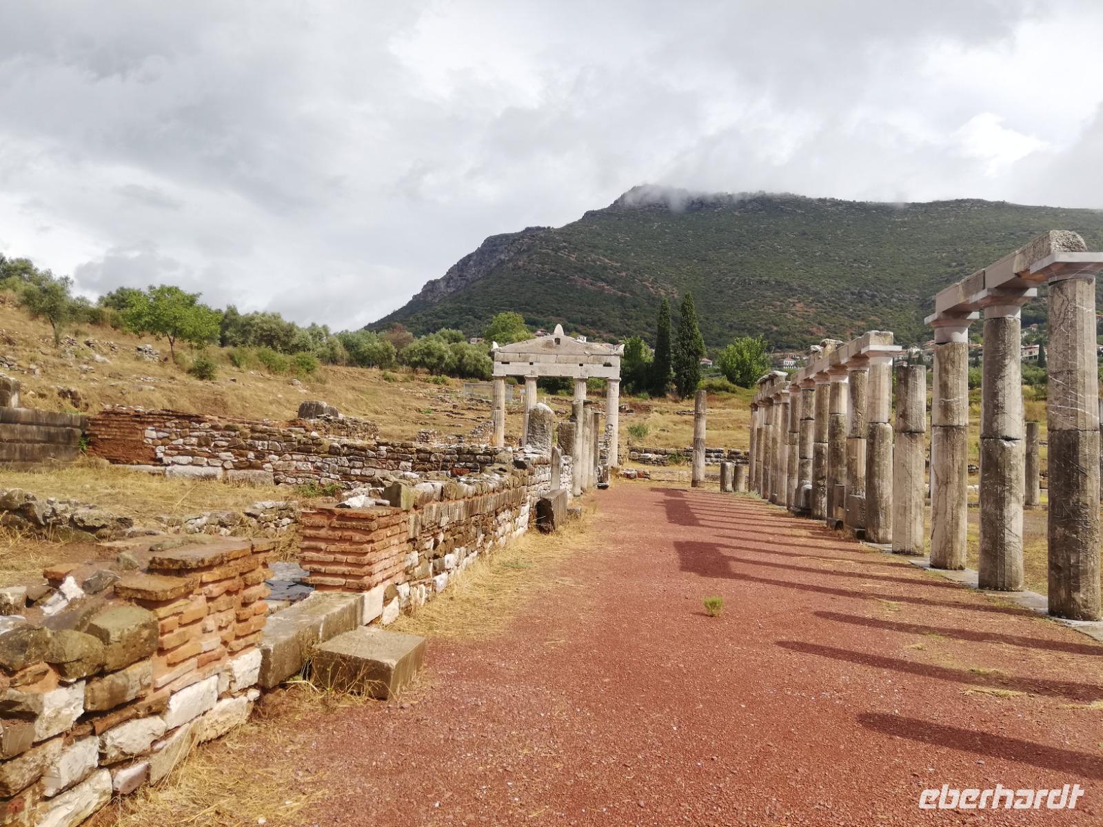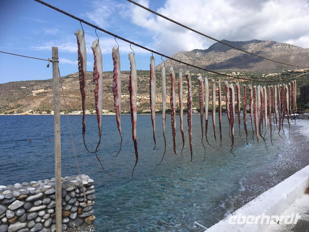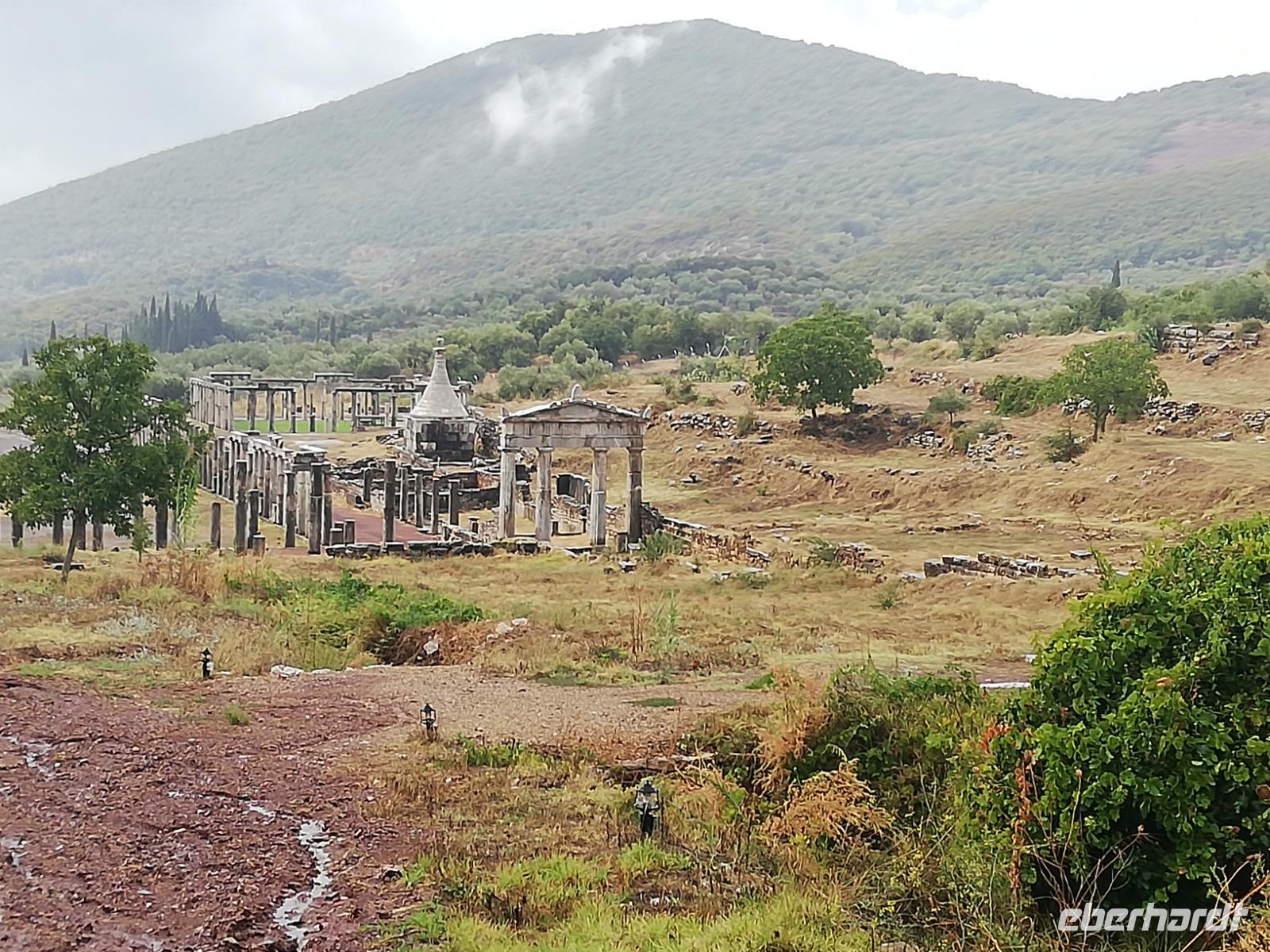 Die Landschaft zeigt sich uns heute etwas verregnet - wir starten ein wenig später in den Tag und unser Weg führt uns mit gepackten Koffern nach Myssene - eine ziemlich junge Ausgrabungsstätte etwas nördlich von Kalamata, die erst seit 1996 so richtig archäologisch erkundet wurde. Die dicken Regenwolken verhängen die großen Berge des Taygetos Gebirges und tauchen deren Gipfel in Ihre vernebelten Schwaden ein. Immer wieder kommt ein kleiner Schauer vom Himmel. Als wir nach circa 1,5 Stunden die alte Stadt Myssene erreichen, nieselt es zum Glück nur ein wenig und für die Zeit unserer Besichtigung hält das Wetter tatsächlich stand und mehr noch - es stibitzt sich auch einmal die Sonne durch die Wolkenlöcher- die Götter sind mit uns! Die Ausgrabungen, die wir hier betrachten können stammen aus dem 4.Jhd v.Chr. und wurden größtenteils durch Sponsoren finanziert. Direkt am Eingang zeigt sich uns ein antikes Theater. Dieses ist noch fast komplett im Urzustand erhalten, da es so viele Jahre unter Bäumen und Büschen behütet wurde. Des Weiteren sehen wir die Fundamente der Arsinoe Quelle, welche die Mutter des Eskulap war. Eine Verehrung eines Sterblichen oder Halbgottes , wie Eskulap (Vater war Gott Apollon) oder Arsinoe, war erst zu Zeiten der Römer üblich, was auf die Entstehungszeit der Quelle hinweist. Das Gelände ist sehr weitläufig und führt uns den Berg hinab erneut zu einem imposanten Stadion, in welchem Spiele und Wettkämpfe ausgetragen wurden. Deutlich wird zum zweiten Male die besondere Form des Stadions, welches immer zu einer Seite geöffnet ist. Die Wiesen um das Gelände herum sind saftig grün und strahlen im Sonnenlicht. Die quadratisch geformte Palästra mit Innenhof und dorischen Säulen - also die Trainingshalle der Sportler - ist hier noch deutlich zu erkennen. Ebenso wie die ehemaligen Waschräume mit instand gehaltenen „Waschbecken", deren Wasserzulauf aus einem benachbarten Bächlein kommt. Eine solche Art des Bades wurde in dieser Form wohl bisher nur in Myssene gefunden und stellt einen sehr hohen Wert dar. Auch in dieser Stadt gab es ein religiöses und politisches Zentrum - das Eskulapium, welchem regelmäßig Opfergaben und Geschenke wie Bronzestatuen und andere wertvolle Güter vermacht wurden. Neben einigen natürlichen Brunnen und dem Tempel der Artemis besaß Myssene eine gewaltige Stadtmauer, deren zwei erhaltene Türme wir im Anschluss noch besuchen. Die ursprüngliche Stadtmauer muss 9,5 km lang gewesen sein und bestand aus massivem Gestein, welches kein Gegner so schnell bezwang. Pünktlich mit dem Einsteigen in den Bus regnet es erneut gussartige Schauer vom Himmel. Das Sturmtief Ianos, welches über Griechenland liegt macht seinem Namen mit dem „Zweigesichtigen" alle Ehre. Wir benötigen bedingt durch das Wetter etwas mehr Zeit als geplant über die Bergstraße nach Itilo - dem Domizil, in welchem unser nächstes Hotel liegt. Über fast bis zu 360 Grad steile Serpentinen kämpft unser Bus gegen die Laune des Zeus an, hinauf und hinab fahren wir durch die wunderschöne Region des Taygetos Gebirges. Die Berge schmiegen sich eng aneinander und lassen einen Blick auf eine grandiose Aussicht zu. Wir erreichen die kurvige Halbinsel Mani - die Häuser sind hier größtenteils mit wunderschönen grauen und braunen Steinverzierungen geschmückt, welche die ganze Fassade sehr edel und gleichzeitig rustikal aussehen lassen. Leider spielt das Wetter nicht so mit wie gewollt und deshalb erreichen wir den hübschen Ort Areopoli erst am Nachmittag. Dort machen wir eine kleine Kaffeepause und schauen uns anschließend noch zwischen den malerischen Häusern des Dorfes um. Auf der Halbinsel Mani regnet es eigentlich nie, weshalb die Region nie beliebt war für etwaige Überfälle der Türken oder anderer Eroberer- der Boden hier ist wenig ertragreich und die dort lebenden Menschen hatten selbst zwischen den unterschiedlichen Dörfern große Konflikte auszutragen. Man sagt, Mani war bekannt als Heimat der Piraten - deshalb auch der Reichtum und die schöne Dekoration der Häuser. Wir erreichen schlussendlich Itilo und checken in dem familiengeführten Hotel ein - ein wunderschön kreativ erdachtes kleines Haus mit nur dekorativ eingerichteten Zimmern, allesamt im Stile der Region mit Steinverzierungen gehalten. Es liegt direkt am heute sehr aufgebrachten Meer und besitzt einen schönen Pool mit Blick auf die Wellen. Wir treffen uns um 19.00 Uhr und gehen dann in das Dörfchen, in welche wir einen Tisch für ein gemeinsames Abendessen reserviert haben. Die Auswahl ist sehr groß: von Kalbsleber, Lamm mit Kritharaki-nudeln, Rippchen, aber auch Sardellen und Rind ist hier alles dabei - und es schmeckt KÖSTLICH! Eberhardt spendiert hier heute eine Runde schmackhaften Ouzo - und nachdem wir uns kugelrund gegessen haben, laufen wir wieder fünf Minuten zurück in unsere Unterkunft - ISASSAS!!!