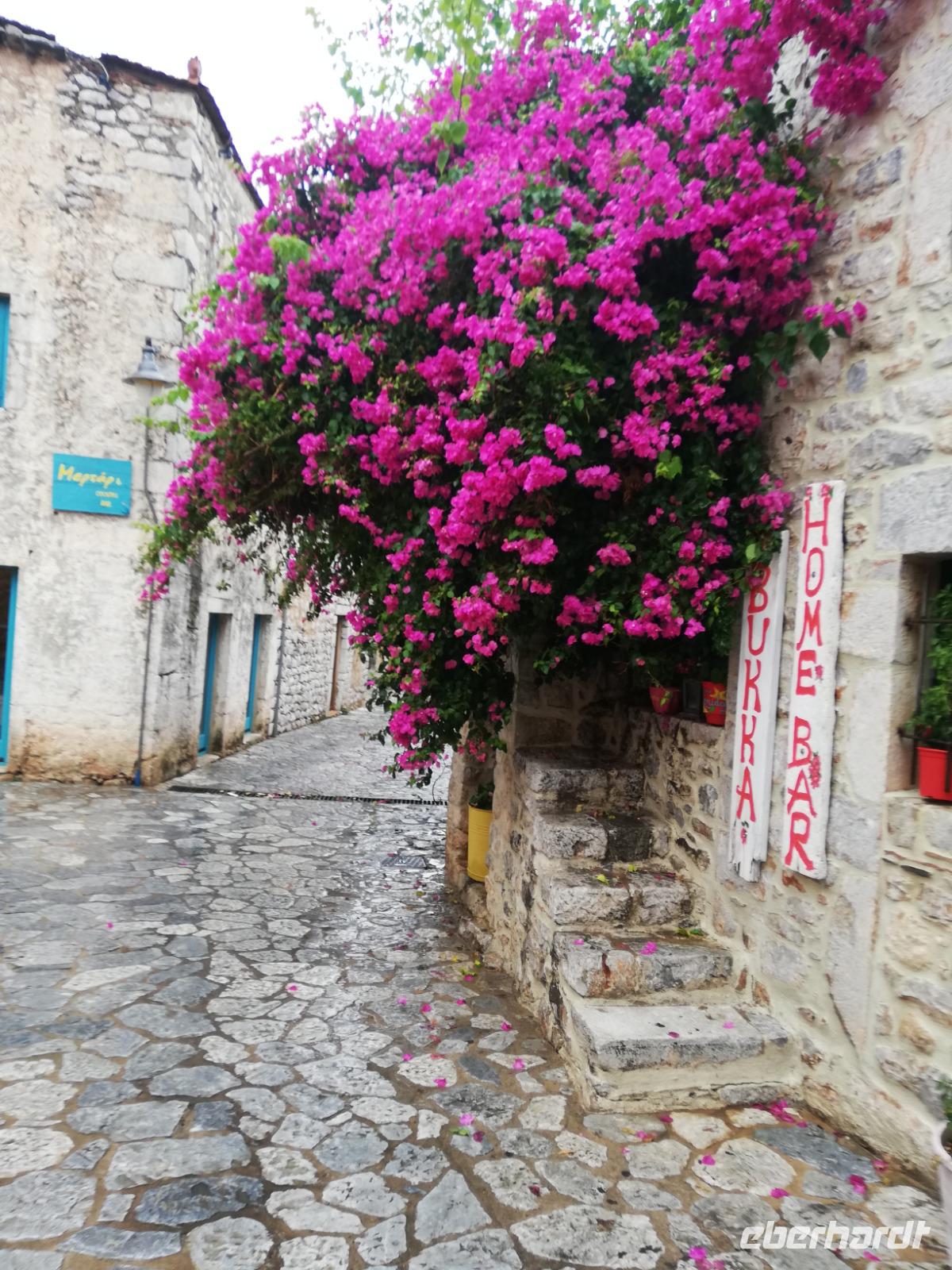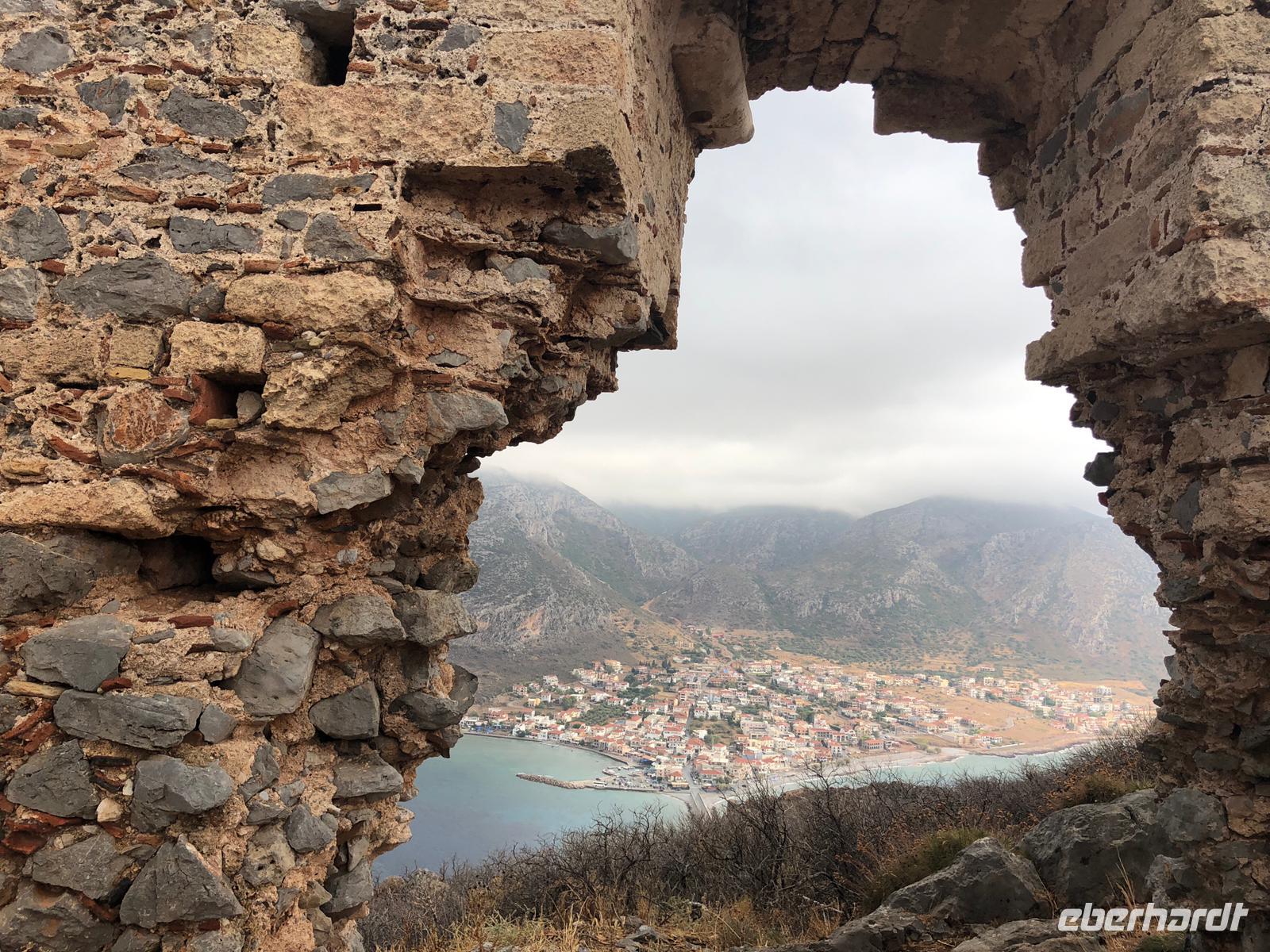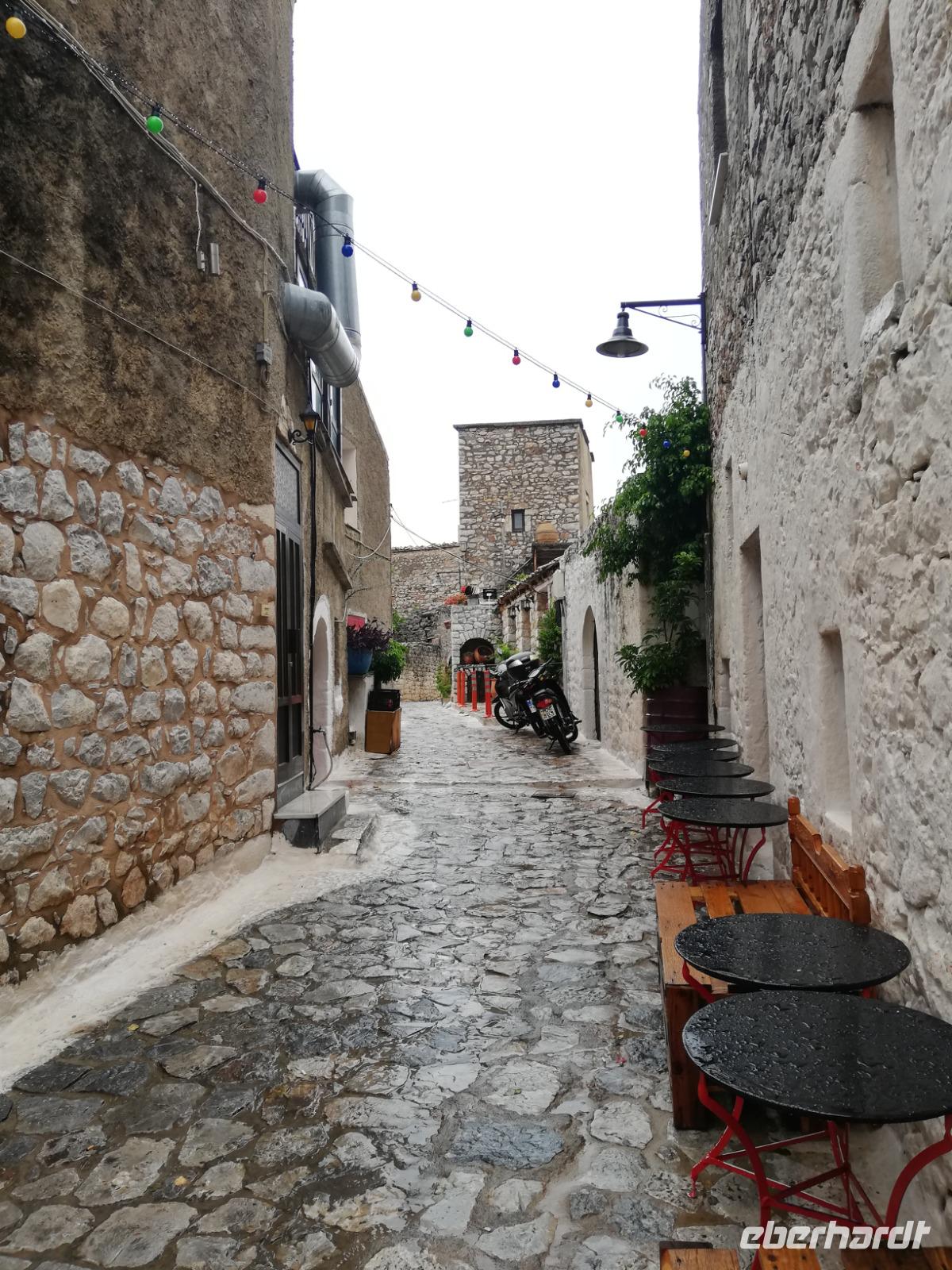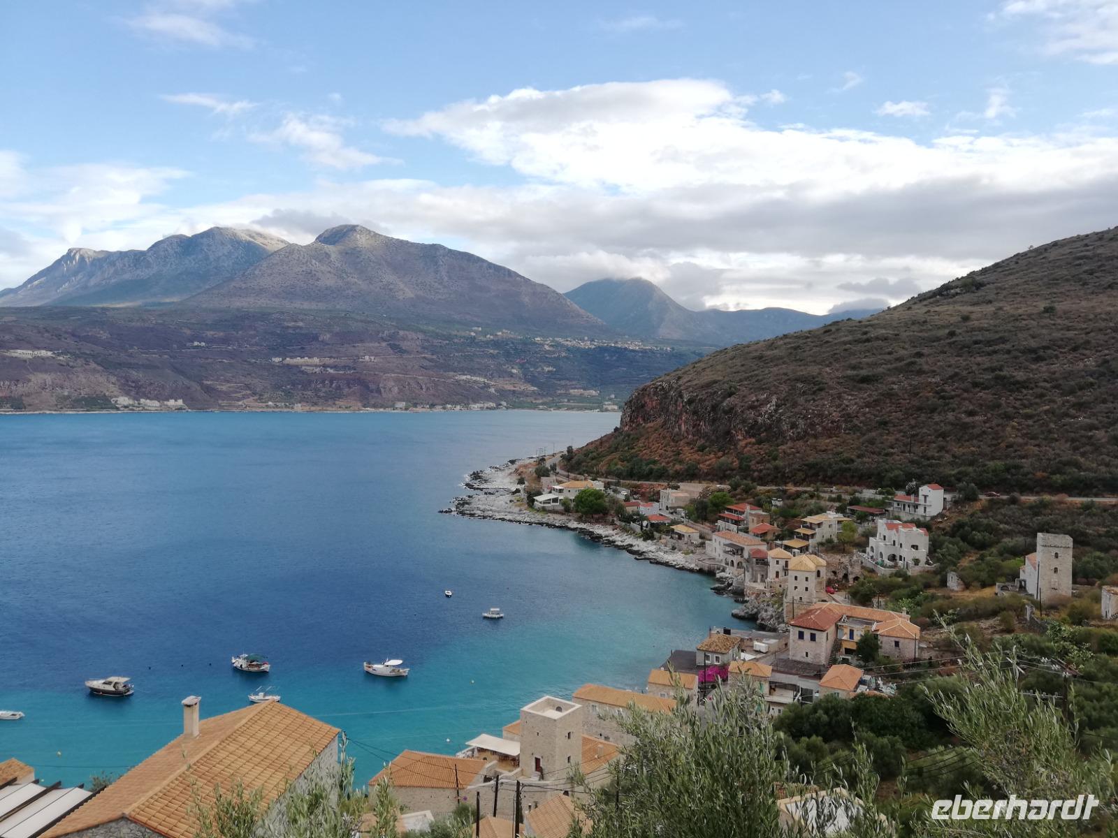 Der Regen lässt ein wenig nach und wir laufen durch ein gewölbtes Steintor, welches in einen kleinen Tunnel führt, in die Stadt. Sowohl der Boden, als auch die Häuser sind wieder in dem hübschen steinernen Dekor gehalten. Wir entgehen den letzten Topfen bei einem Heißgetränk in einem Café und trauen uns dann hinaus in die Gässchen. Wir haben hier drei Stunden Freizeit für dieses idyllische Kleinod - zum Erkunden und Einkaufen in den kleinen Geschäften, zum Mittag essen oder einfach nur, um die einzigartige Aussicht genießen. Wir wagen uns hinauf auf den Berg und die Festung der ehemals durch 40.000 Menschen bewohnten Stadt - es umhüllt uns ein leichter Geruch von Salbei. Der Weg ist ein wenig beschwerlich auch aufgrund der feuchten Steine und wir machen nach ein paar Metern gern ein Päuschen, um ein tolles Foto zu schießen. Das türkisblau bis hin zu dunkelblauem Meer bildet einen grandiosen Kontrast du den gelb - weißen Häusern, die mit roten Ziegelsteinen gedeckt sind. Wir schreiten weiter nach oben und betreten schlussendlich den Eingang der alten Festungsanlage. Wir sehen hier oben Überreste der Hausmauern aus byzantinischer Zeit und können auch einzelne Räume erkennen. Bis zu 8.000 Häuser waren auf diesem oberen Teil beheimatet. Die Steine, welche sowohl als Fundamente, als auch für den Bau im Allgemeinen verwendet wurden, wurden teils vom Felsmassiv abgehackt, dennoch haben einen Großteil Esel über Jahre lang hinauf geschleppt. Schlussendlich erreichen wir die obere Kirche der heiligen Sophia - ein Bau aus dem 12. Jahrhundert. Es handelt sich hierbei um eine oktagonale Kreuzkuppelkirche, deren oberer Teil von acht Säulen getragen wird. Es ist sonnig und wir genießen das gute Wetter - doch schon entdecken wir eine schwarze Front, welche vom Meer aus mit dem Wind in unsere Richtung zieht. Schnell bewegen wir uns die Steinstufen hinab ins Dorf - leider für Viele zu spät denn was leicht beginnt wird von Minute zu Minute stärker und der Regen klatscht nur so auf unsere Jacken - aus dem kleinen Bächlein, welches sich den Berg hinabsäuselte, wird innerhalb von Sekunden ein starker Bach, der ein Laufen ohne nasse Füße nicht mehr möglich macht. Einige schaffen es ins Trockene, Andere werden dennoch von oben bis unten durchgeweicht. Wir treffen uns pünktlich um drei wieder am Eingangstor und Eberhardt spendiert den Shuttlebus zur Brücke, da unser großer Reisebus leider keinen Zugang auf die Insel hat und Viele sehr nass geworden sind - der Regen hat auch noch nicht komplett aufgehört. Etwa zwei Stunden später erreichen wir Itilo und gehen zunächst in unsere Zimmer, um unsere Sachen auszuwringen und uns umzuziehen. Wieder finden wir uns um 19.00 Uhr ein, um in der Taverne vom gestrigen Abend ein köstliches Mal zu empfangen. Für uns wurde auf Nachfrage sogar ein Hühnchen geschlachtet - Wer hat schon einmal etwas so Frisches gegessen? Das Wetter hier in der Bucht von Limeni ist inzwischen etwas aufgeklarter - wir haben Glück und können aus dem Restaurant heraus einen wunderschönen tieforangenen Sonnenuntergang genießen. Nach den Vorspeisen mit Oliven, Olivenöl, Brot und selbstverständlich einem Ouzo, bekommen wir sehr schnell unsere Hauptspeisen serviert, bei welchen nun heute auch das Hühnchen, Lamm und Kalb dabei ist. Wir schließen unseren Magen mit ein paar frischen Wassermelonen und Weintrauben, bevor wir zurück ins Hotel laufen.