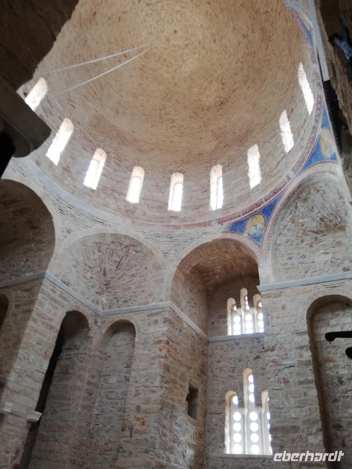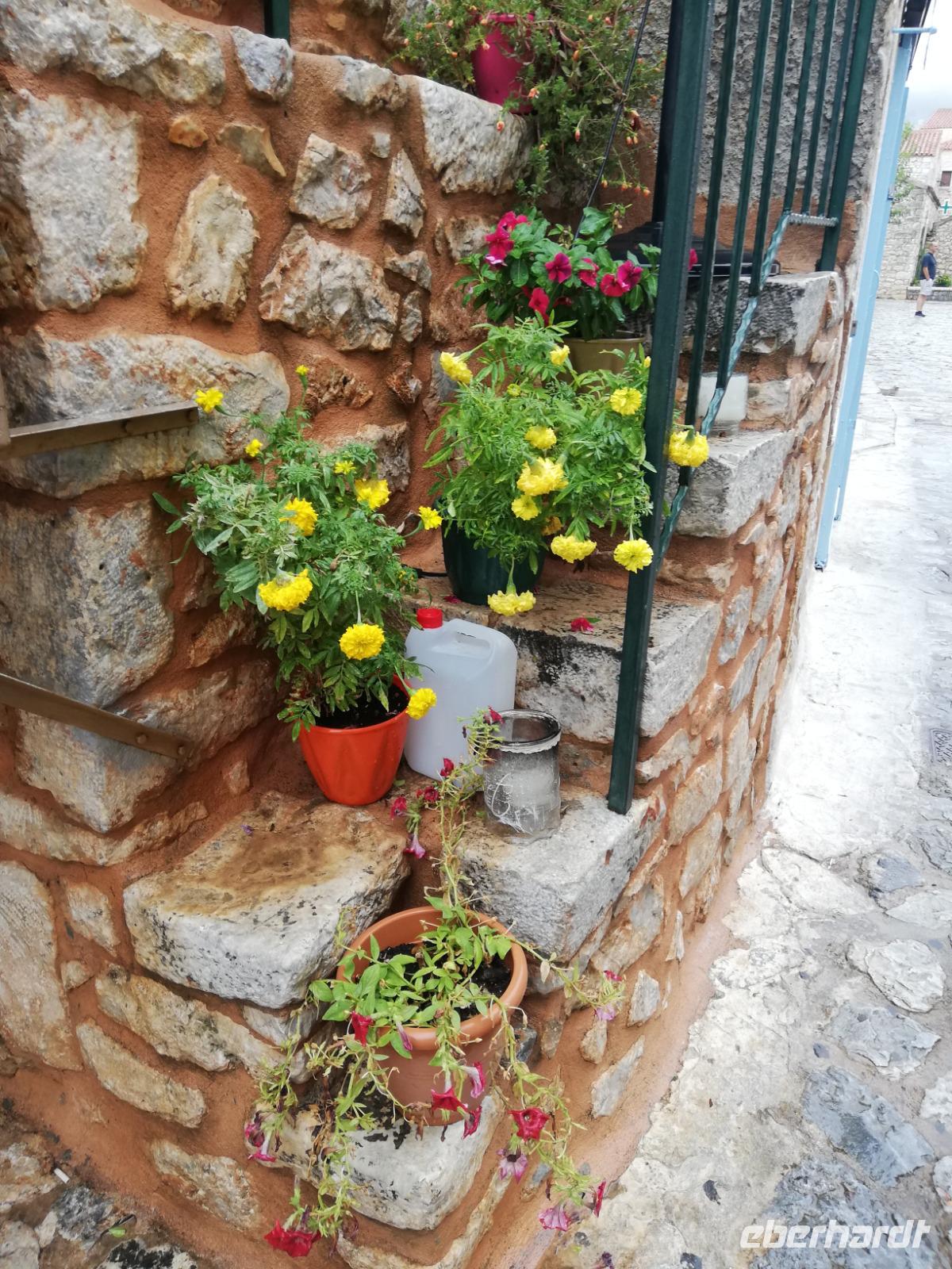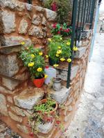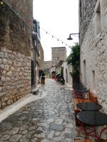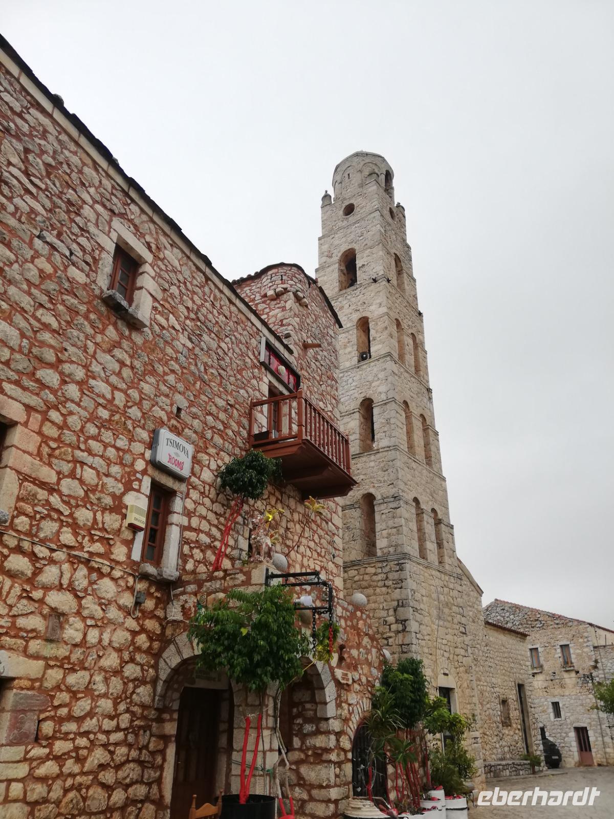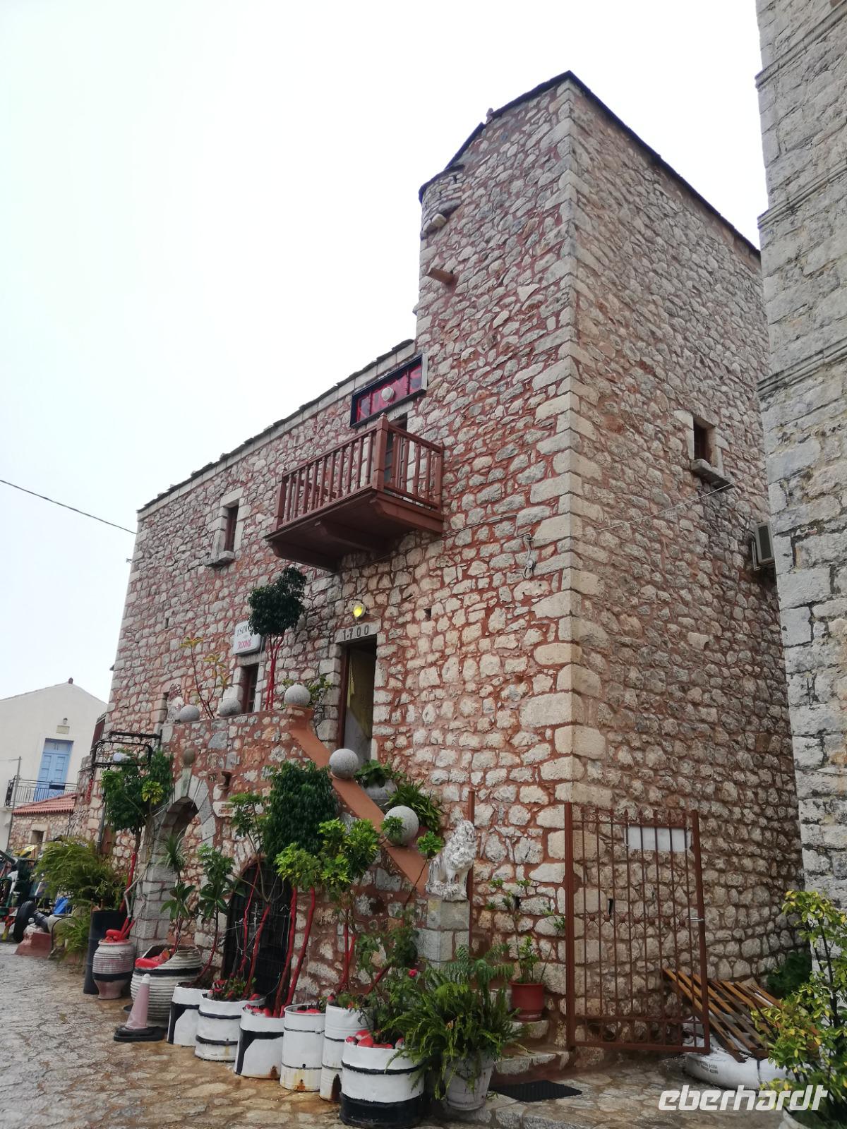 Der Regen lässt ein wenig nach und wir laufen durch ein gewölbtes Steintor, welches in einen kleinen Tunnel führt, in die Stadt. Sowohl der Boden, als auch die Häuser sind wieder in dem hübschen steinernen Dekor gehalten. Wir entgehen den letzten Topfen bei einem Heißgetränk in einem Café und trauen uns dann hinaus in die Gässchen. Wir haben hier drei Stunden Freizeit für dieses idyllische Kleinod - zum Erkunden und Einkaufen in den kleinen Geschäften, zum Mittag essen oder einfach nur, um die einzigartige Aussicht genießen. Wir wagen uns hinauf auf den Berg und die Festung der ehemals durch 40.000 Menschen bewohnten Stadt - es umhüllt uns ein leichter Geruch von Salbei. Der Weg ist ein wenig beschwerlich auch aufgrund der feuchten Steine und wir machen nach ein paar Metern gern ein Päuschen, um ein tolles Foto zu schießen. Das türkisblau bis hin zu dunkelblauem Meer bildet einen grandiosen Kontrast du den gelb - weißen Häusern, die mit roten Ziegelsteinen gedeckt sind. Wir schreiten weiter nach oben und betreten schlussendlich den Eingang der alten Festungsanlage. Wir sehen hier oben Überreste der Hausmauern aus byzantinischer Zeit und können auch einzelne Räume erkennen. Bis zu 8.000 Häuser waren auf diesem oberen Teil beheimatet. Die Steine, welche sowohl als Fundamente, als auch für den Bau im Allgemeinen verwendet wurden, wurden teils vom Felsmassiv abgehackt, dennoch haben einen Großteil Esel über Jahre lang hinauf geschleppt. Schlussendlich erreichen wir die obere Kirche der heiligen Sophia - ein Bau aus dem 12. Jahrhundert. Es handelt sich hierbei um eine oktagonale Kreuzkuppelkirche, deren oberer Teil von acht Säulen getragen wird. Es ist sonnig und wir genießen das gute Wetter - doch schon entdecken wir eine schwarze Front, welche vom Meer aus mit dem Wind in unsere Richtung zieht. Schnell bewegen wir uns die Steinstufen hinab ins Dorf - leider für Viele zu spät denn was leicht beginnt wird von Minute zu Minute stärker und der Regen klatscht nur so auf unsere Jacken - aus dem kleinen Bächlein, welches sich den Berg hinabsäuselte, wird innerhalb von Sekunden ein starker Bach, der ein Laufen ohne nasse Füße nicht mehr möglich macht. Einige schaffen es ins Trockene, Andere werden dennoch von oben bis unten durchgeweicht. Wir treffen uns pünktlich um drei wieder am Eingangstor und Eberhardt spendiert den Shuttlebus zur Brücke, da unser großer Reisebus leider keinen Zugang auf die Insel hat und Viele sehr nass geworden sind - der Regen hat auch noch nicht komplett aufgehört. Etwa zwei Stunden später erreichen wir Itilo und gehen zunächst in unsere Zimmer, um unsere Sachen auszuwringen und uns umzuziehen. Wieder finden wir uns um 19.00 Uhr ein, um in der Taverne vom gestrigen Abend ein köstliches Mal zu empfangen. Für uns wurde auf Nachfrage sogar ein Hühnchen geschlachtet - Wer hat schon einmal etwas so Frisches gegessen? Das Wetter hier in der Bucht von Limeni ist inzwischen etwas aufgeklarter - wir haben Glück und können aus dem Restaurant heraus einen wunderschönen tieforangenen Sonnenuntergang genießen. Nach den Vorspeisen mit Oliven, Olivenöl, Brot und selbstverständlich einem Ouzo, bekommen wir sehr schnell unsere Hauptspeisen serviert, bei welchen nun heute auch das Hühnchen, Lamm und Kalb dabei ist. Wir schließen unseren Magen mit ein paar frischen Wassermelonen und Weintrauben, bevor wir zurück ins Hotel laufen.