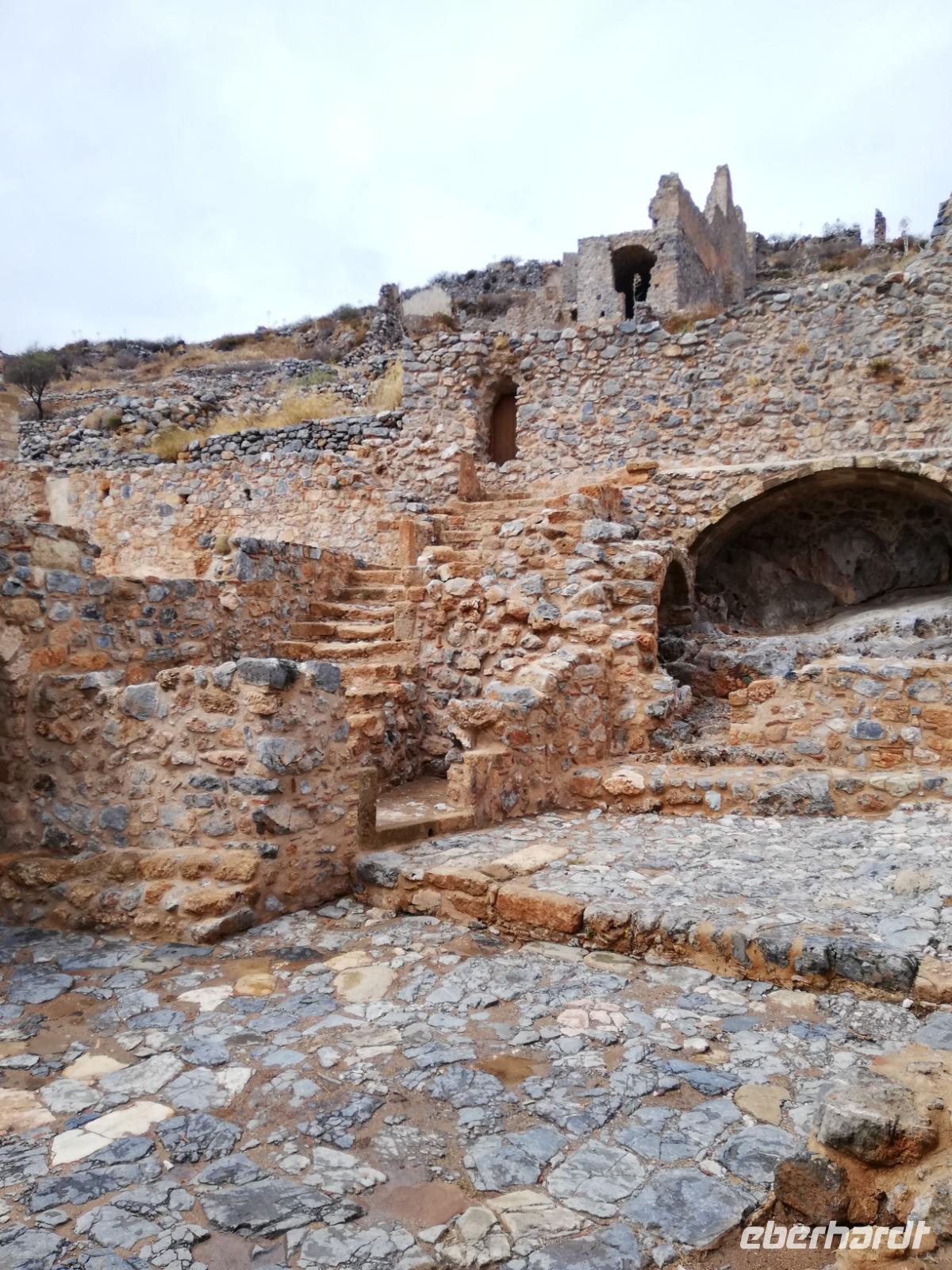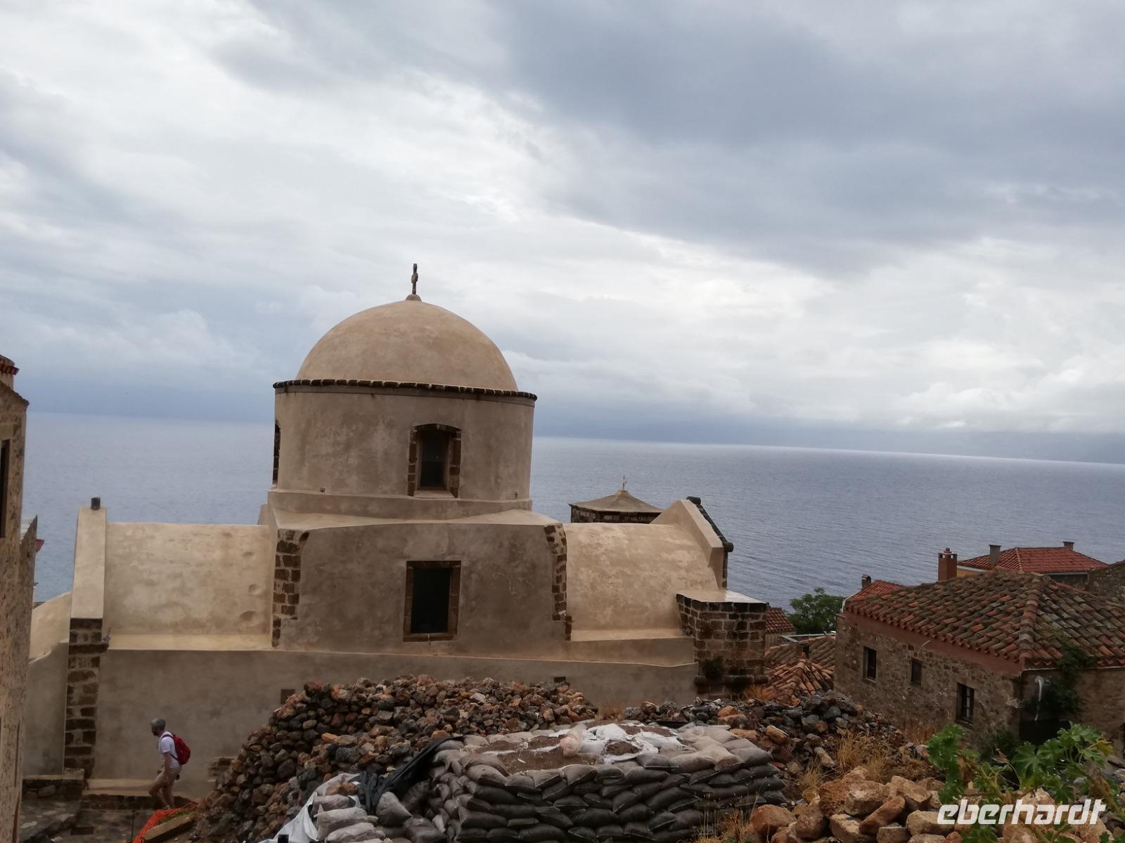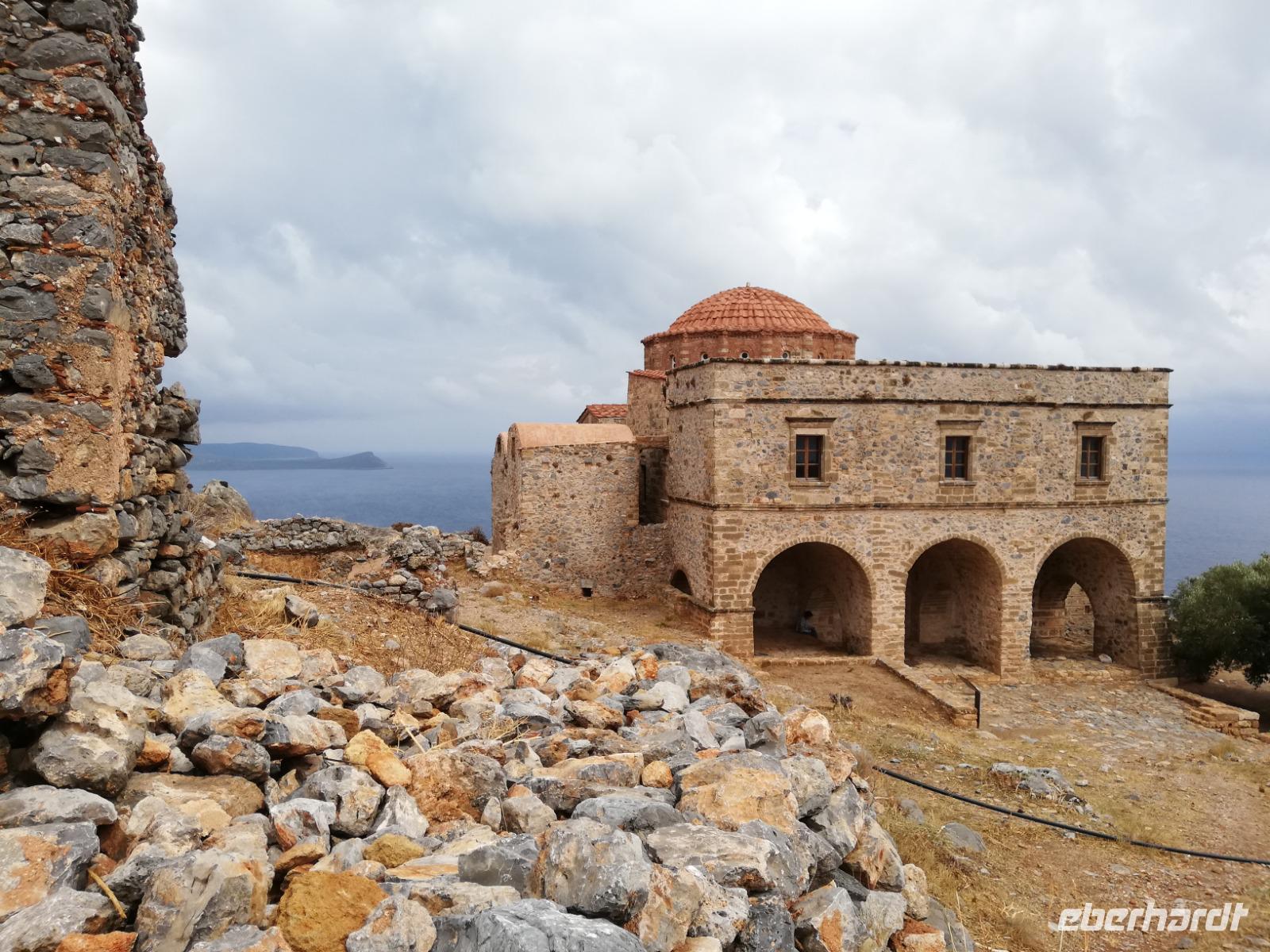 Weiter führt uns unser heutiger Ausflug nach Monemvasia, was so viel bedeutet wie „einziger Zugang" - und zu Recht: die kleine Insel besteht zum Großteil aus einem gigantischen Felsen mit bis zu 300 Metern Höhe. Nur eine einzige Brücke verbindet das Festland mit ihr. Gegen Mittag erreichen wir die Stadt und müssen leider noch ein wenig im Bus warten, da ein schwallartiger Regenguss uns am Aussteigen ohne komplette Dusche hindert. Vor Monemvasia beim Kap Maleas sind die tiefsten Stellen des Mittelmeeres bis zu 4000 m zu verzeichnen. Man sagte damals, dass dies der Eingang in die Unterwelt sei, da so viele Schiffe und Seefahrer bei schlechtem Wetter in den Tiefen versanken.