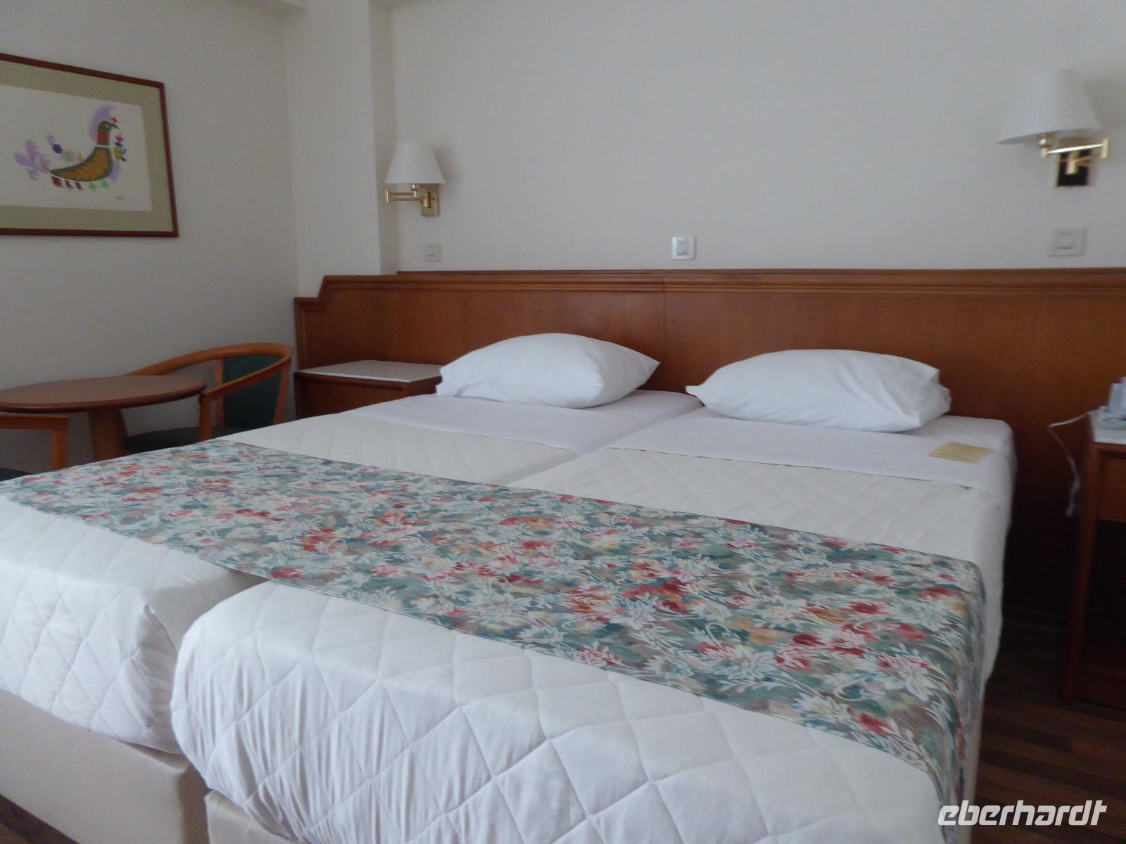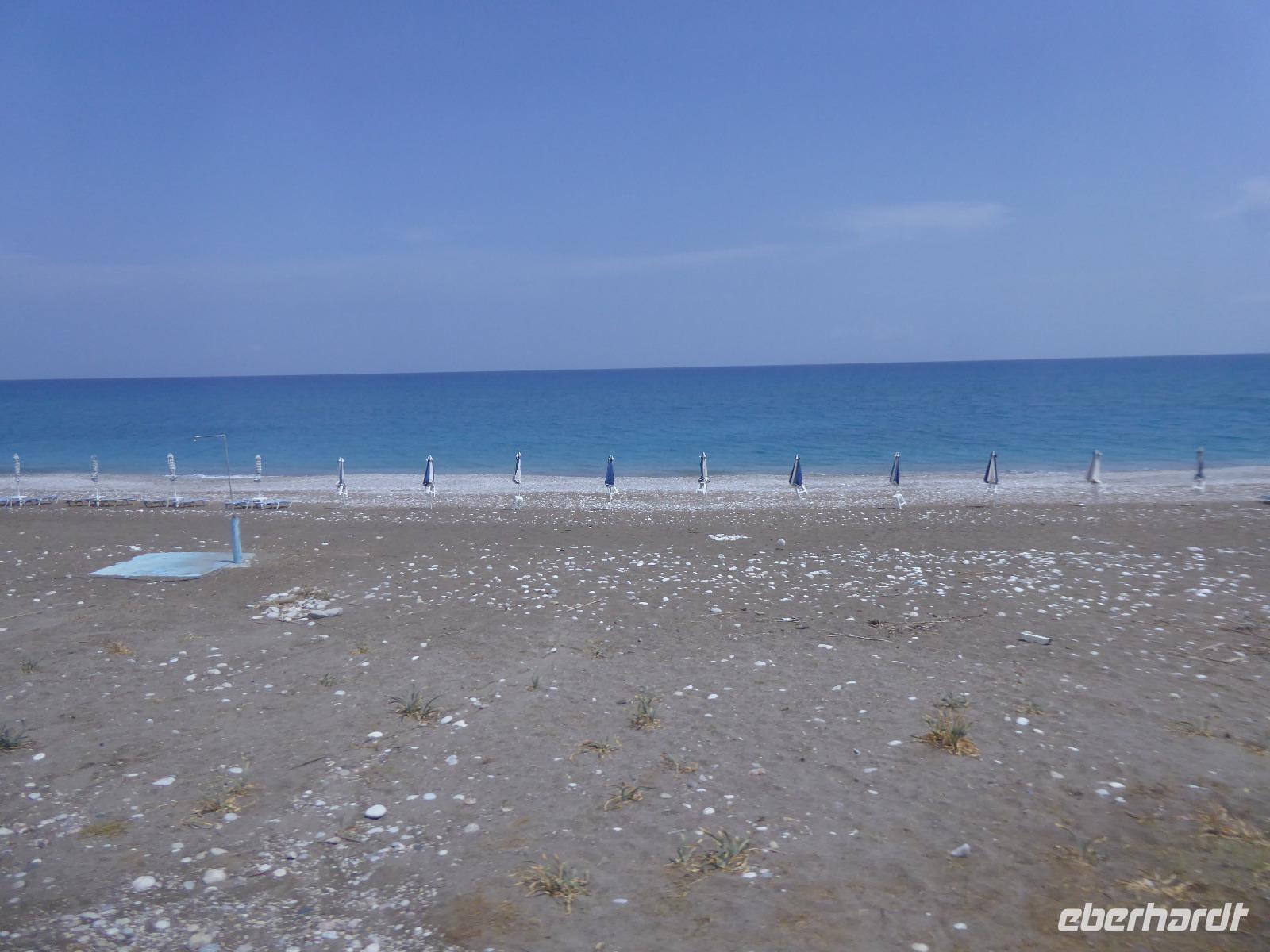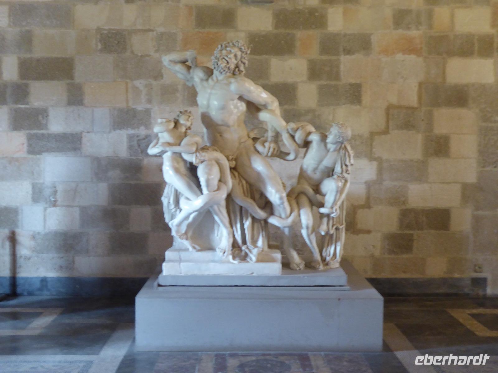 Recht früh geht es los, denn unsere Reisenden sollen doch die Zeit in ihrem Urlaub maximal nutzen können. Also fliegen wir um halb sieben ab Dresden nach Rhodos. Die Fluggesellschaft ist die Germania, Pilot und Stewardessen freundlich und serviceorientiert. Zu unserer Gruppe gehören außerdem Gäste, die aus Leipzig und Düsseldorf anreisen. Am Flughafen Rhodos kommt unser Gepäck vollzählig an und in einer knappen halben Stunde erreichen wir unser Hotel Apollo in Faliraki. In einer großen Lobby erwarten uns fleißige Mitarbeiter an der Rezeption und fast alle Gäste können sofort ihr Zimmer beziehen. Das ist nicht selbstverständlich, denn der Check out ist erst um 12 Uhr und alle Zimmer müssen dann gereinigt werden. Aber wir haben Glück und sind´s zufrieden. Der Nachmittag steht zur freien Verfügung. Wir können den (heißen) Strand erobern, im Pool baden oder in der Snack Bar Mittag essen. (Ein kleiner Salat kostet 5 €, ein großer 8,-; bei den warmen Speisen sieht es ähnlich aus). In der Lobby befindet sich ein ziemlich großer Souvenirladen, in dem wir uns auch mit Wasser versorgen können. Halb acht treffen wir uns in der Lobby und gehen gemeinsam ins Hotel-Restaurant zum Abendessen. Das Buffet quillt über von Köstlichkeiten, es gibt griechischen Salat, Sushi, auch Pommes und Hühnchen, ein Obstbuffet und natürlich Kuchen und Süßigkeiten. So kann der erste Abend ausklingen.