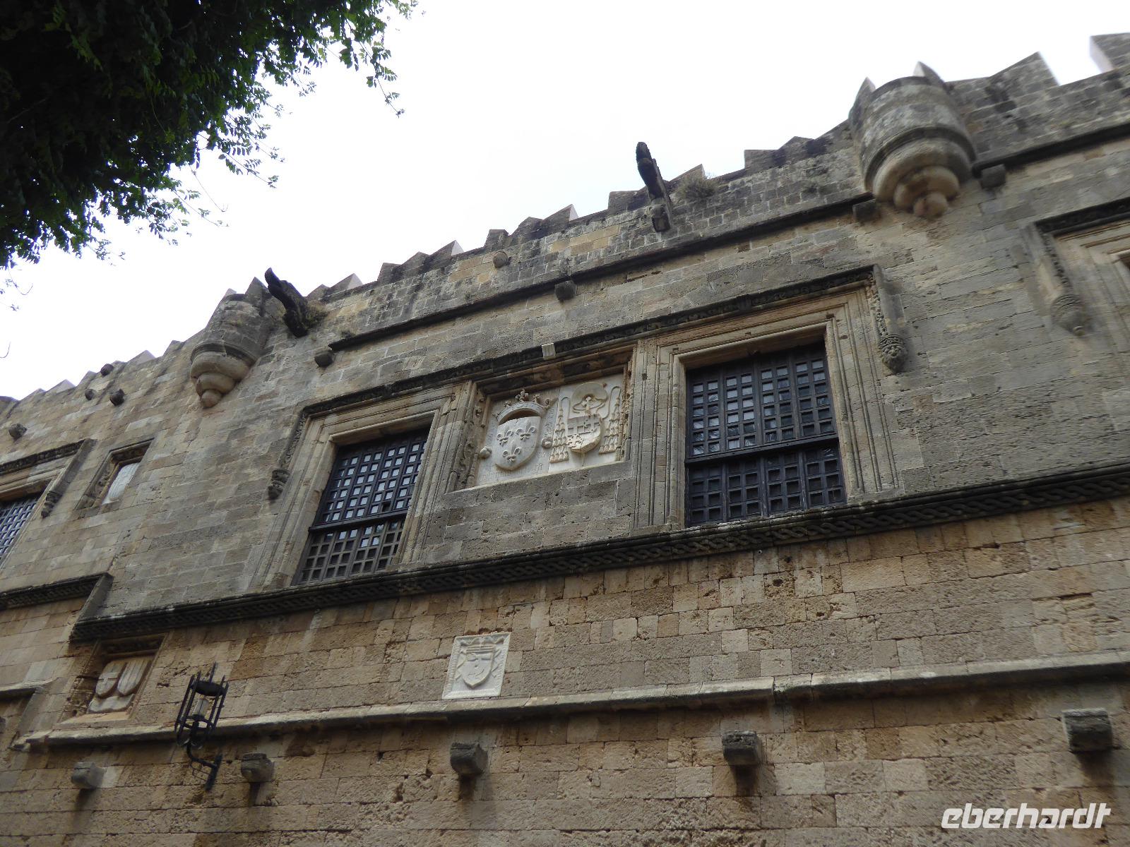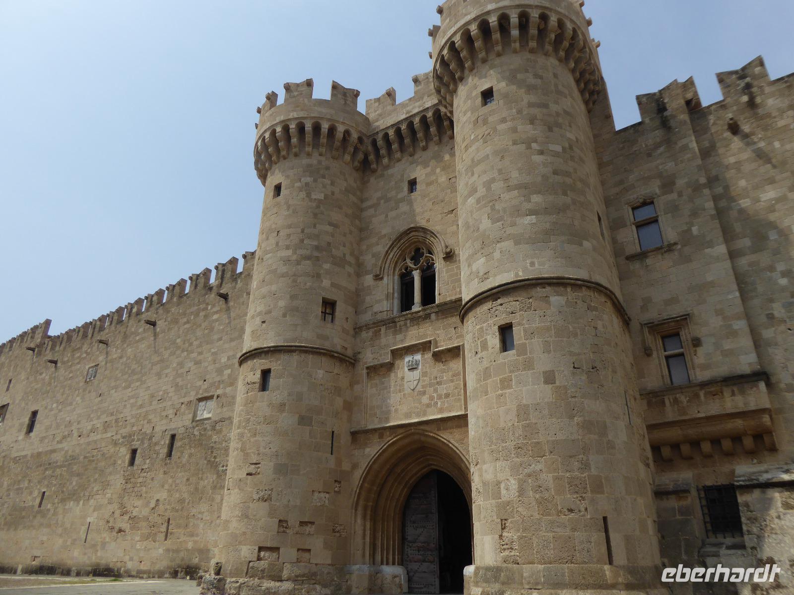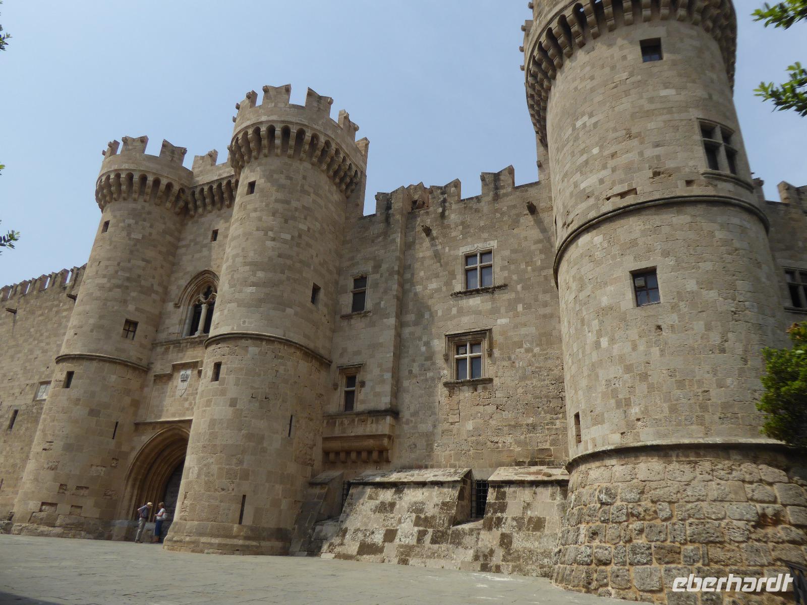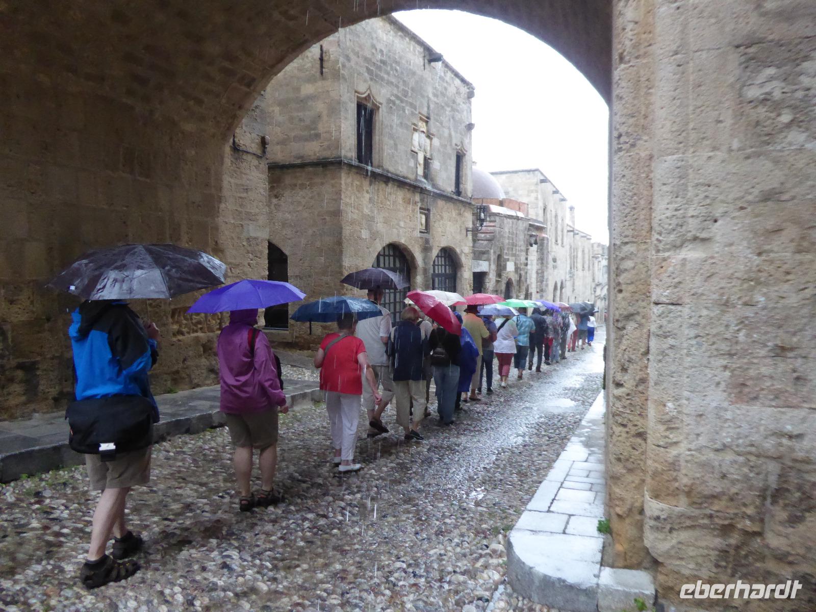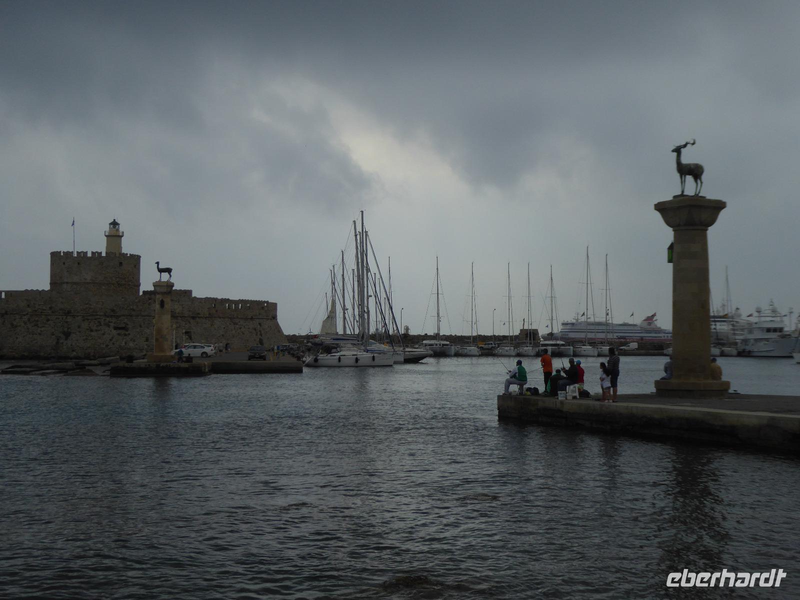 Nach einem ausgiebigen Frühstück beginnt unsere Fahrt zur Altstadt von Rhodos. Unseren ersten Stopp legen wir am Mandraki-Hafen ein. Von hier aus haben wir einen schönen Blick auf die drei mittelalterlichen Mühlen, die auf jeder Postkarte zu finden sind und auf den Hirsch und die Hirschkuh, die die Einfahrt zum Hafen flankieren. Unsere örtliche Reisleiterin Sabina, erzählt die Geschichte vom Koloss von Rhodos, der der Sage nach hier gestanden haben soll. Es ist jedem selbst überlassen, ob er/sie daran glaubt, dass es den Koloss jemals gegeben haben soll. Unsere Fahrt führt uns weiter zum höchsten Punkt der Stadt - der Akropolis. Akron bedeutet genau das - höchste Stelle der Stadt und so kommt es, dass fast jede griechische Stadt eine Akropolis hat. Diese hier ist ziemlich mager, nur drei Säulen konnten mühsam wiedererrichtet werden. Dafür gibt es ein gut restauriertes Stadion zu sehen, in dem der berühmte Faustkämpfer seiner Zeit (Mitte des 4. Jahrhunderts v. Chr.) Diagoras trainiert haben soll. Heute ist sogar der Flughafen von Rhodos nach ihm benannt. Uns verfolgt nun etwas sehr Ungewöhnliches auf Rhodos - nämlich Regen. Der Himmel ist grau und es donnert kräftig vor sich hin. Und es dauert nicht lange bis der Himmel seine Schleusen öffnet und die Regenschirmverkäufer gute Geschäfte machen. Wir spazieren durch die Altstadt, am Großmeisterpalast vorbei bis zum Platz der Museen. Von hier aus kann nun jeder in Eigenregie entscheiden, ob er sich zunächst der guten griechischen Küche widmet oder doch erst das Kulturprogramm mittels Museumsbesuch fortsetzt. Bald schon hört es auf zu regnen und wir können bei schönstem Sonnenschein noch einmal durch die Gassen bummeln. Am Abend lädt uns unser Reiseveranstalter Eberhardt zu einem Ouzu an der Poolbar ein.